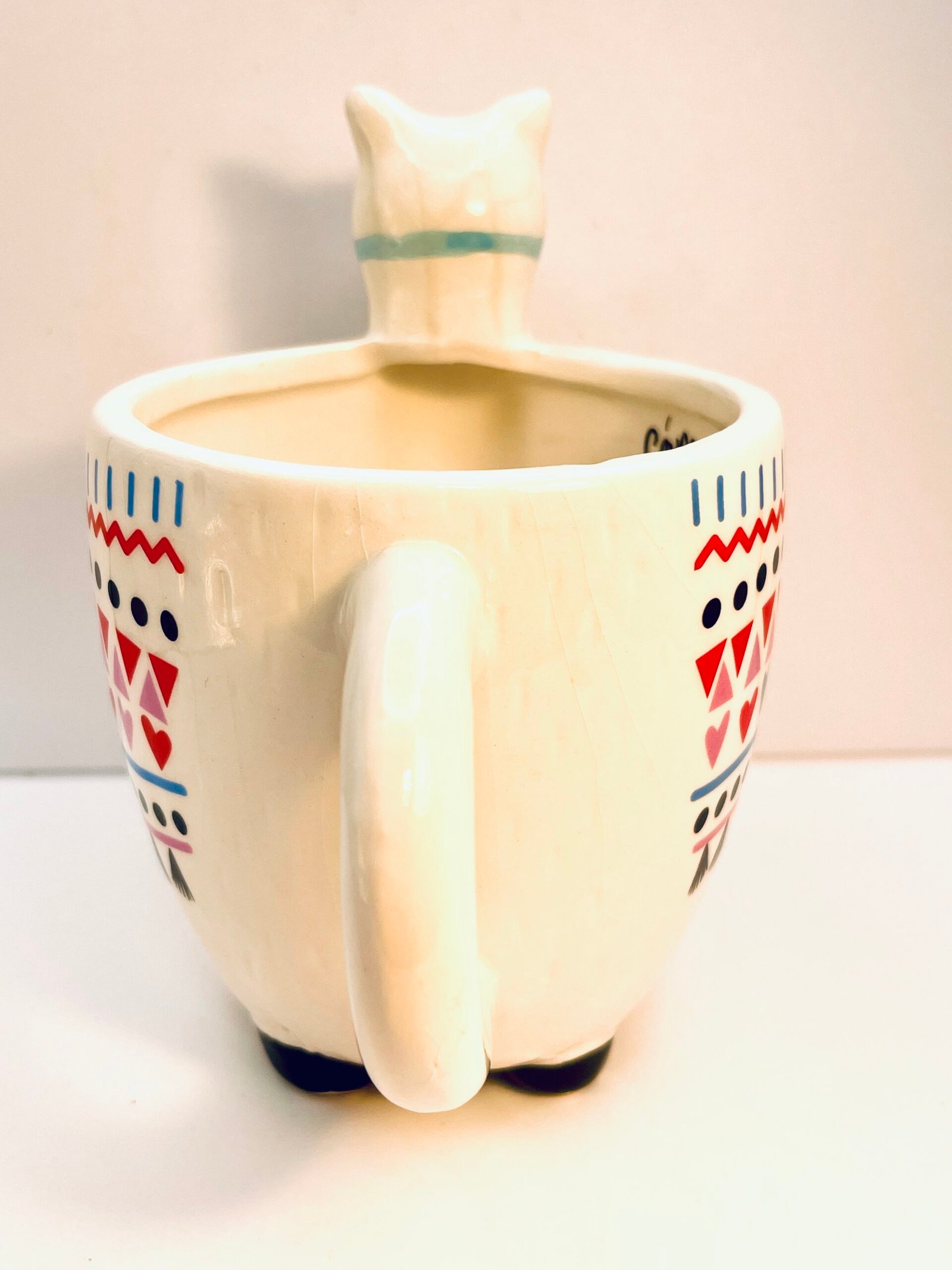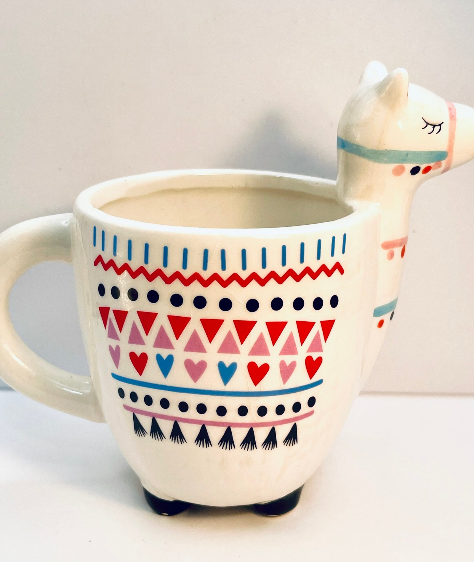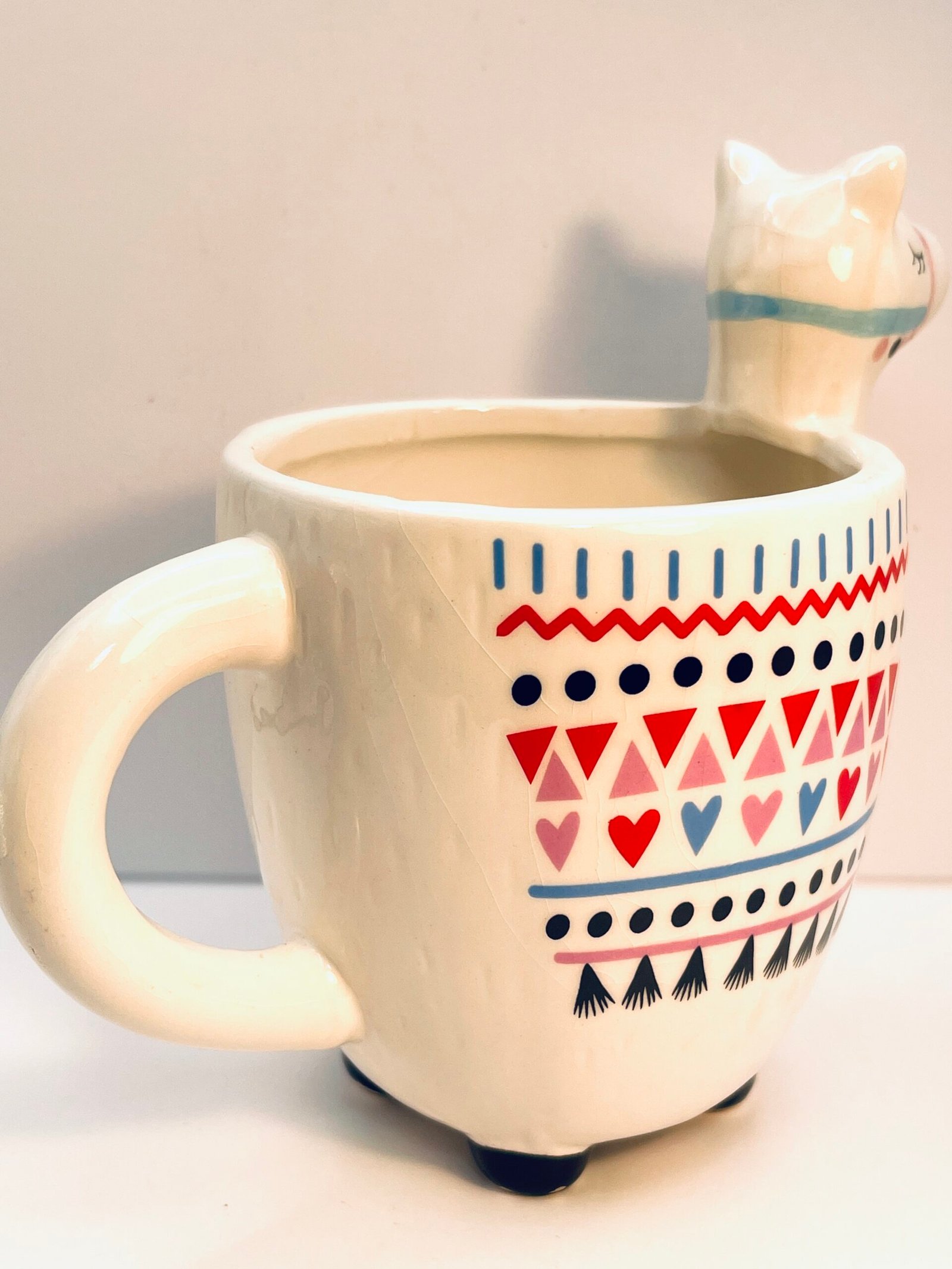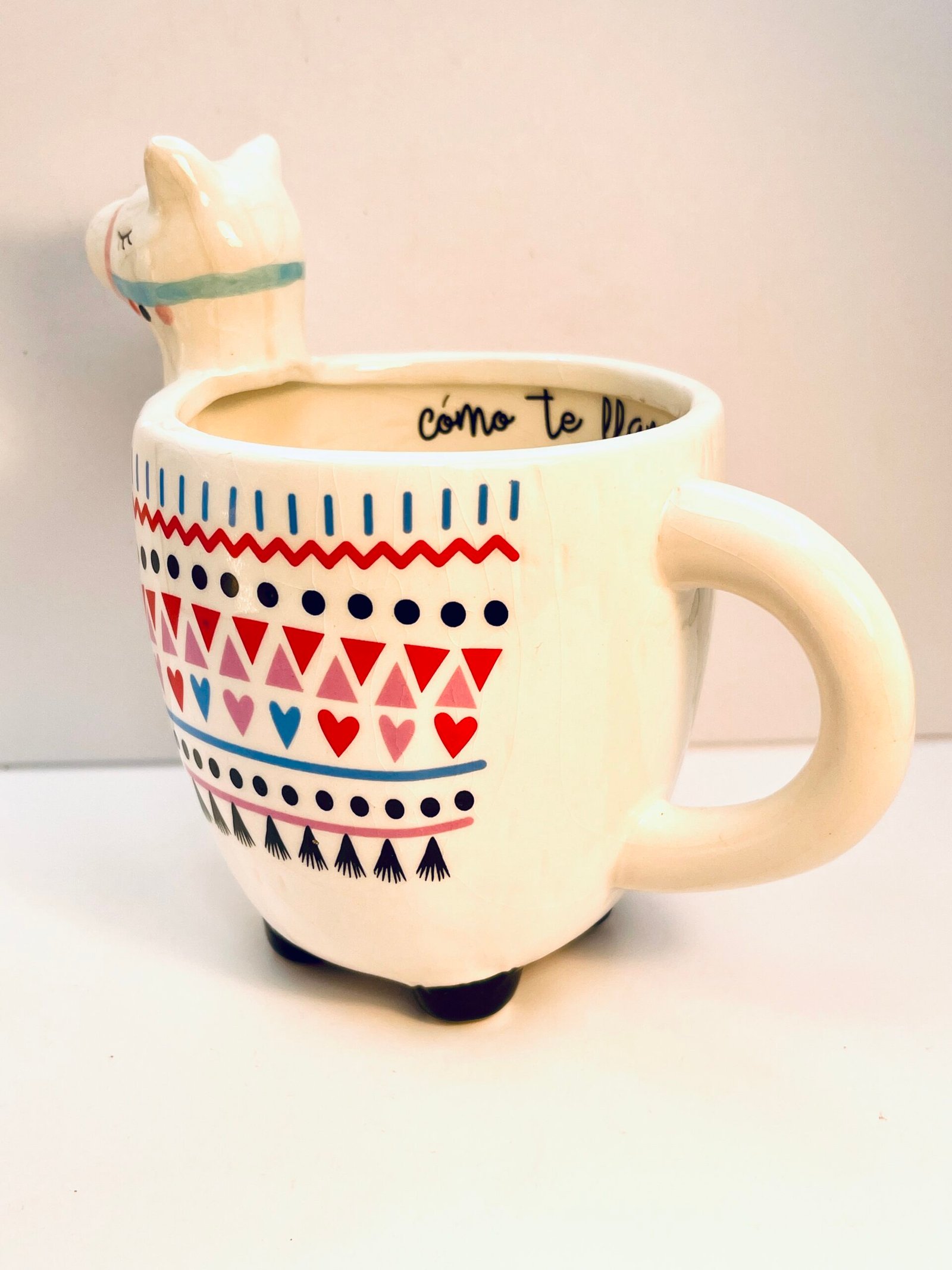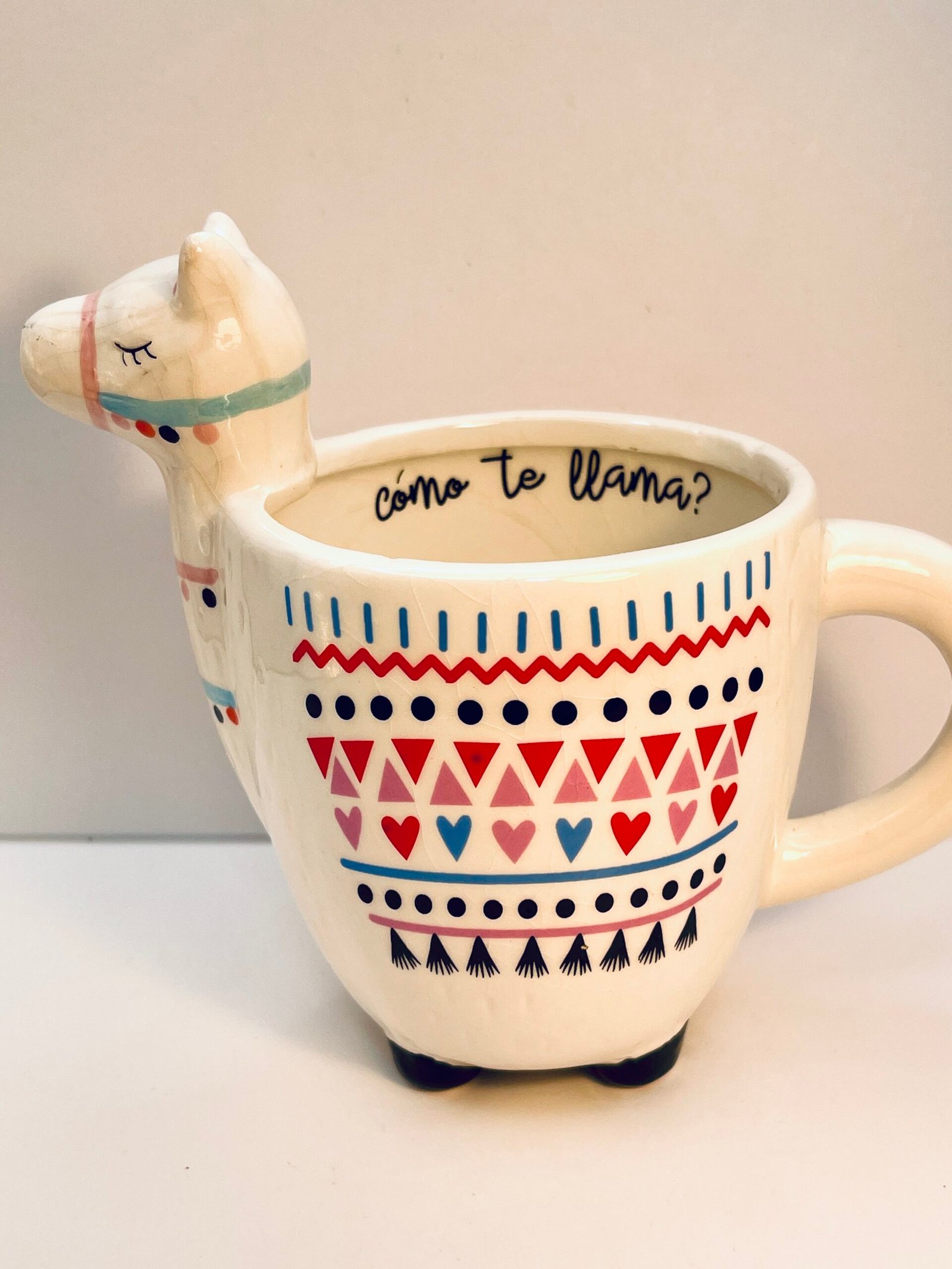 Cómo Te Llama Ceramic Mug Magic features a delightful 3D llama design complete with a sculpted head, hooves. And a vibrant folk-art-inspired pattern bursting with color and personality.