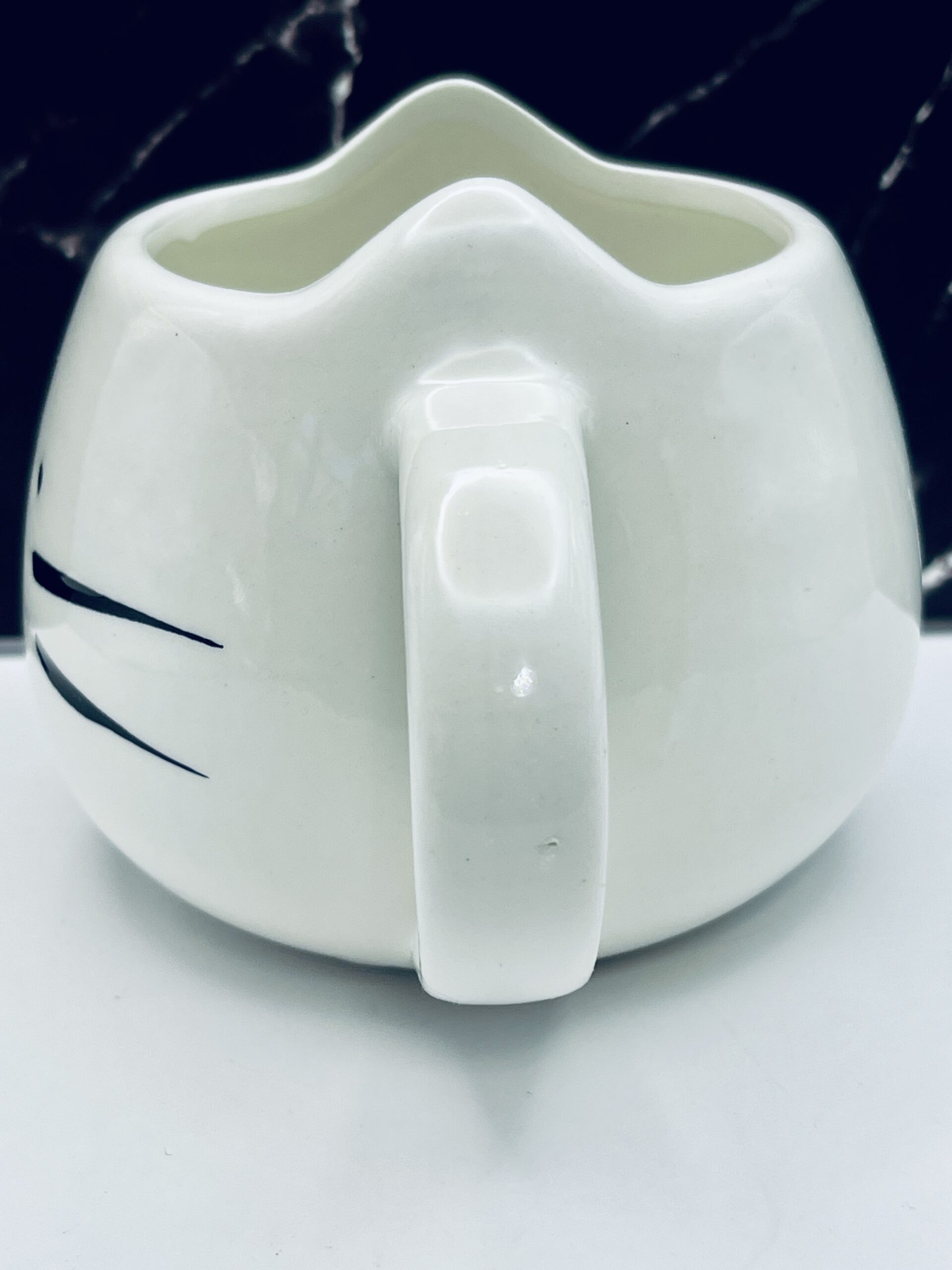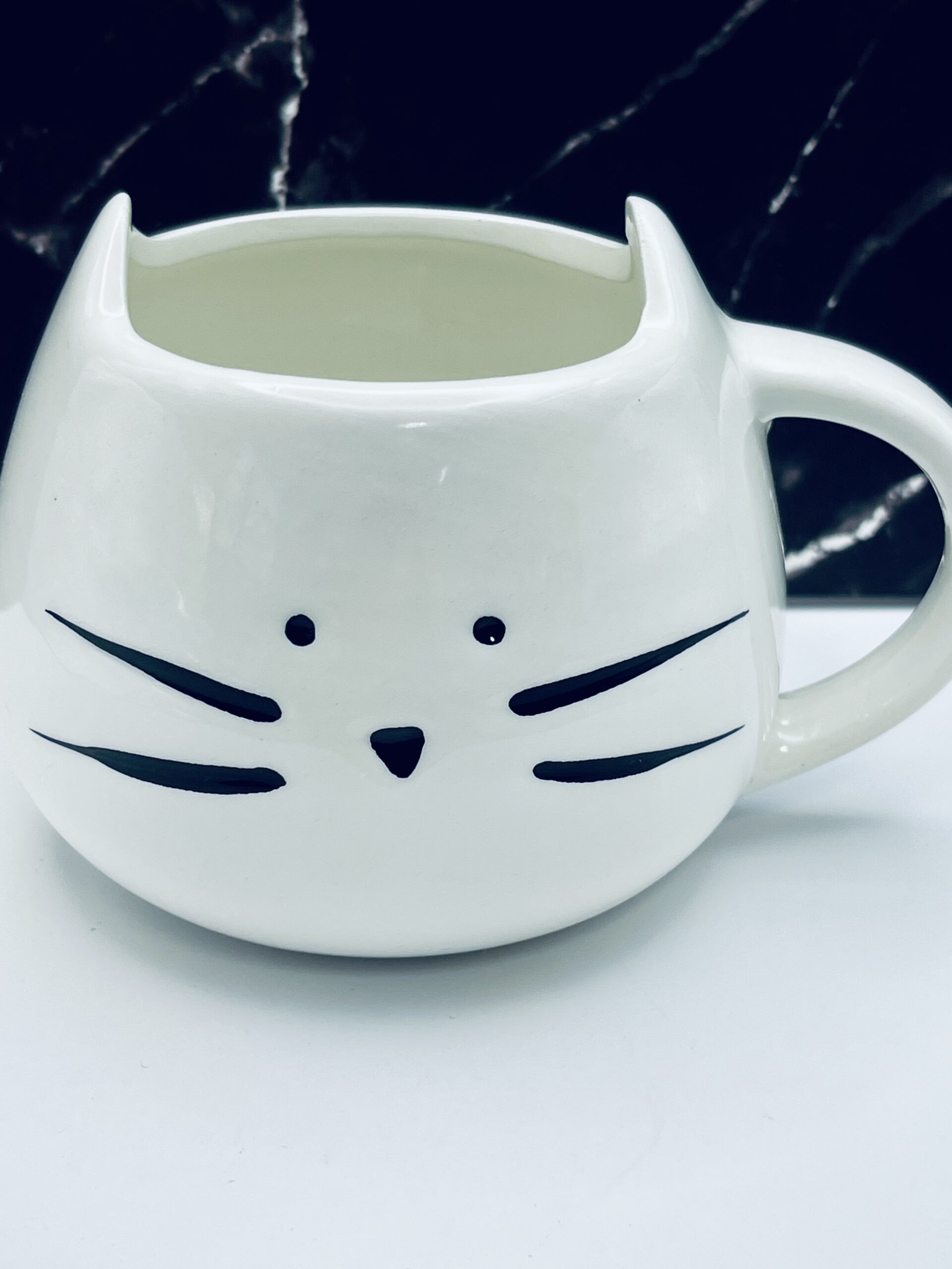 Indeed this 12-ounce mug features a stylized white cat design with ears, eyes, whiskers, and a handle on the side.