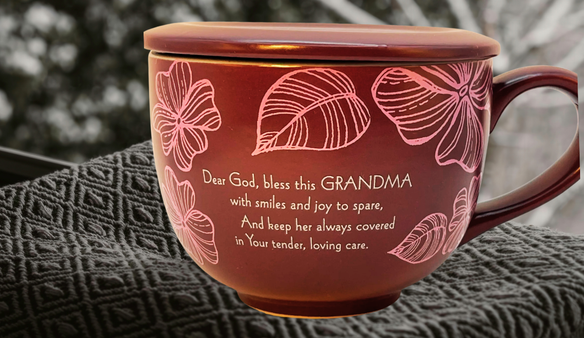 Meanwhile, the message A Prayer for Grandma appears on one side of the mug, while the other side shares a heartfelt blessing: