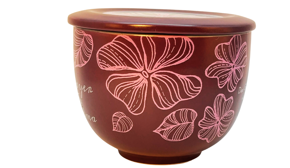 In this case, the soft floral illustrations wrap around the mug in delicate pink line art, creating a gentle botanical pattern against the deep maroon glaze. Meanwhile, the prayer message celebrates the love and care that grandmothers bring to their families.
