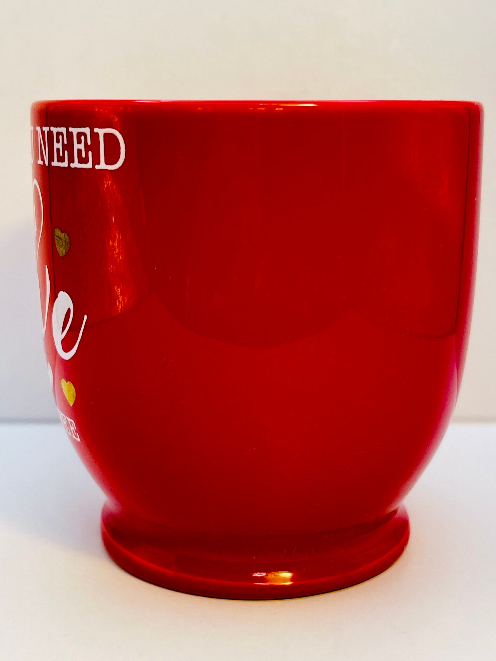 The phrase “ALL YOU NEED IS Love & COFFEE” stands out clearly against the red background. White and gold-toned accents add contrast without overwhelming the design.