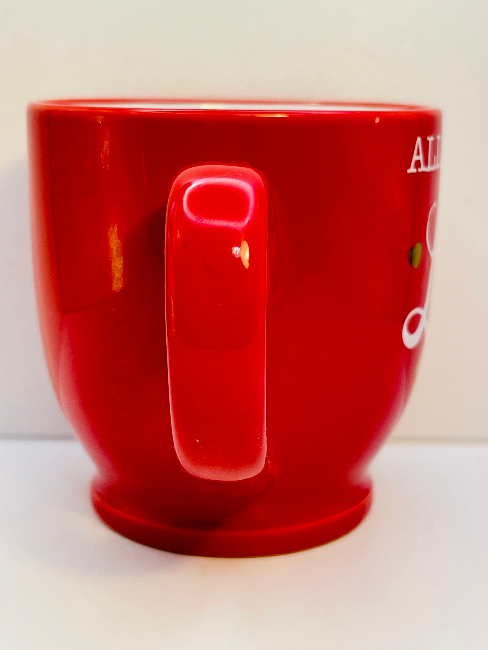 This mug appears to be a red ceramic coffee mug with a heart-shaped handle. The bright red exterior creates a bold, cheerful look, while the glazed metallic lettering adds a subtle shine.