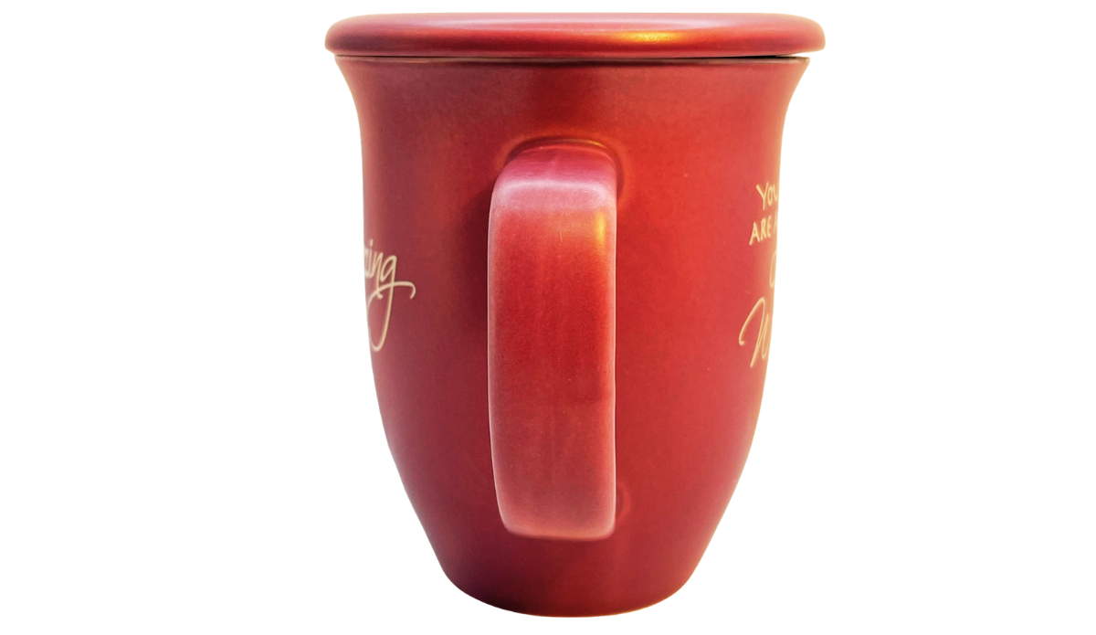 This ceramic mug features a rich berry red exterior with elegant script lettering on the front. Meanwhile, the matching ceramic lid adds both visual balance and practical function. Together, the smooth finish, warm color, and uplifting message create a polished and meaningful design.