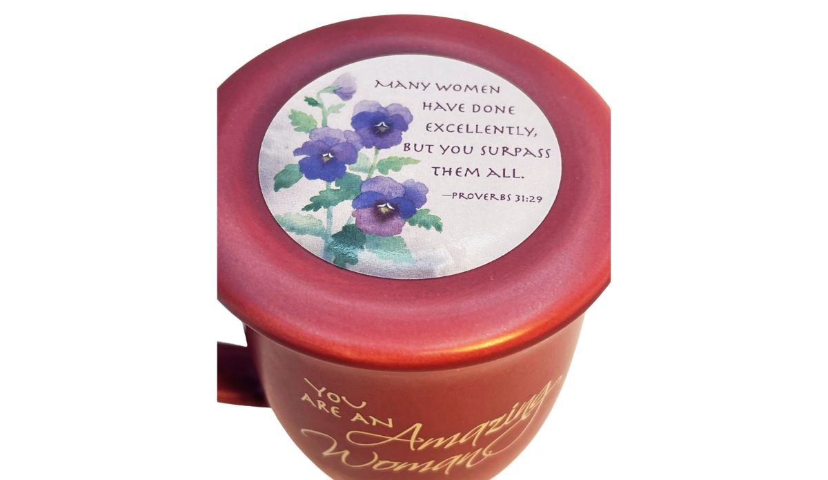 Because of its rich berry finish, uplifting message, and matching scripture lid, this mug blends inspiration with everyday usefulness.