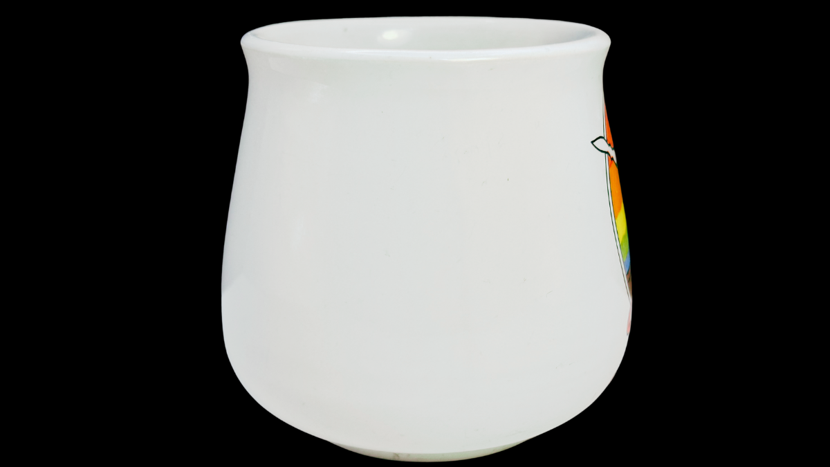 • Rounded ceramic mug shape with curved handle