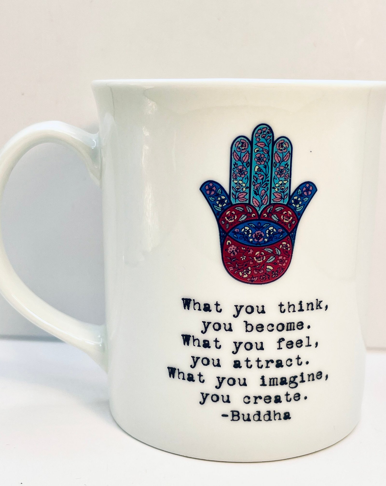 In fact featuring an intricate Hamsa hand and a timeless Buddha quote. This mug is more than just drinkware. It’s a reminder that your thoughts, feelings, and imagination shape your reality.