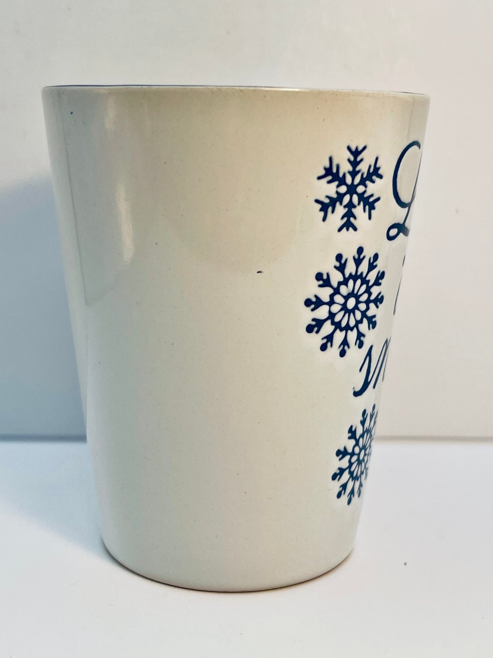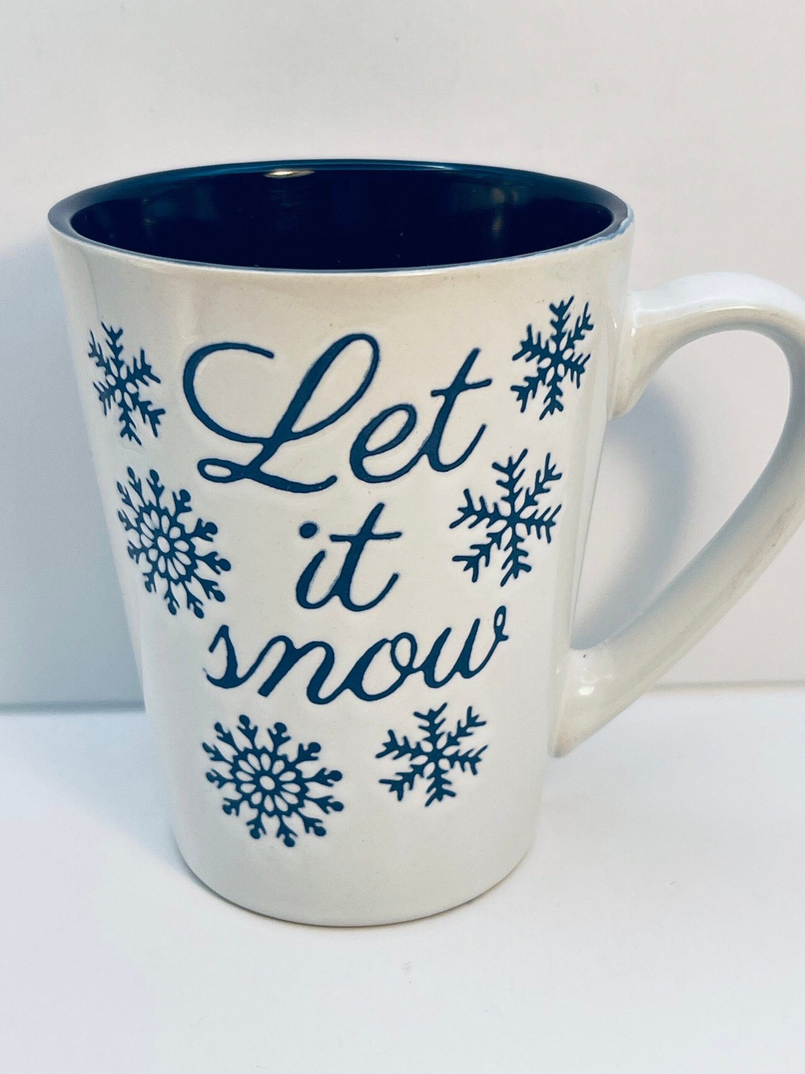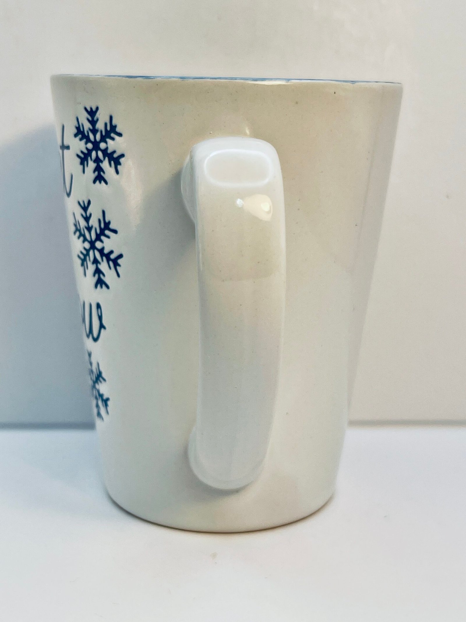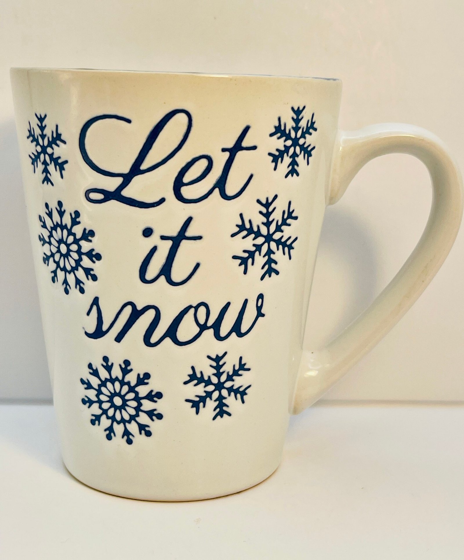 This mug appears to be a ceramic coffee mug from California Pantry. The exterior features blue snowflake designs paired with the phrase “Let it snow,” creating a clean and classic winter look.