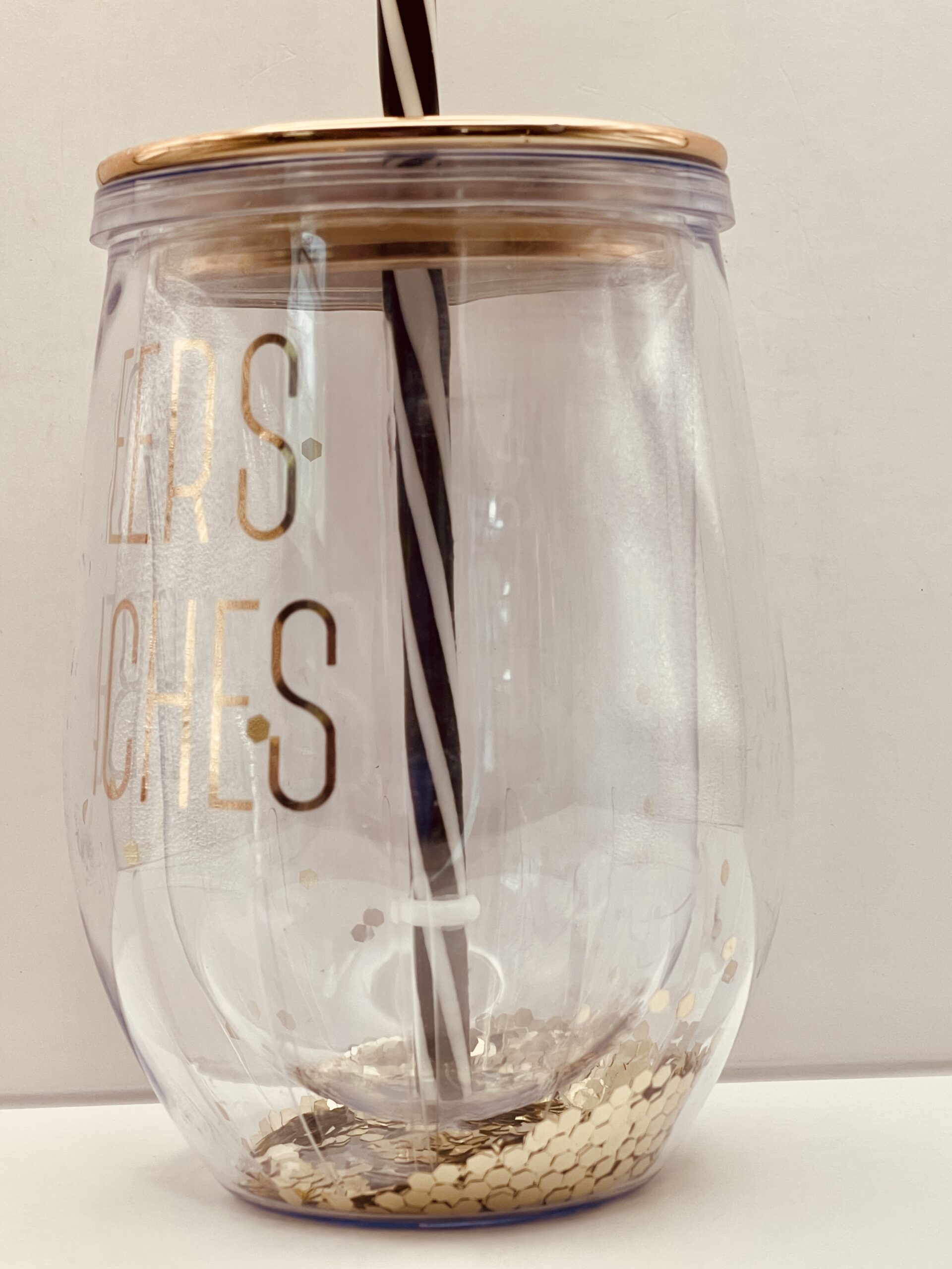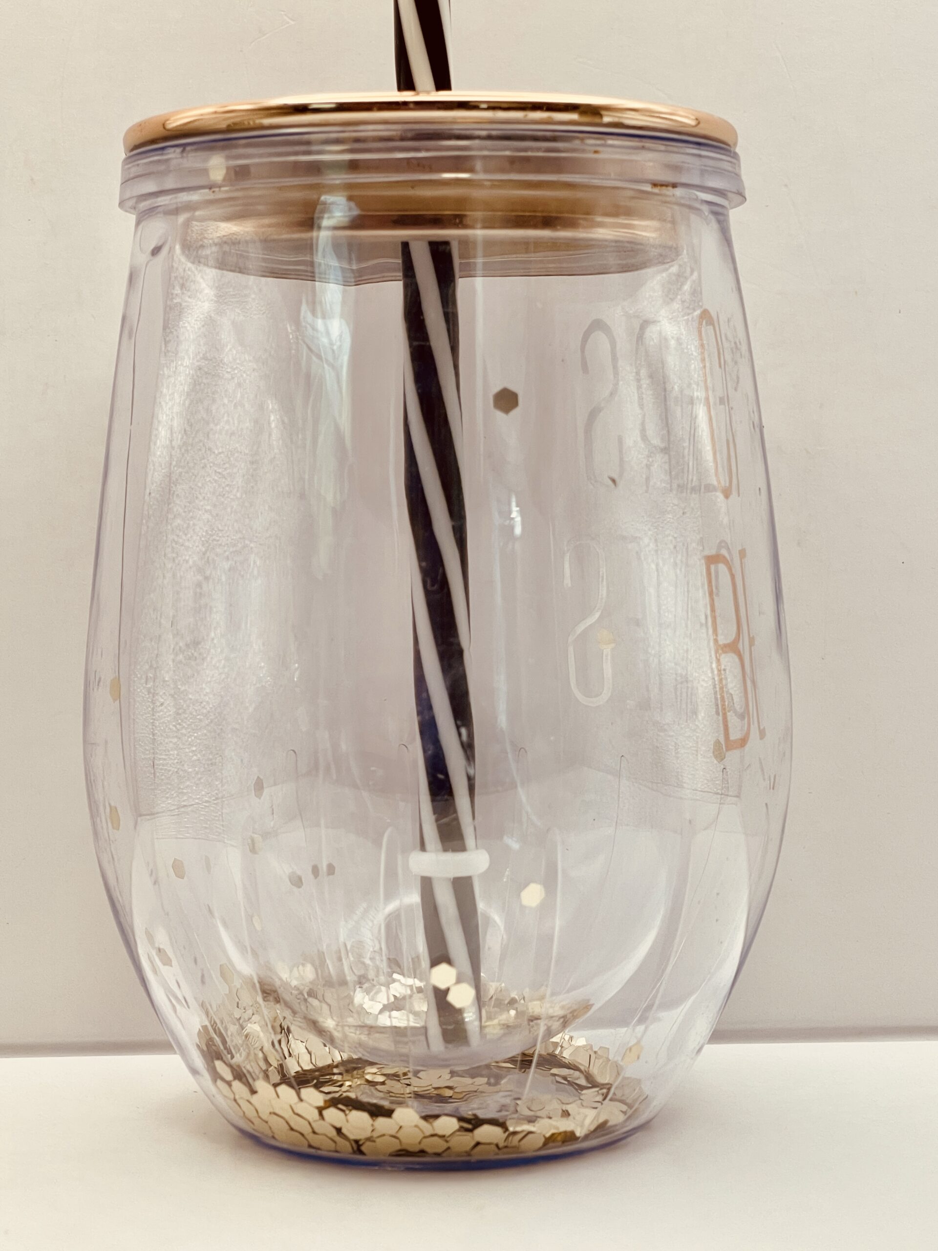 While inside, the tumbler holds a stemless wine glass shape filled with dazzling gold glitter. It catches the light beautifully. Especially making every drink feel like a celebration.
