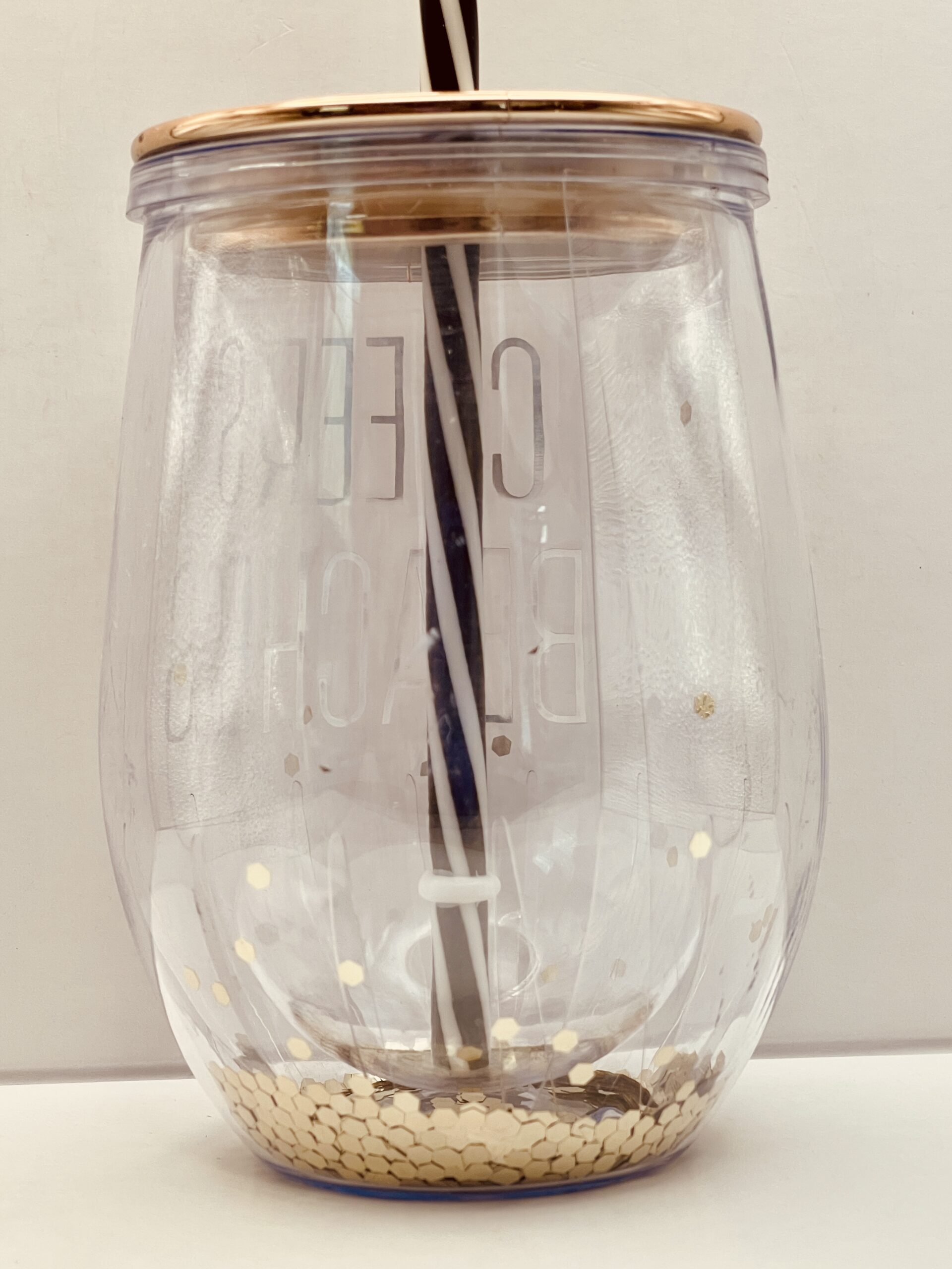 In fact the Cheers Beaches Glitter Stemless Tumbler features a unique double-walled design. With a clear outer wall showcasing the playful gold lettering “CHEERS BEACHES.”
