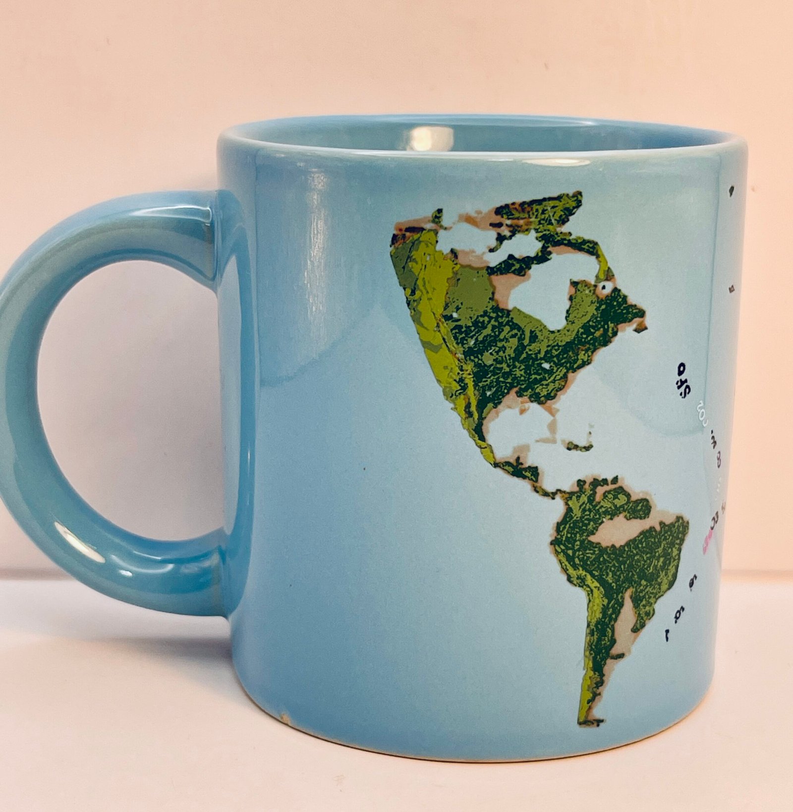 This climate change heat mug is made by The Unemployed Philosophers Guild and crafted from ceramic. When the mug is cool, it displays a standard world map.