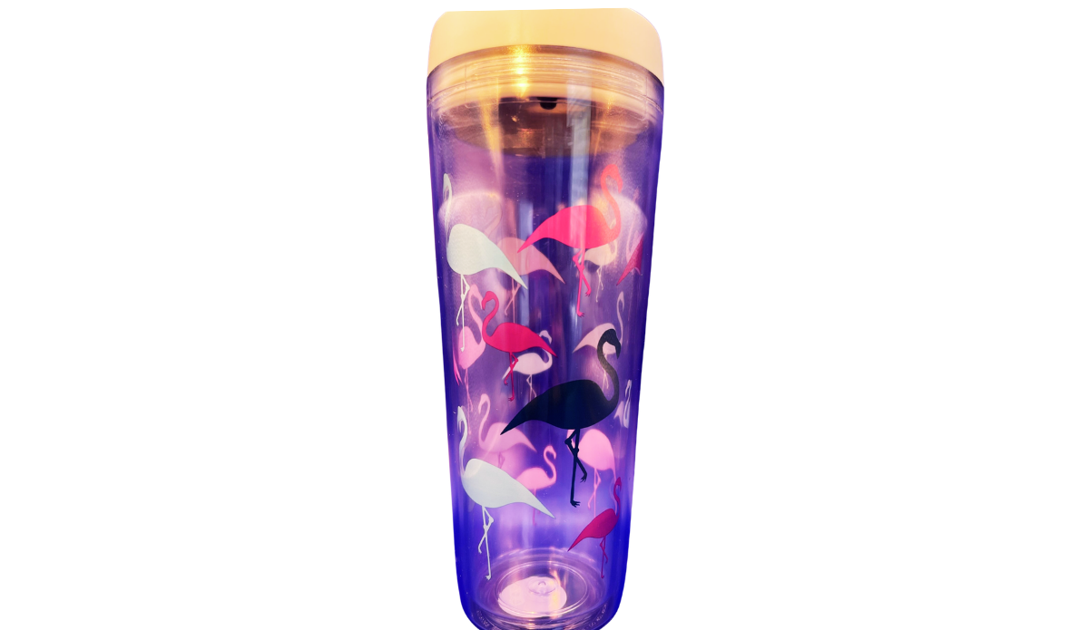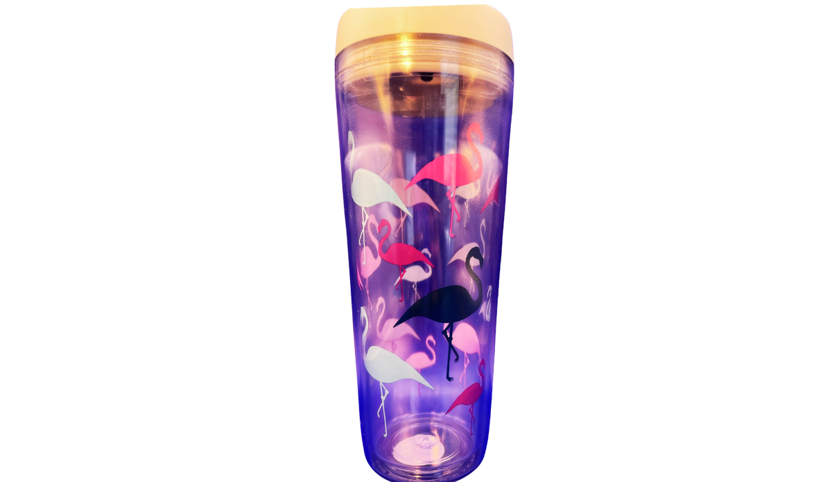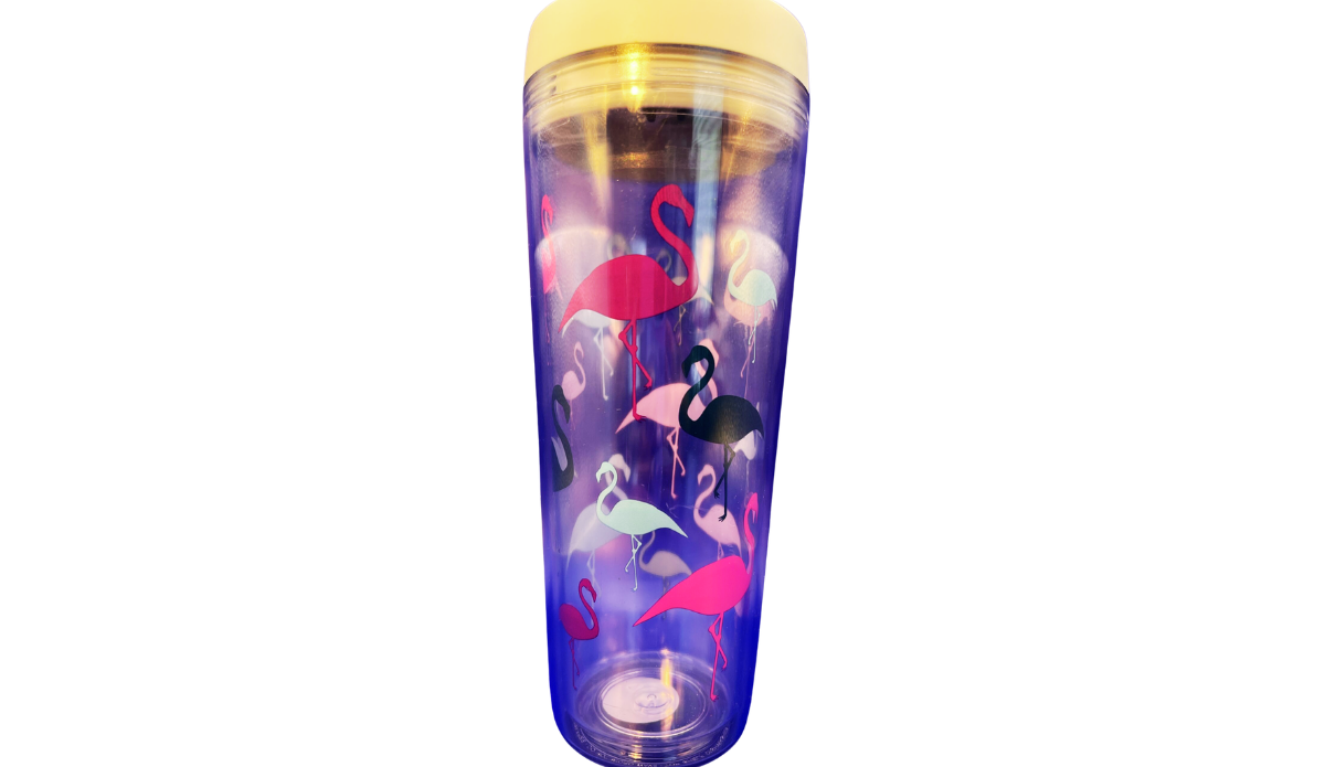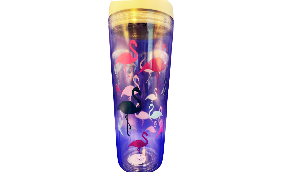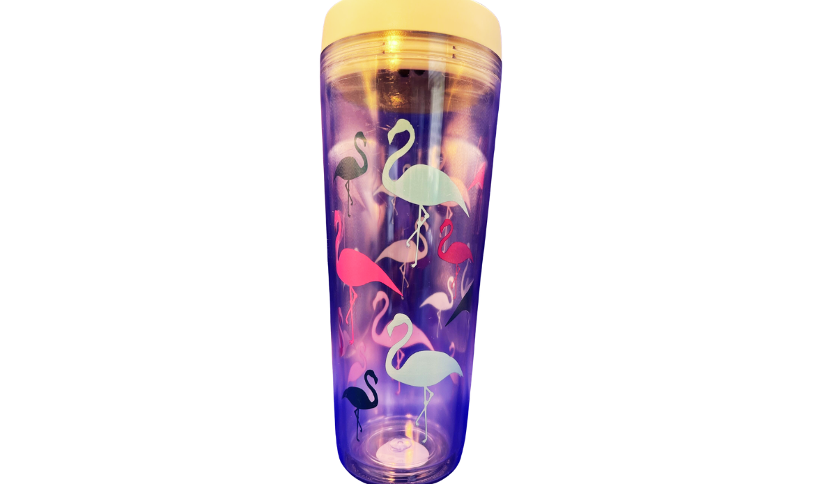 This tumbler features a tall, double-wall acrylic body with a clear finish. The wraparound flamingo design stays the focal point.