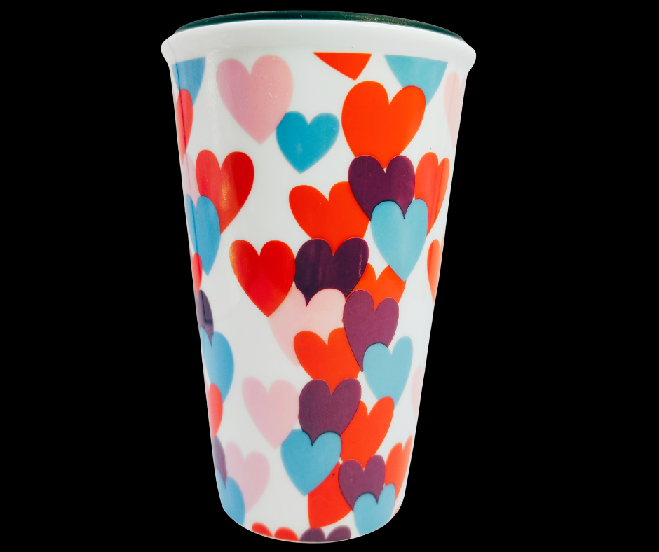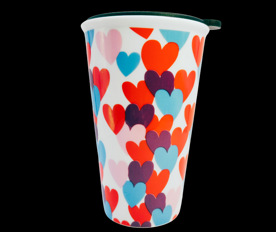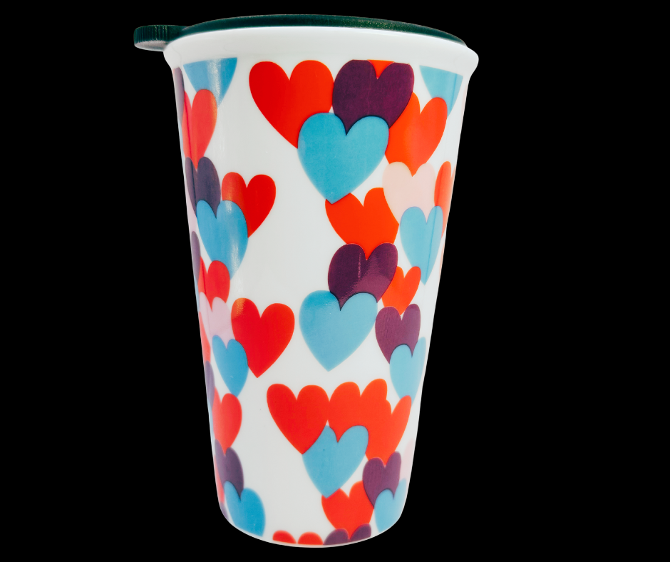 This travel mug features an all-over colorful heart pattern and a fitted plastic lid designed to help reduce spills.