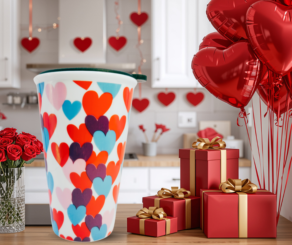With its playful rows of multicolor hearts and spill-resistant lid, it brings a cheerful, romantic feel to everyday routines—whether you’re heading out the door or settling in for a slow morning.