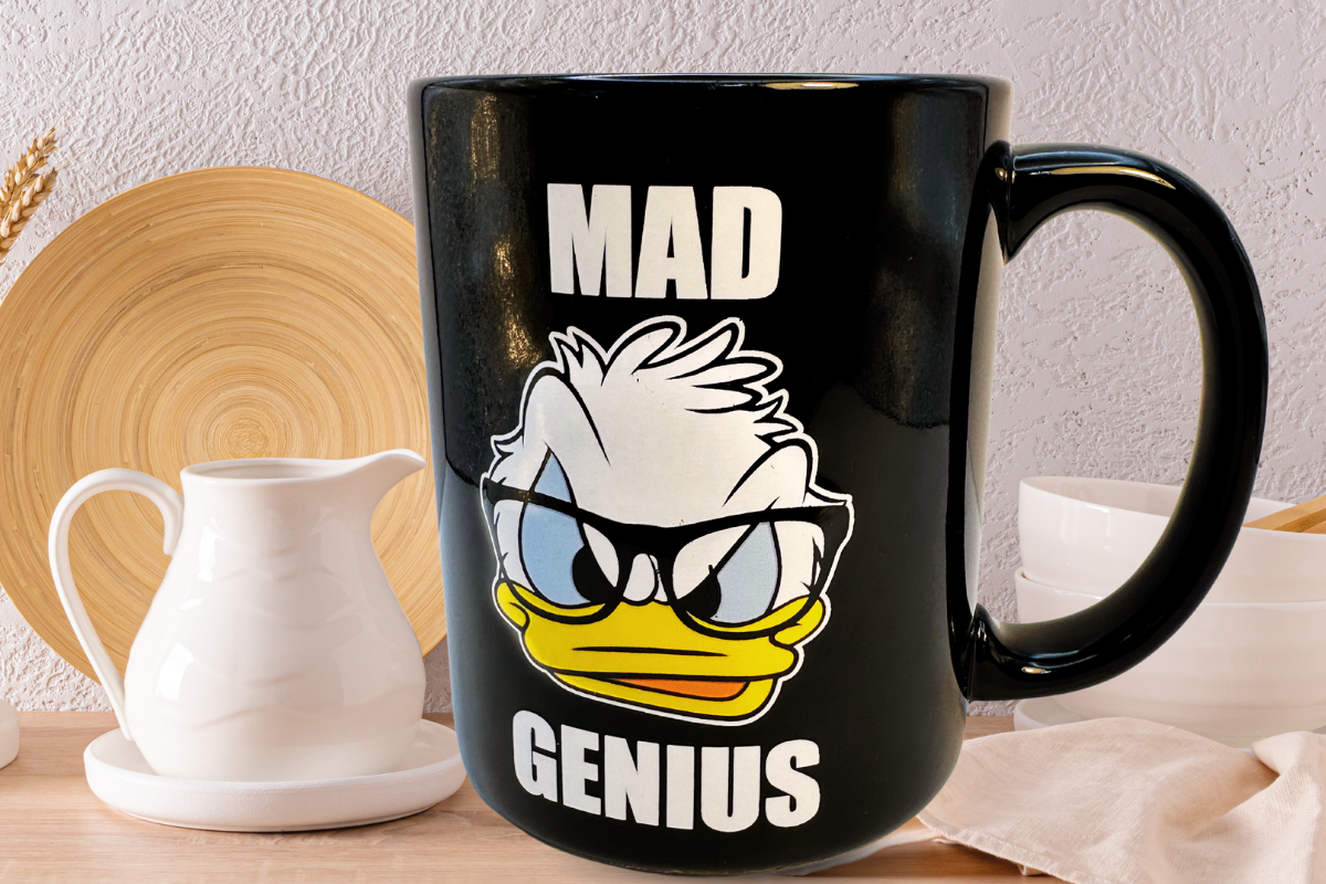 This mug feels special because it captures Donald Duck in his “Mad Genius” era, complete with glasses and an expressive pose. As a result, it feels playful, bold, and unmistakably Disney.