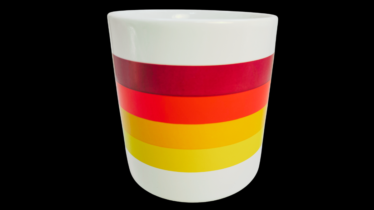 This mug features the original EPCOT Center logo placed inside a white badge on the front of the mug. Meanwhile, warm horizontal color bands wrap around the mug body and create the retro stripe design.