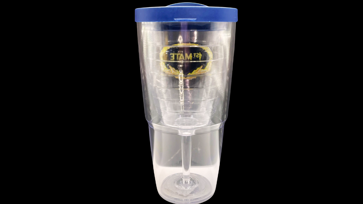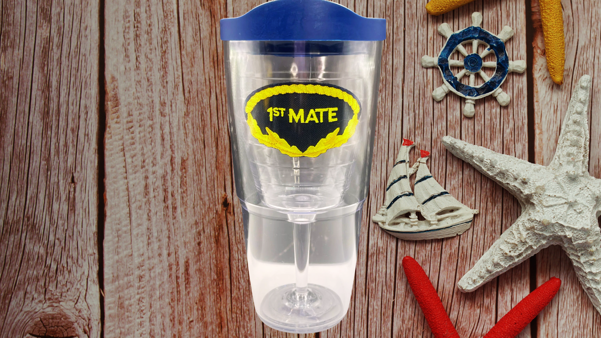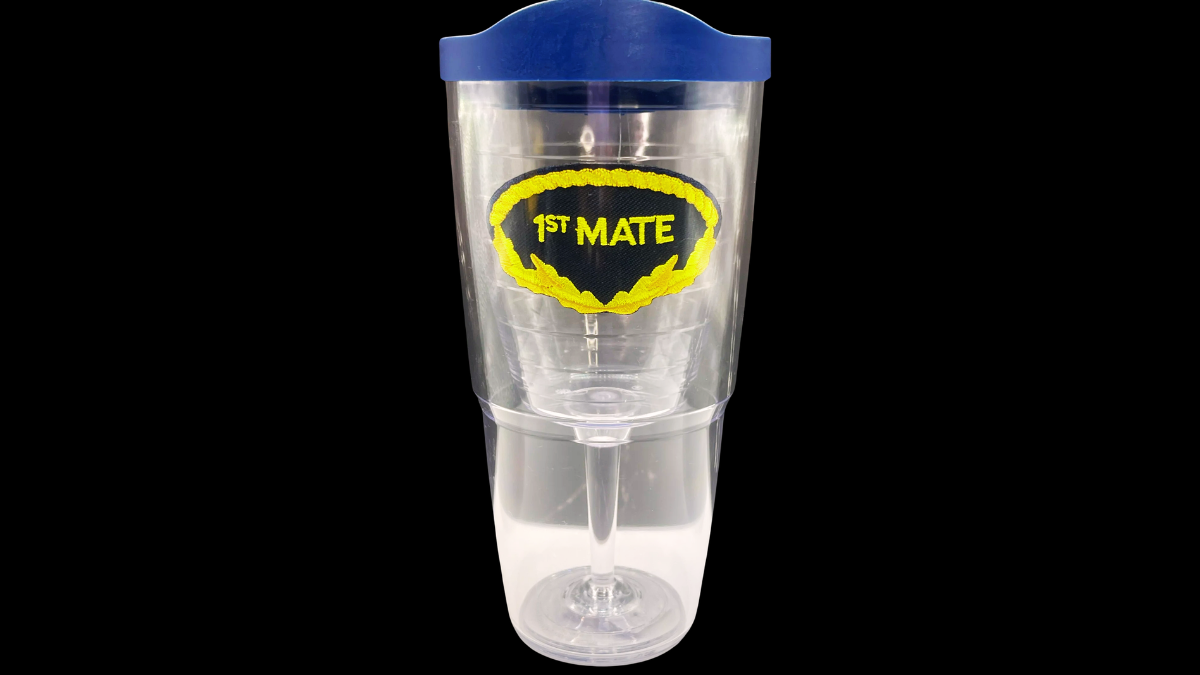 Tervis drinkware is known for durable construction and reliable insulation. Because of that reputation, this First Mate edition pairs specialty design with trusted performance. In particular, the bold “1ST MATE” crest framed in a yellow nautical laurel immediately sets a confident, sea-ready tone. At the same time, the built-in wine glass interior gives it a distinctive shape that separates it from a standard tumbler.