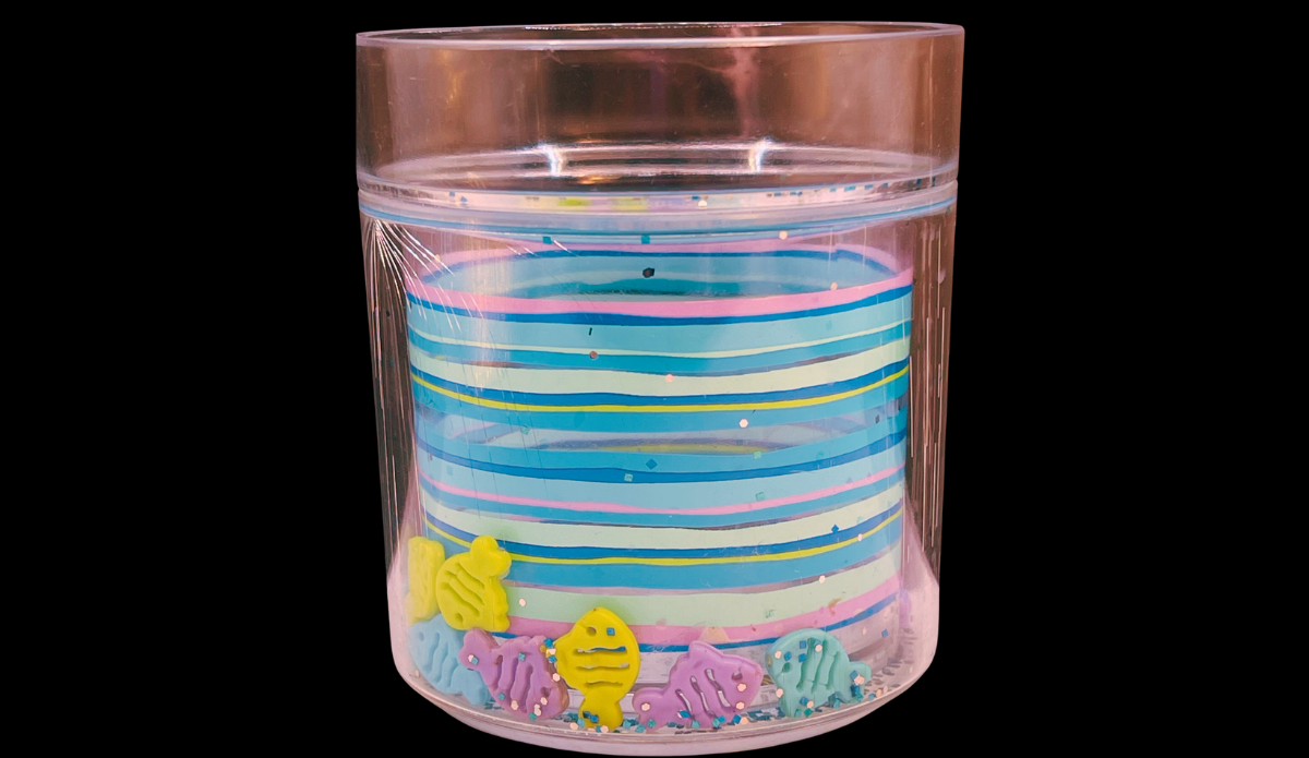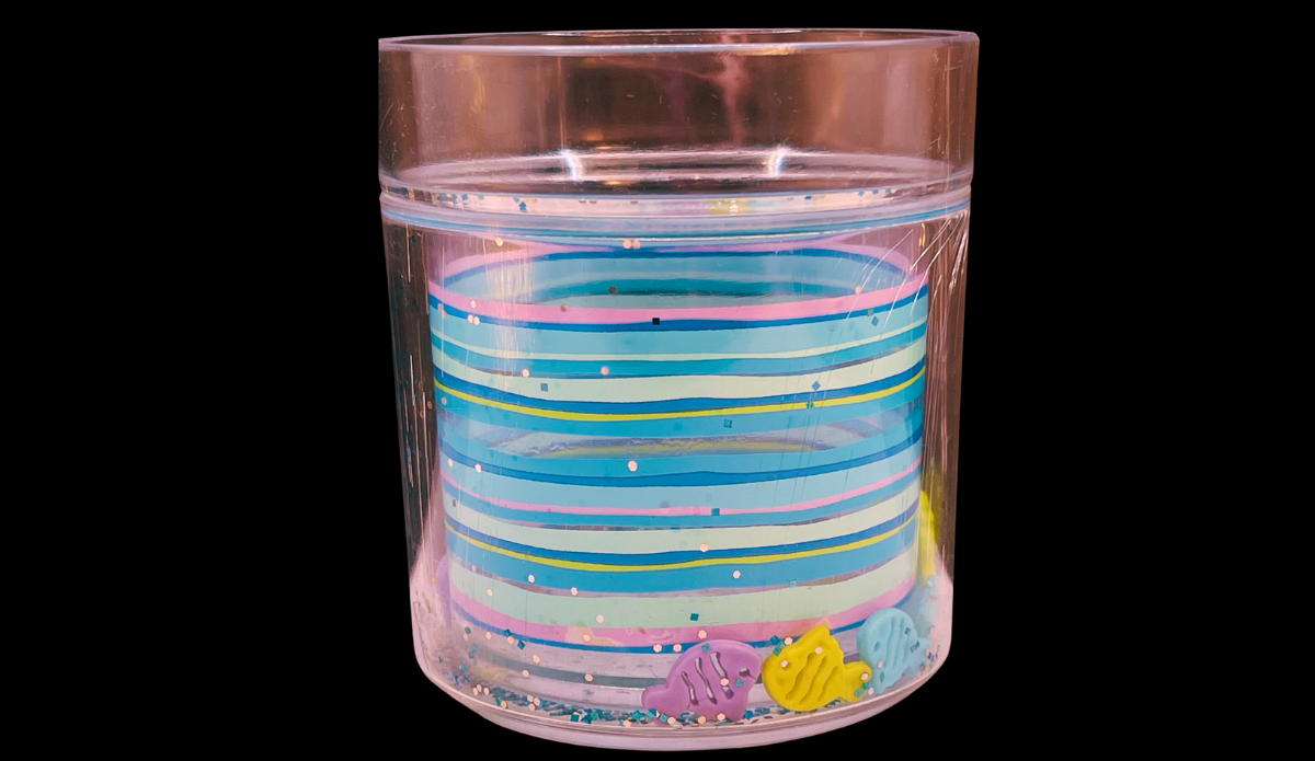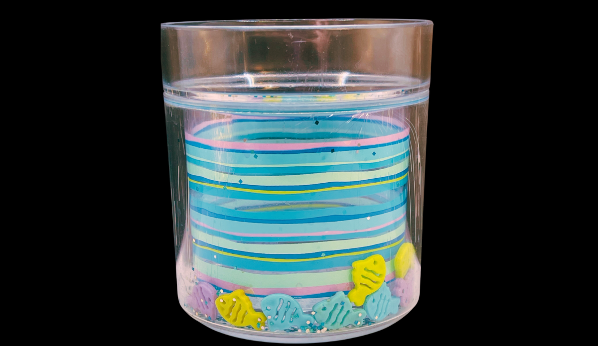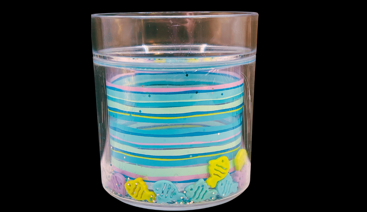 This tumbler features a sealed double-wall construction that allows small fish to move freely inside. As a result, the fish shift and glide as you tilt the glass. At the same time, this creates the illusion of fish swimming in water.