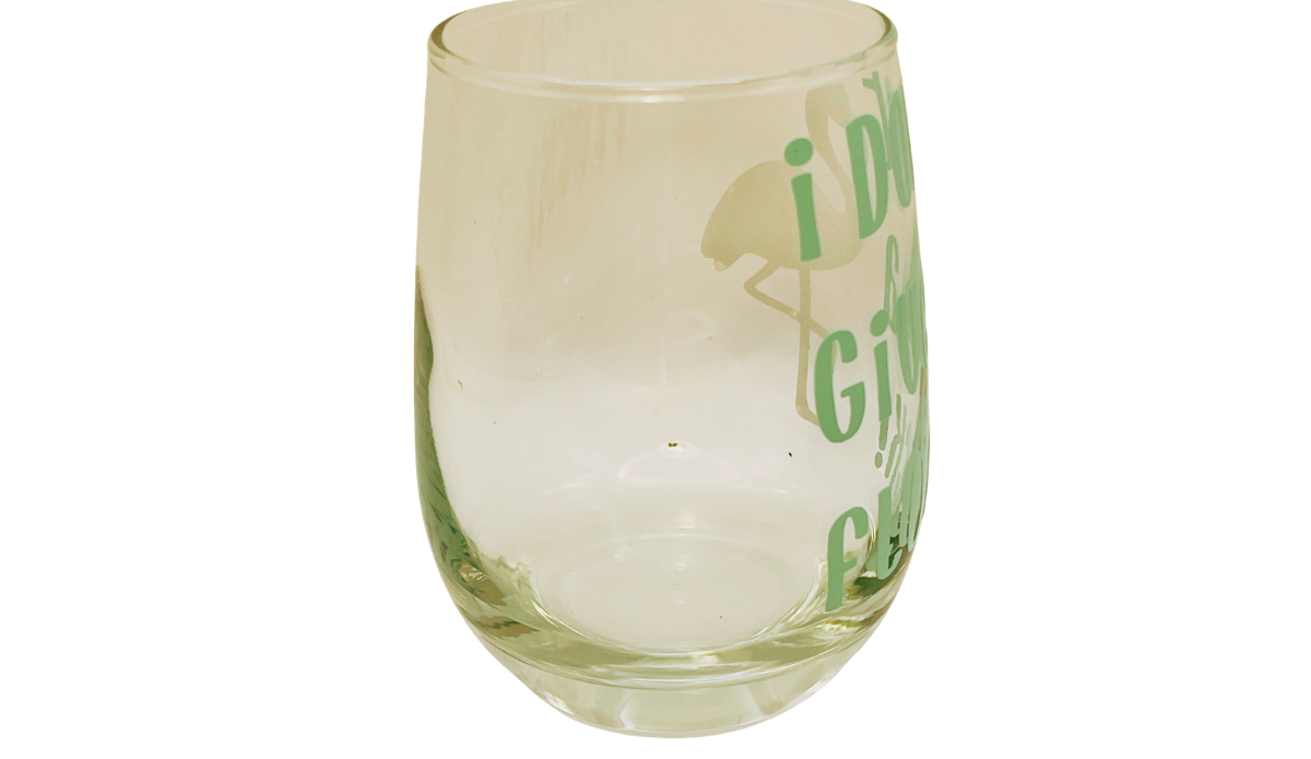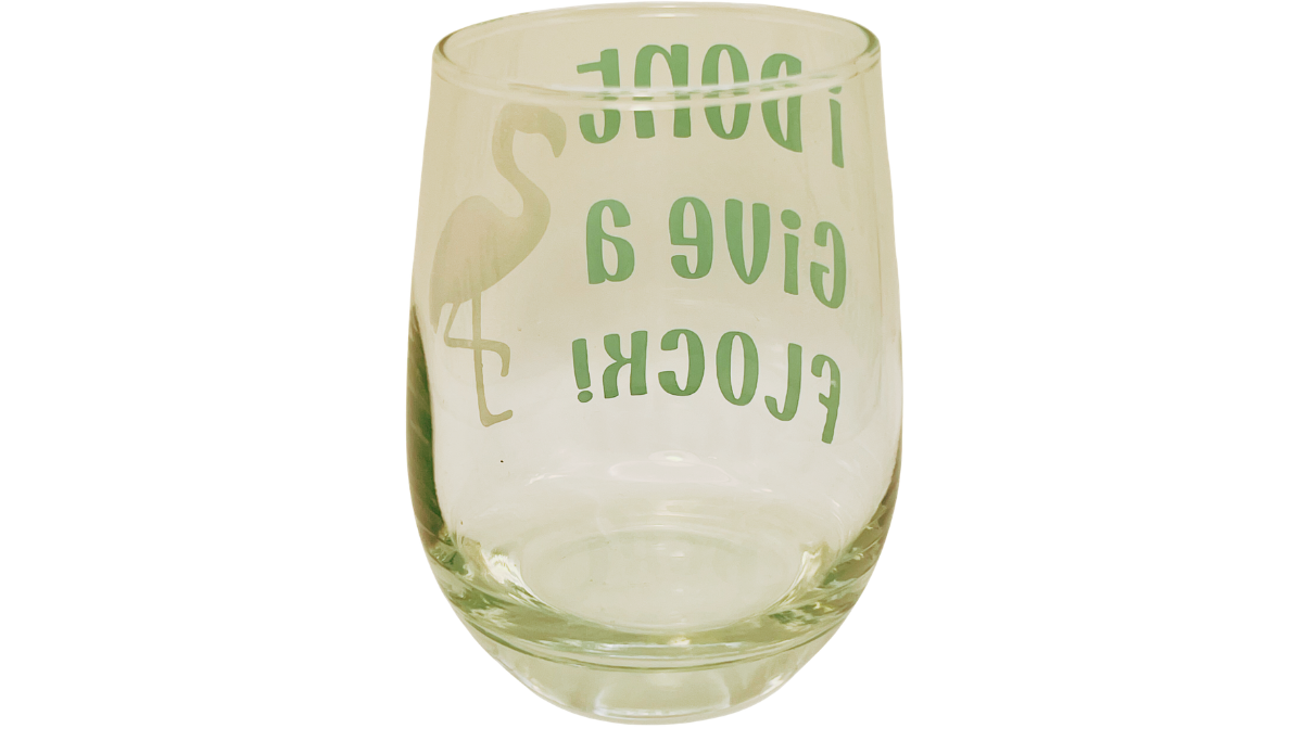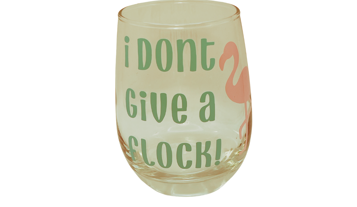 This stemless wine glass features a clear body with a soft warm tint. The front displays the phrase I Dont Give A Flock in light green lettering. Alongside it, a pink flamingo adds a clean visual accent.
