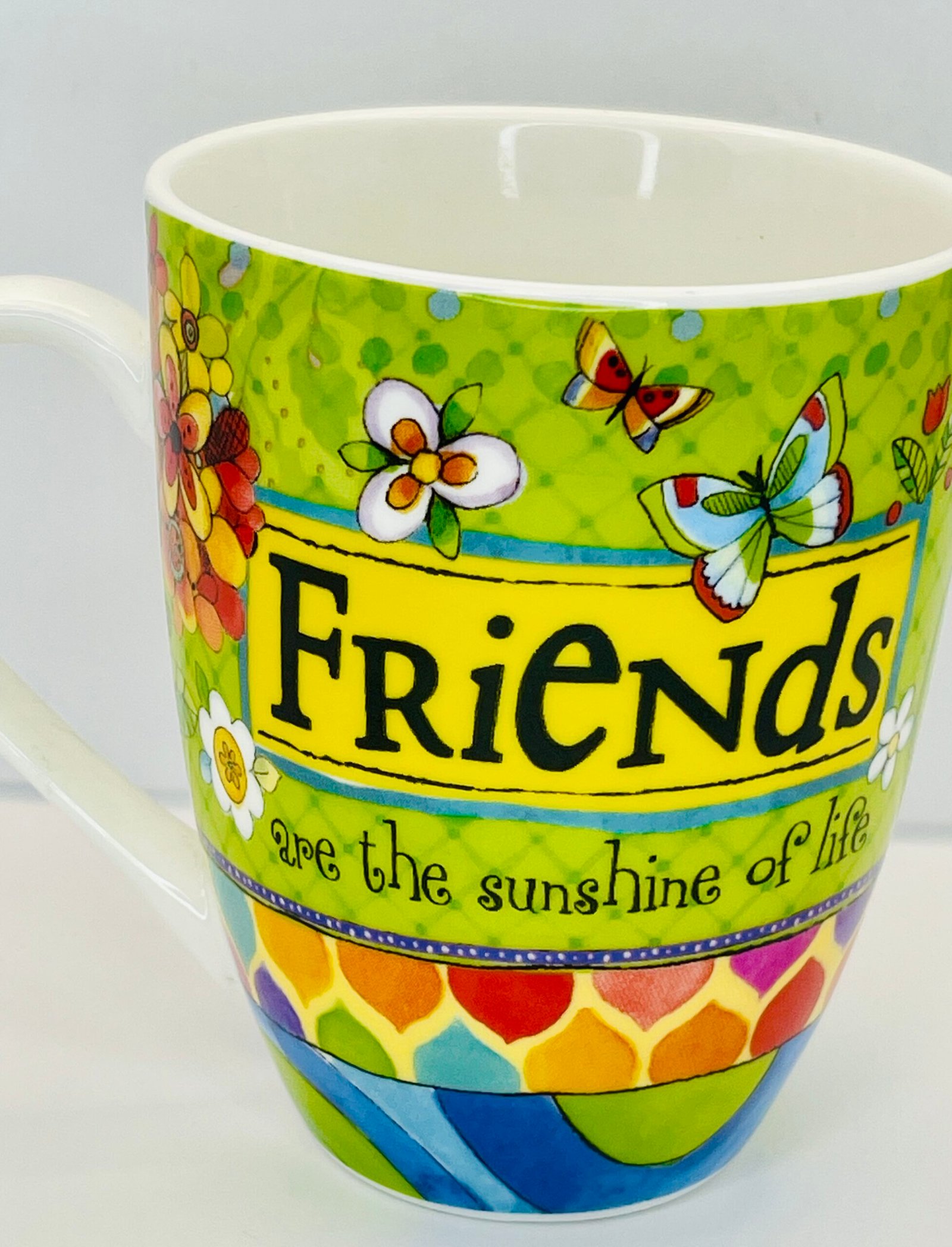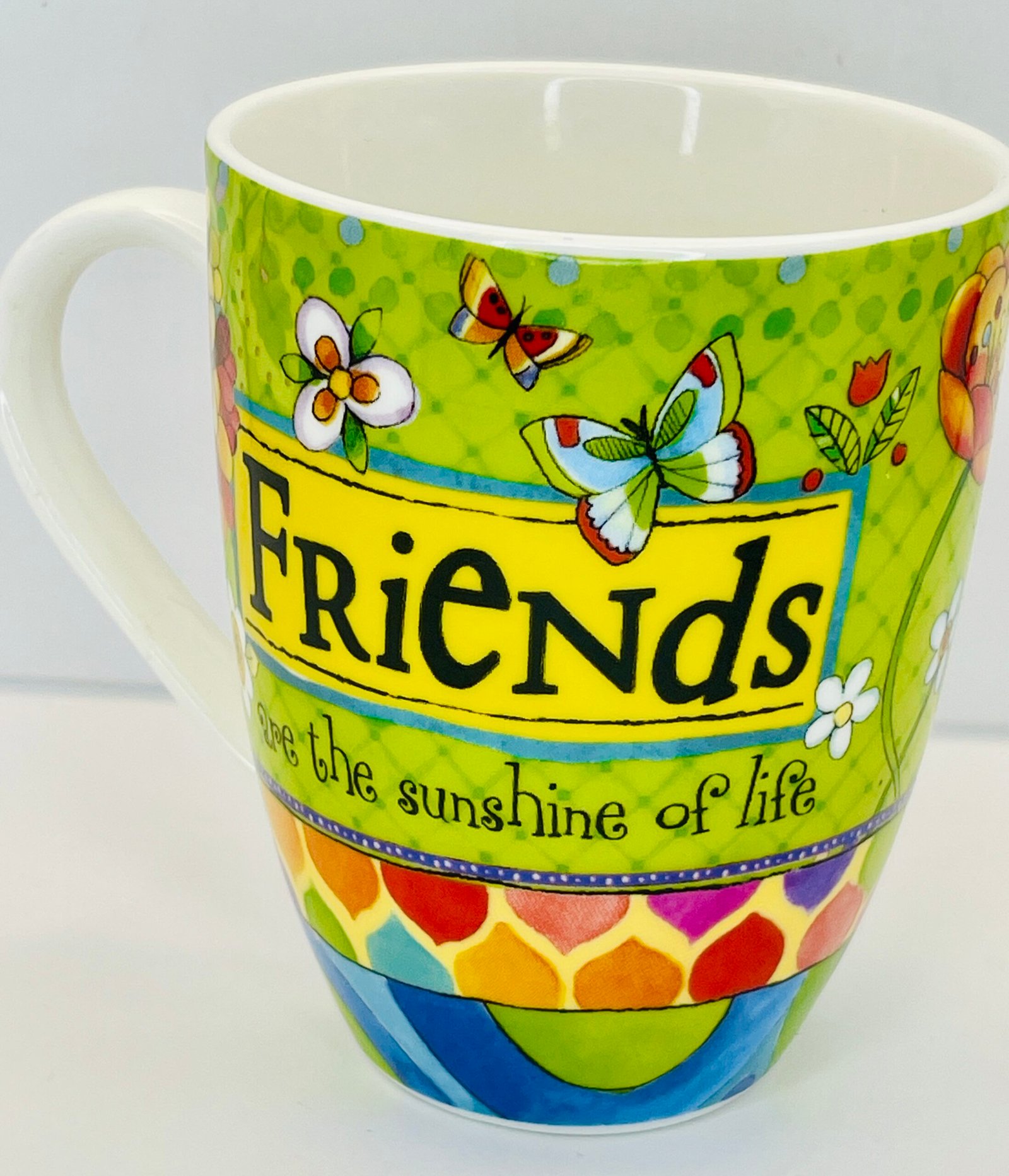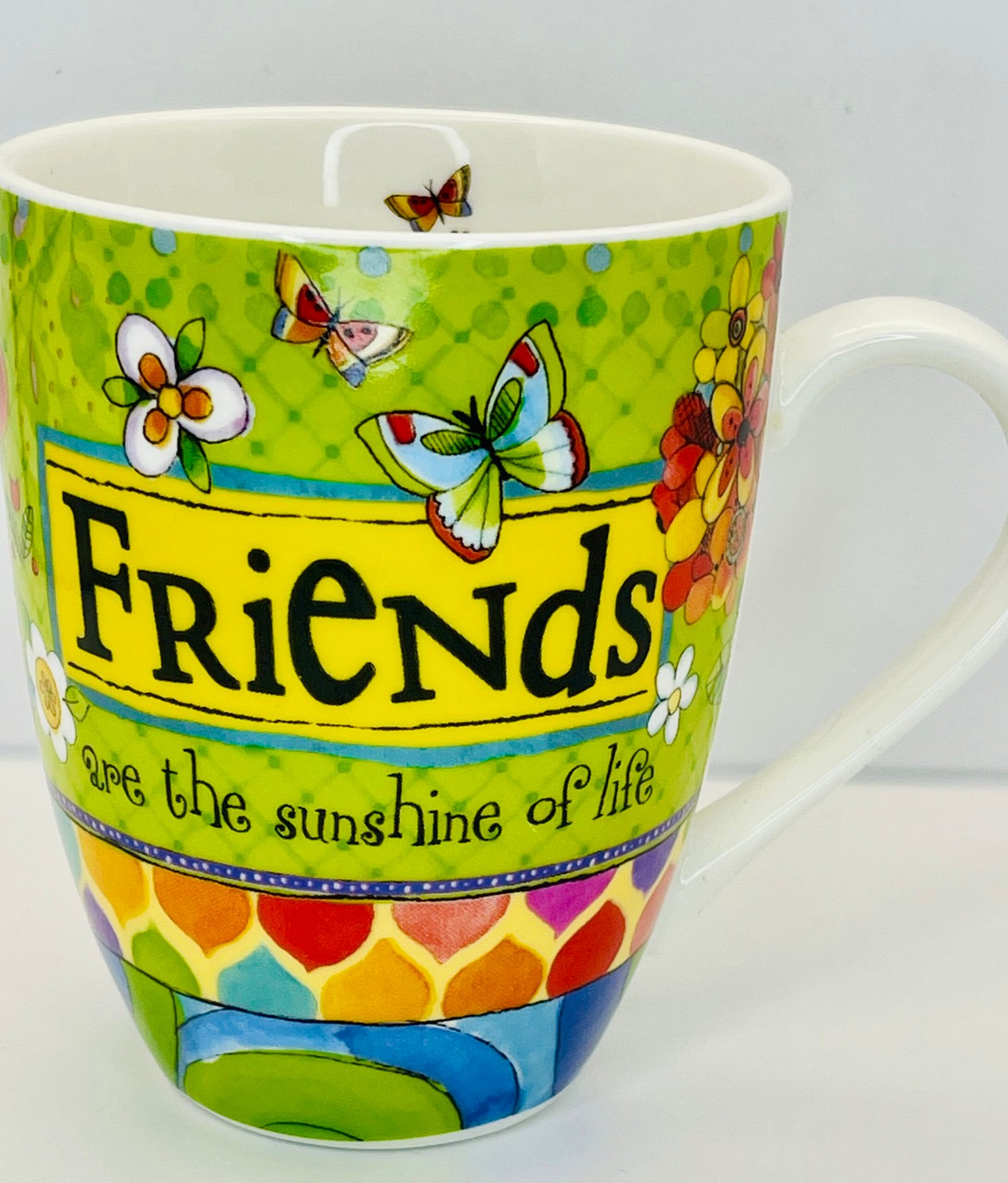 Indeed, this cheerful ceramic mug radiates warmth with its vibrant floral and butterfly design. And the uplifting message, “Friends Are the Sunshine of Life.”