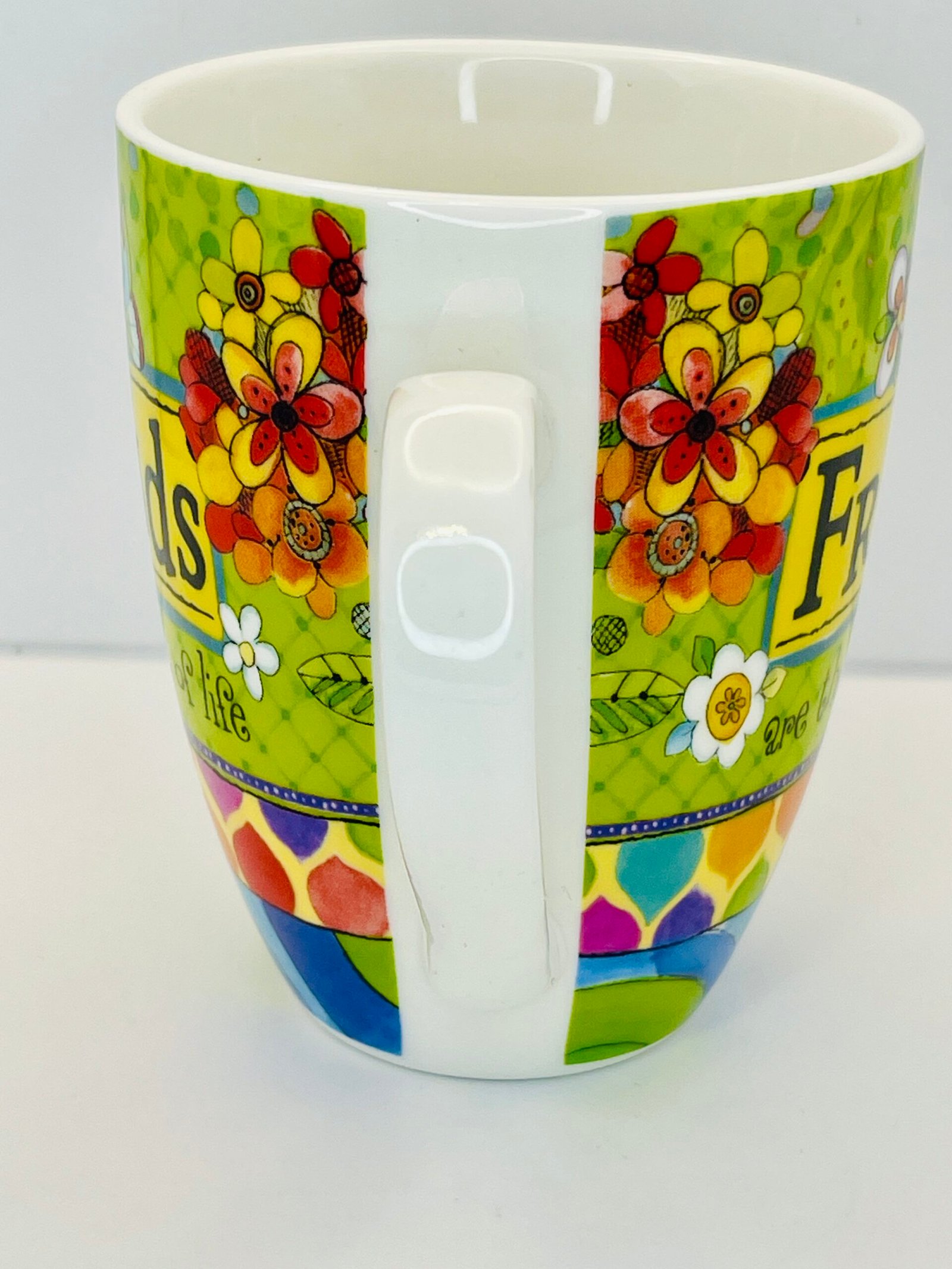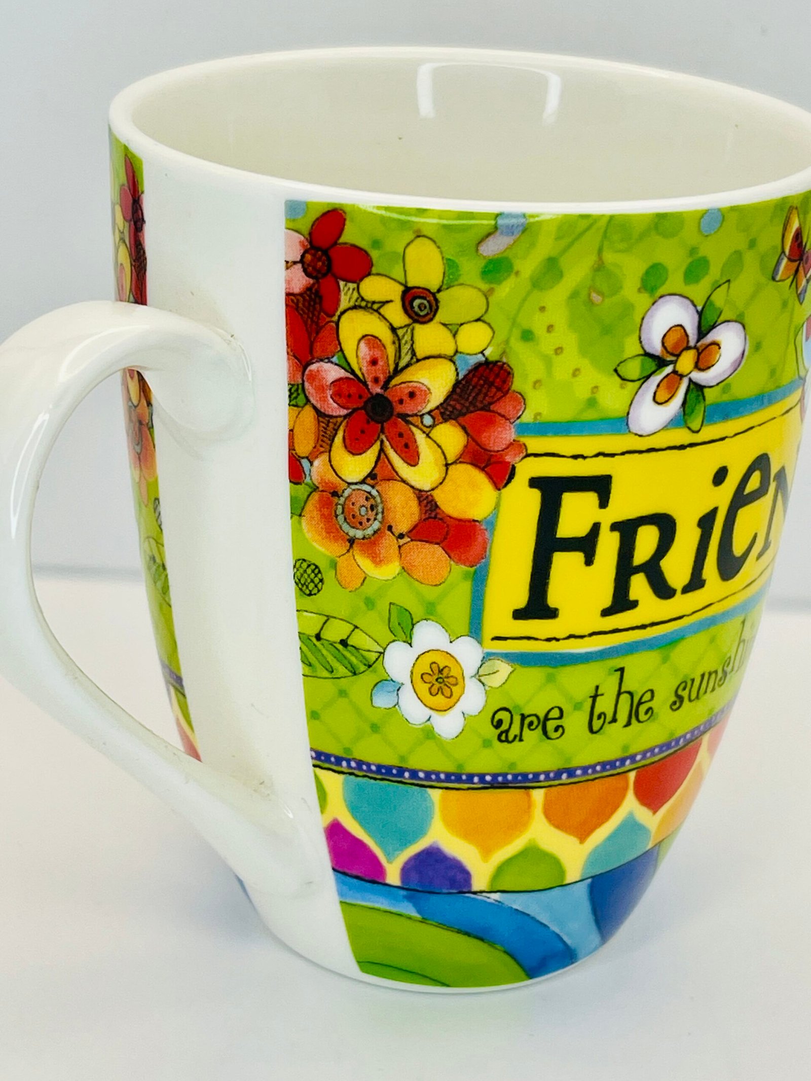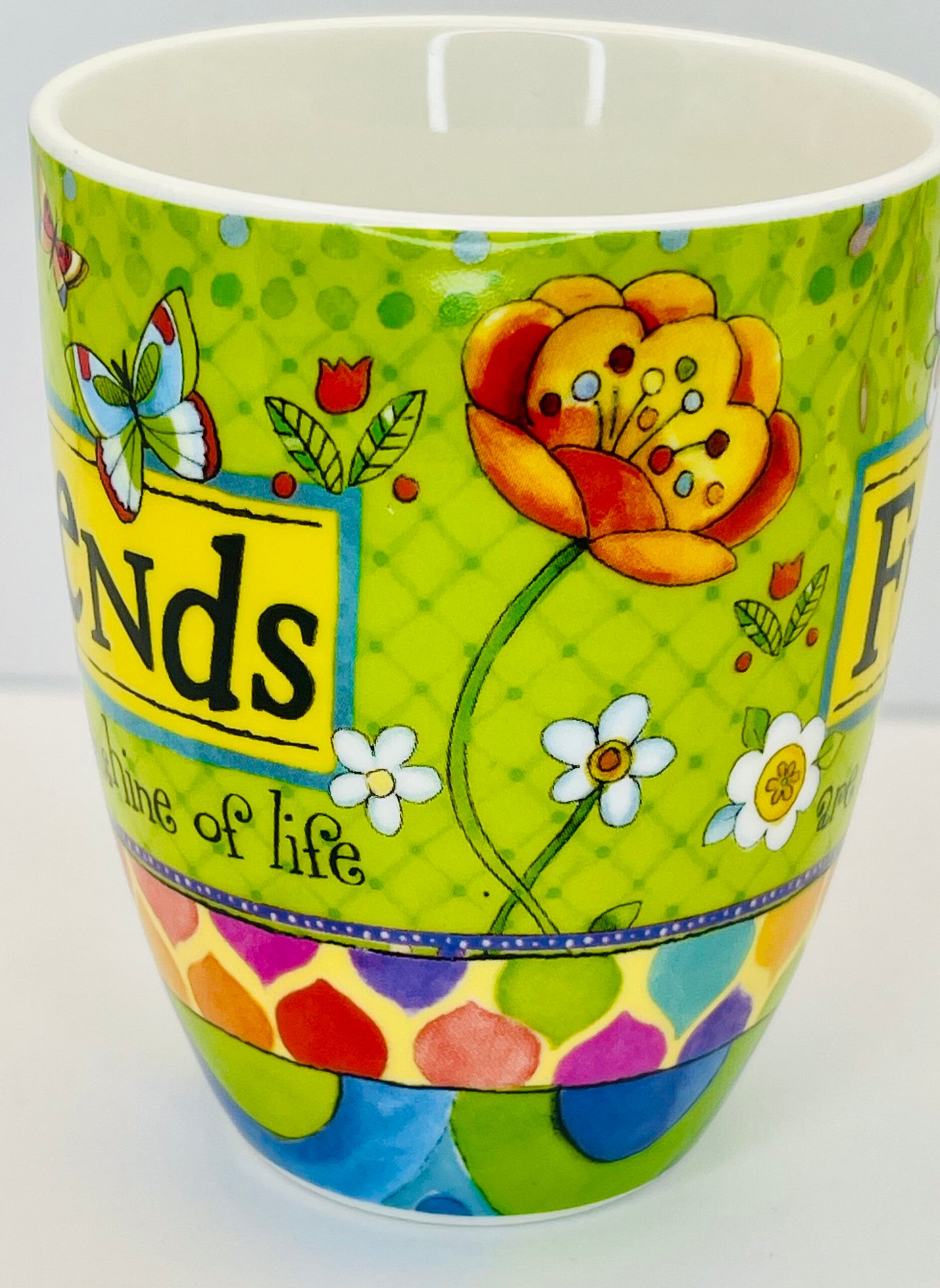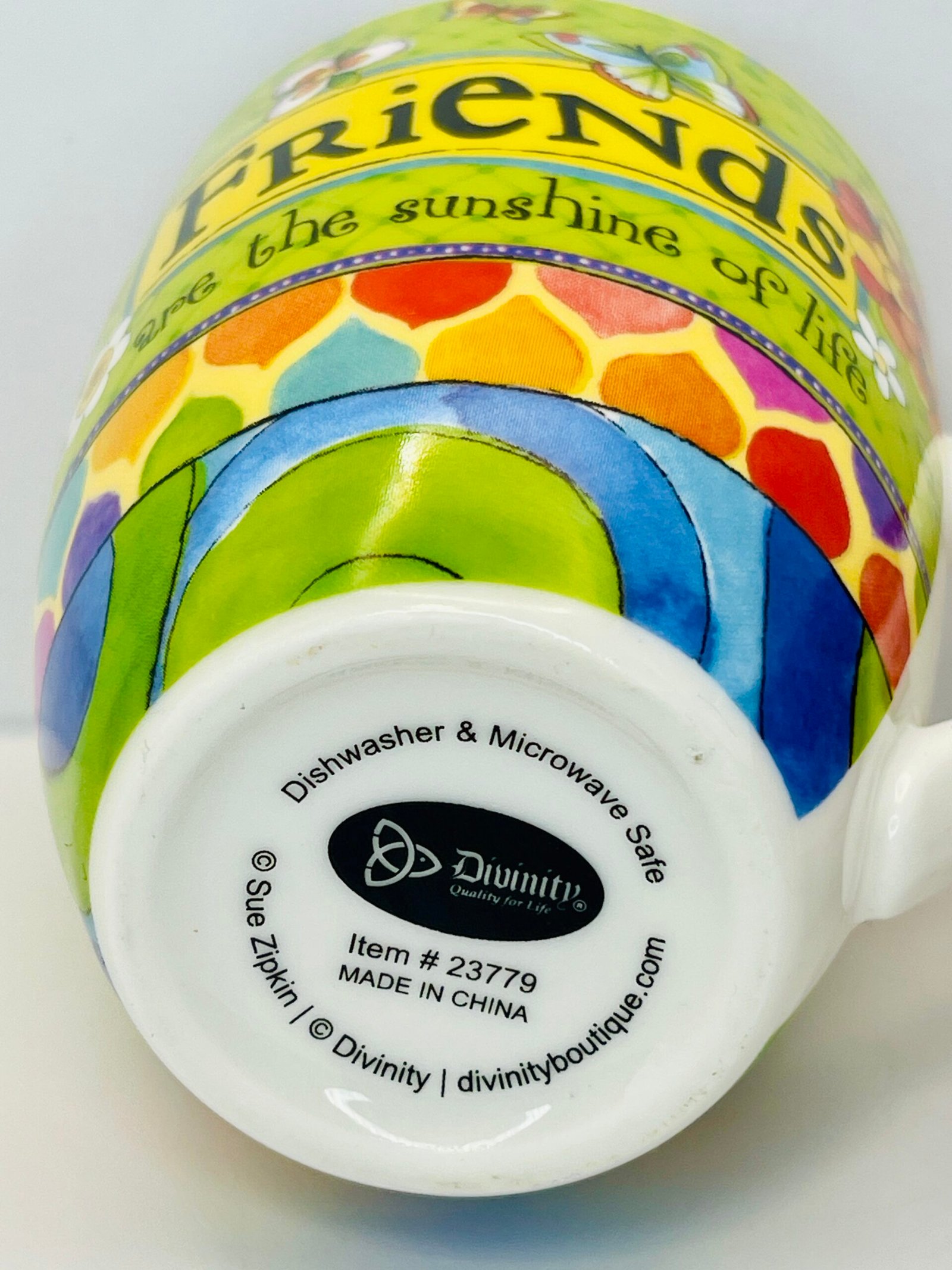 Indeed, this cheerful ceramic mug radiates warmth with its vibrant floral and butterfly design. And the uplifting message, “Friends Are the Sunshine of Life.”