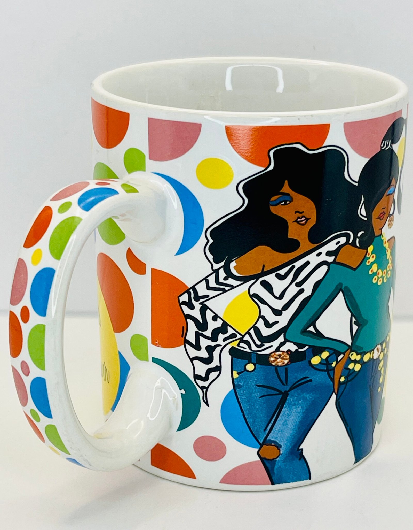 In some ways every detail of this piece says “bestie energy.” The two illustrated women on the front embody strength and sisterhood. With a touch of attitude that makes you smile every time you lift your cup.