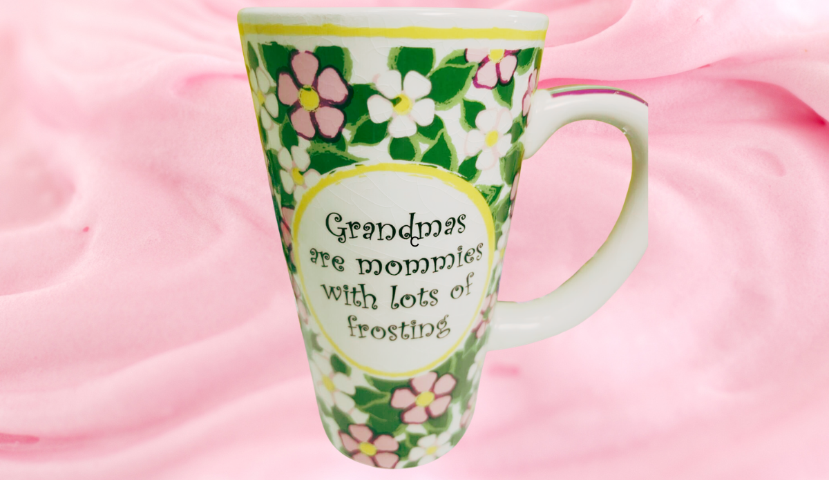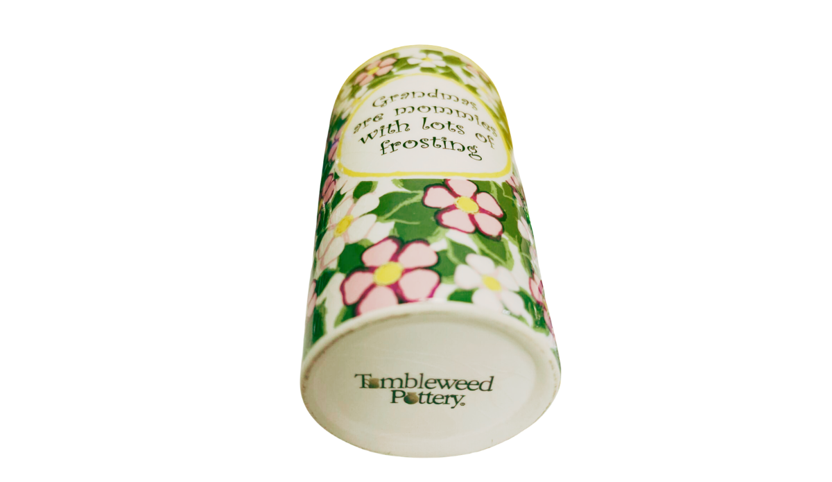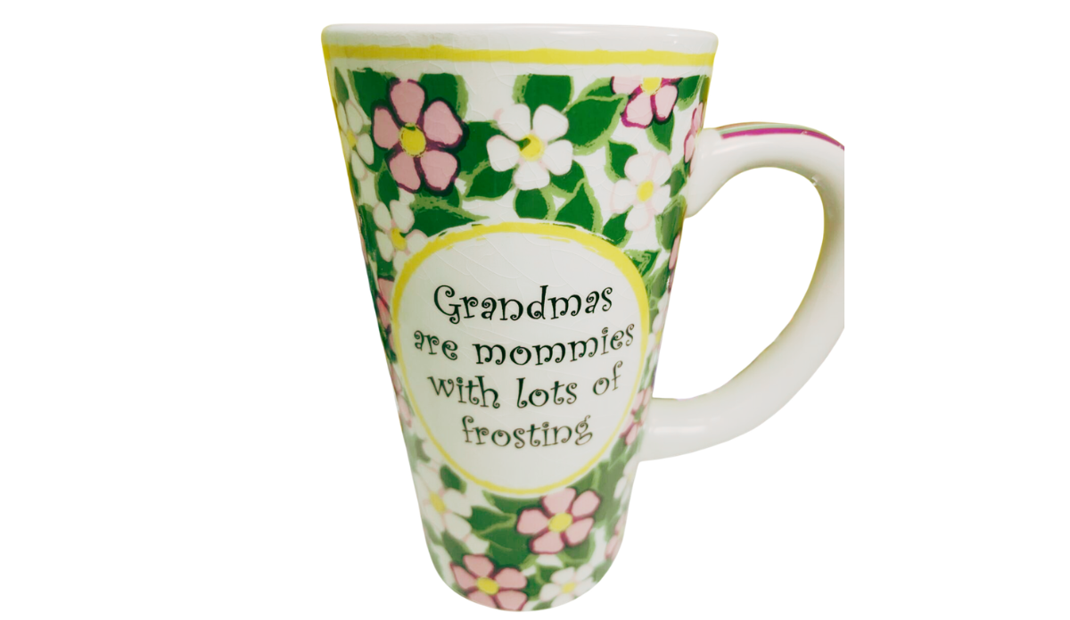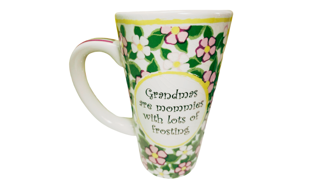 This Grandmas Are Mommies With Lots Of Frosting Latte Mug comes from Tumbleweed Pottery, a brand known for whimsical designs and heartfelt messaging. That connection adds both charm and recognizable collector appeal.