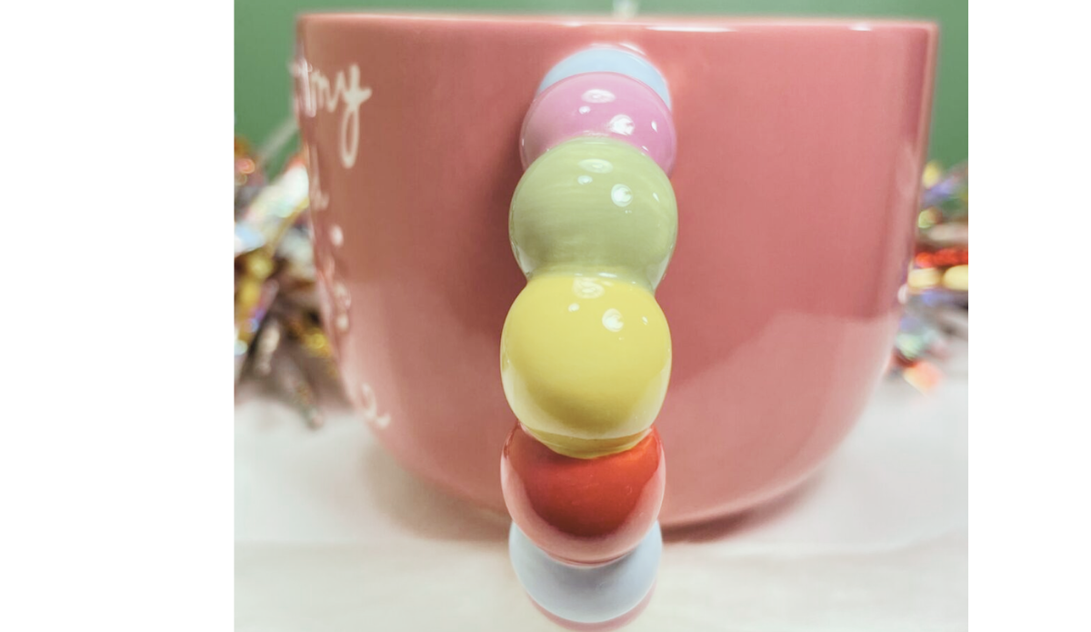 This ceramic mug features a soft pink base with raised lettering and a sculpted beaded handle full of color and personality.