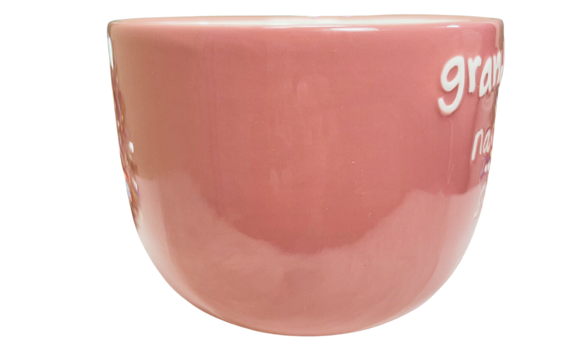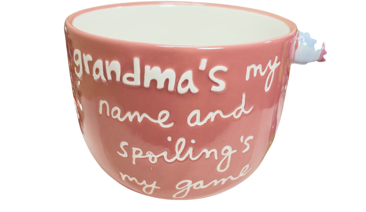 Right away, the soft pink ceramic creates a warm and cheerful look. Meanwhile, the raised multicolor “grandma” lettering adds a playful and joyful pop across the top. And as you read the message, “Grandma’s my name and spoiling’s my game,” the personality of this mug really shines. Because of that, it feels fun, personal, and instantly gift-worthy.