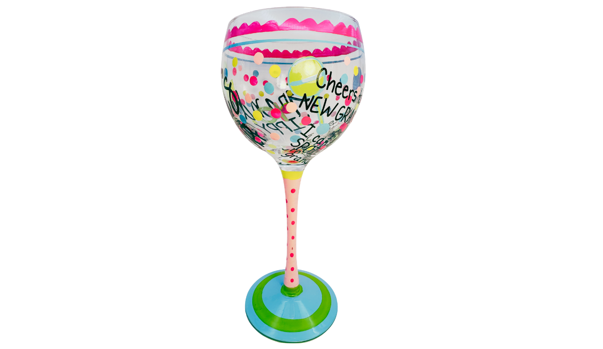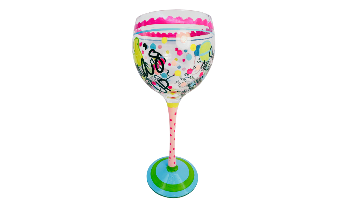 This hand-painted wine glass stands out immediately due to its full-coverage design and expressive, celebratory theme 👵🏽💖