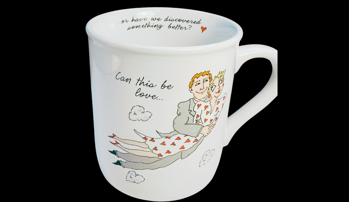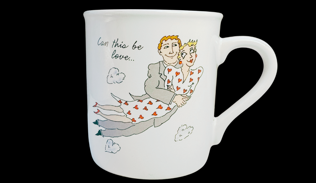 The front reads, “Can this be love…” in delicate script. Meanwhile, the inside rim finishes the thought: “or have we discovered something better?” A tiny red heart adds the final romantic touch.