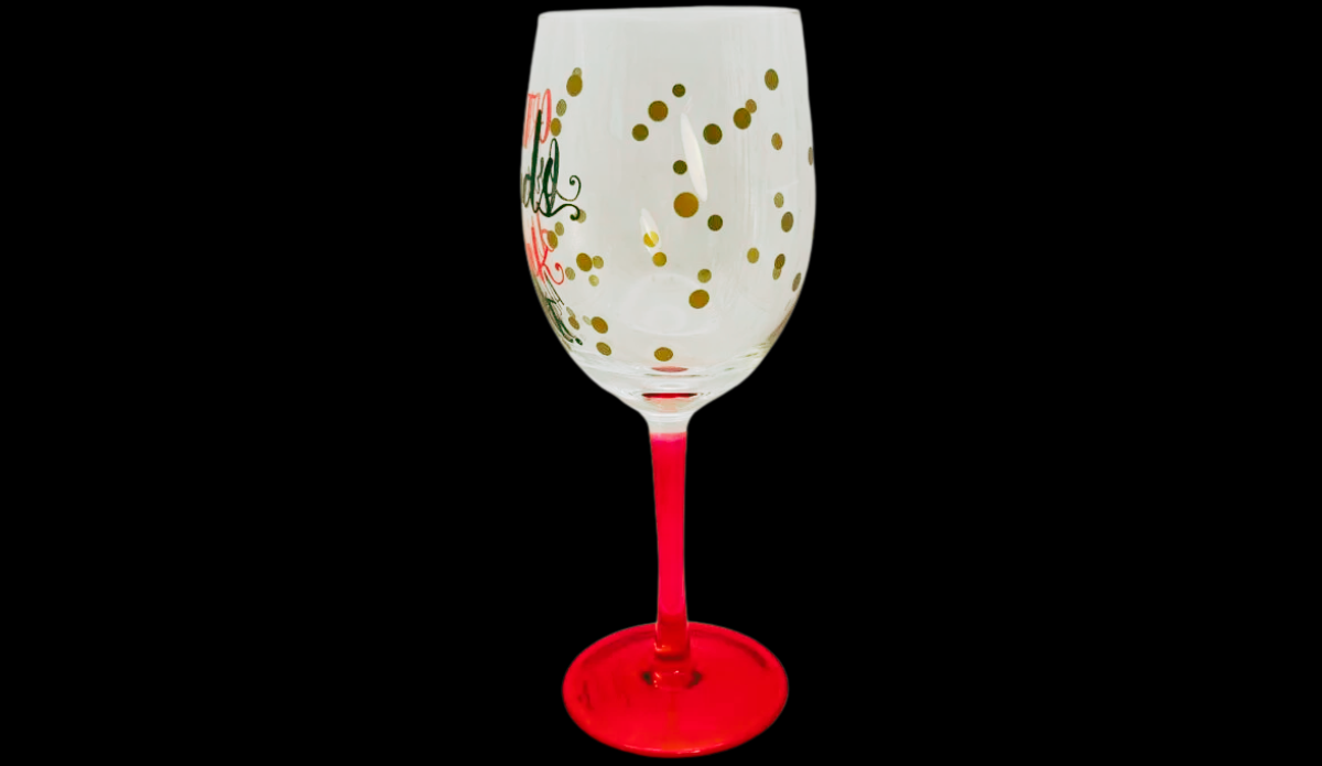 Notes: Classic stemmed wine glass design with playful Hallmark message