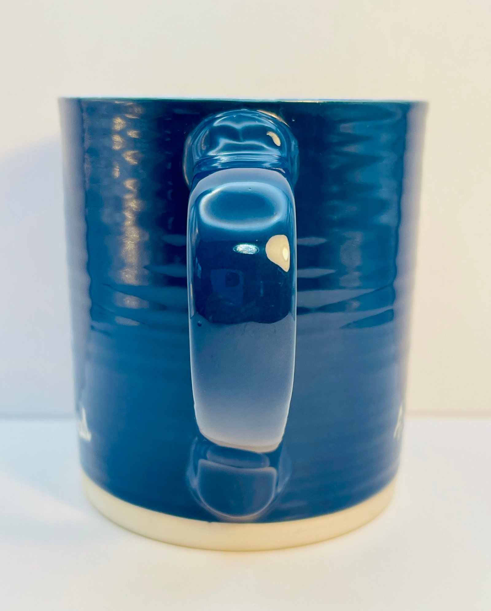 This mug appears to be a high-grade ceramic coffee mug with a navy blue exterior and a light blue interior. The contrast feels clean and nautical without being overly themed.