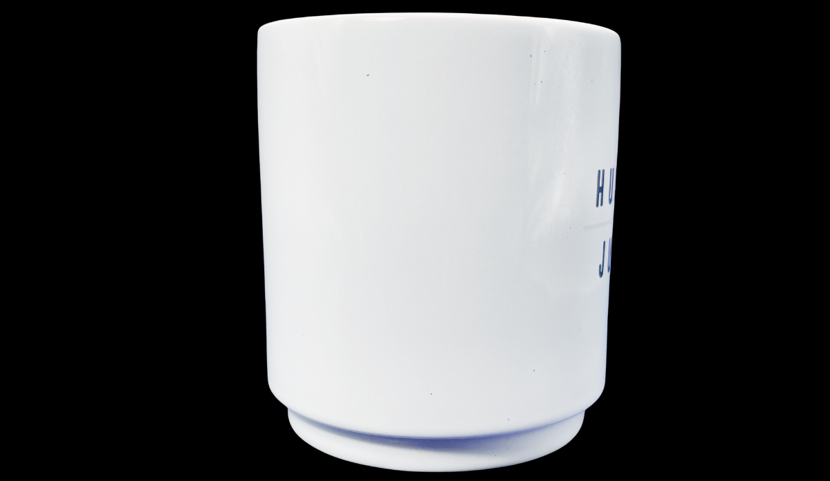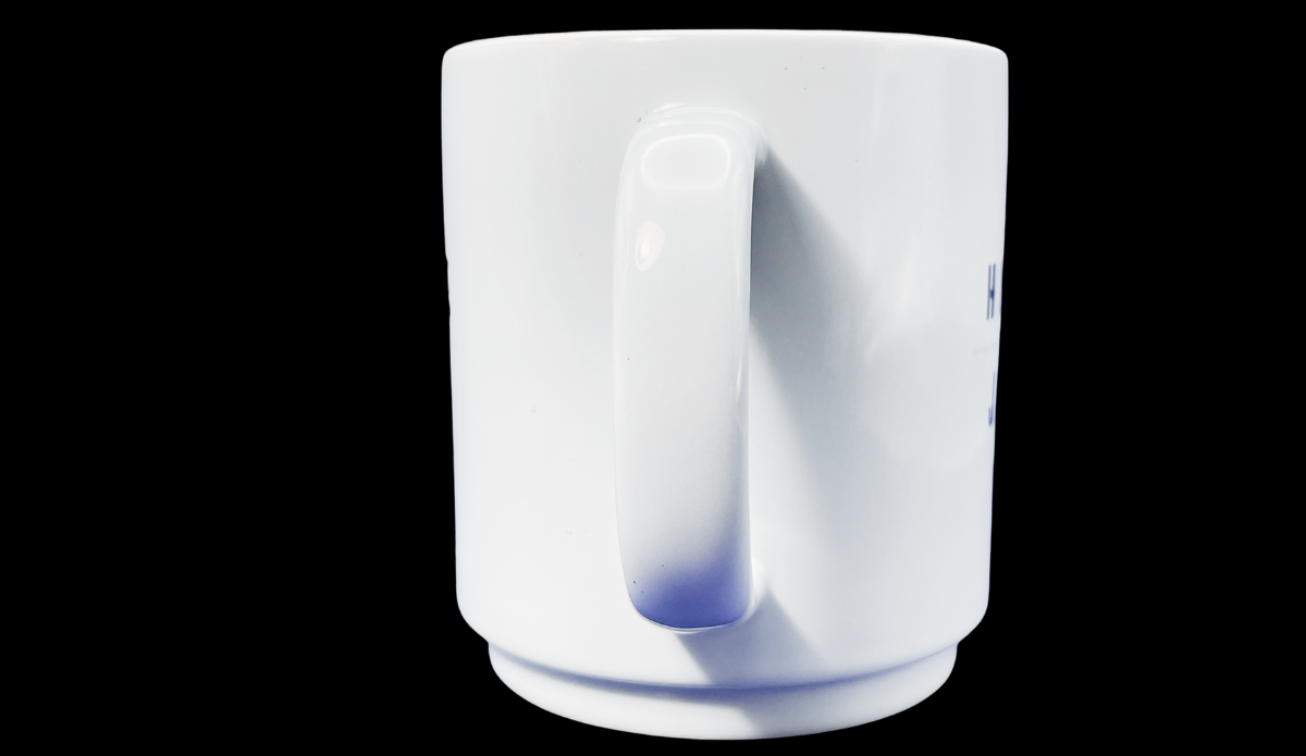 • White ceramic finish with bold navy lettering