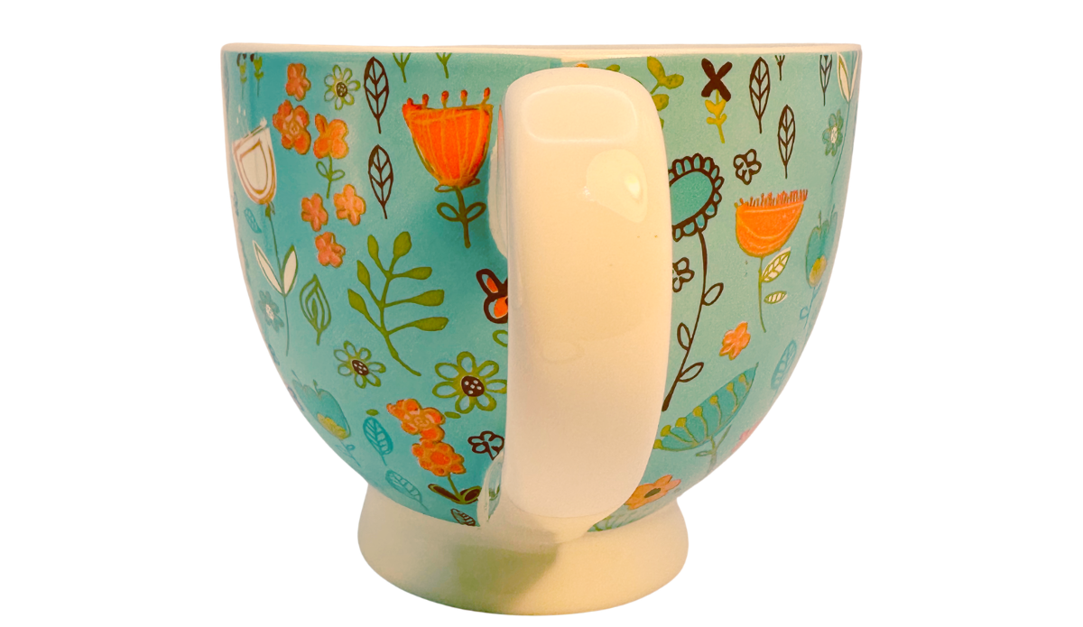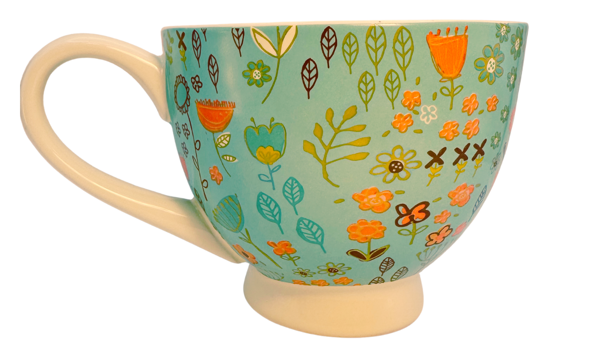 This floral soup mug features a teal stoneware body with a full wraparound floral pattern and a centered message panel.