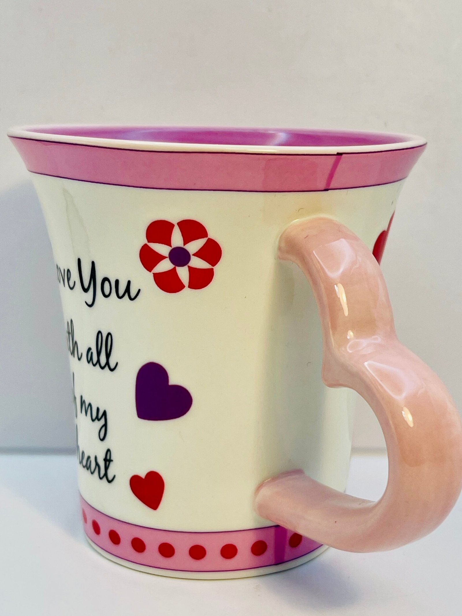 In addition, decorative hearts and floral details wrap around the mug. These details add charm without feeling overwhelming. The heart-shaped handle stands out right away and gives the mug its signature look.
