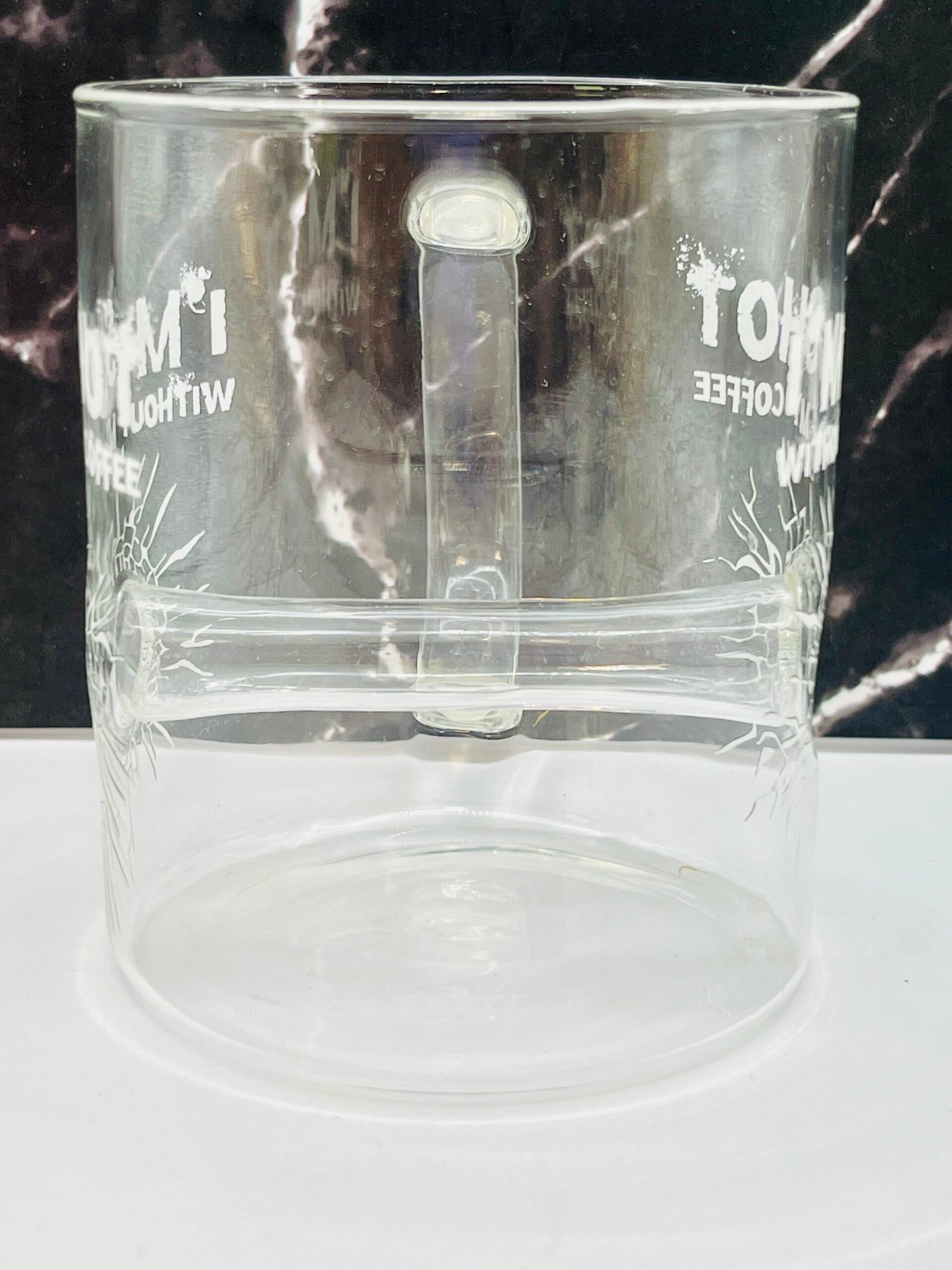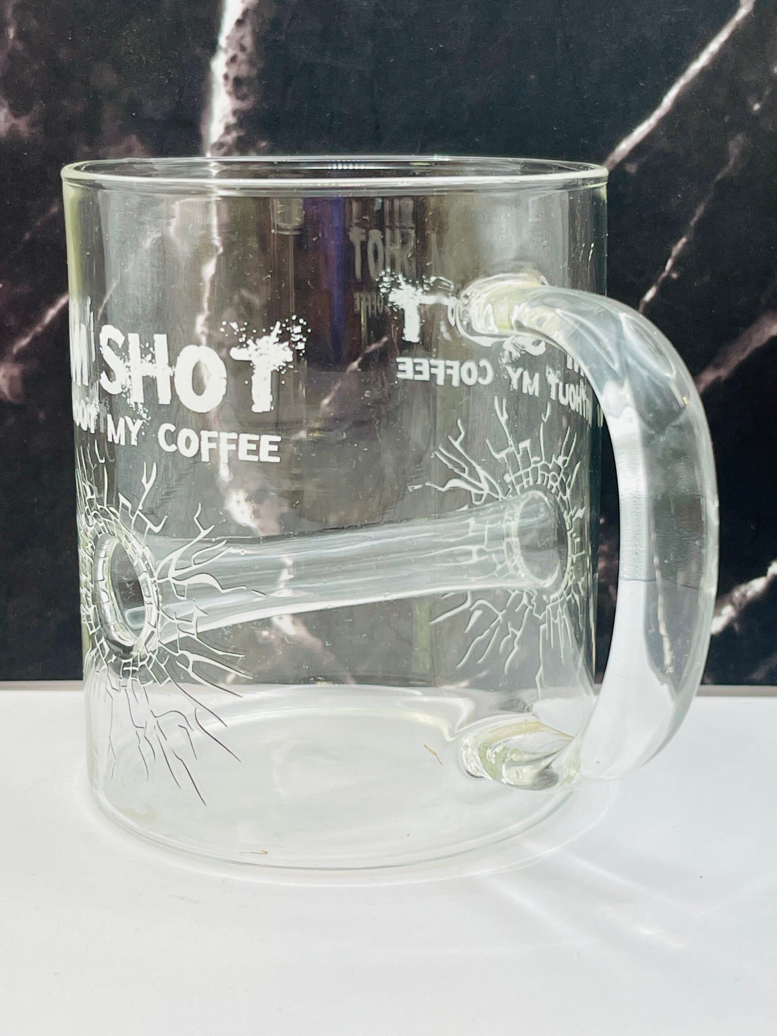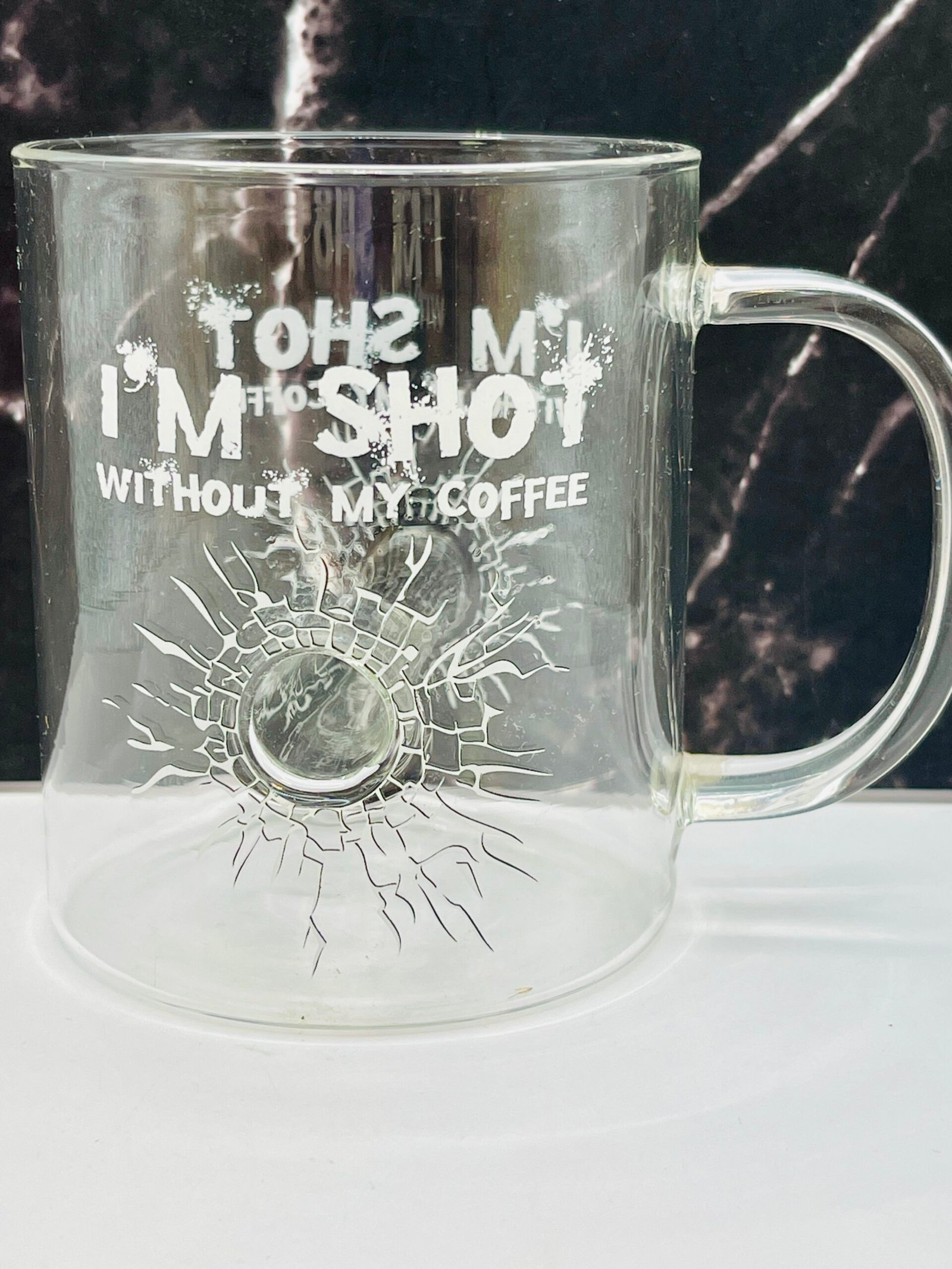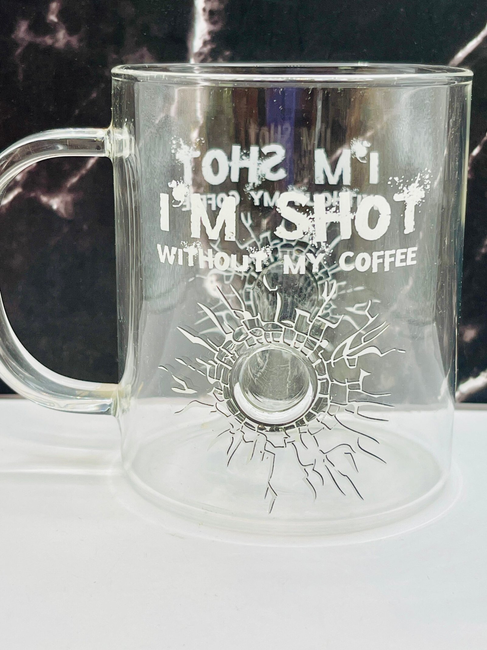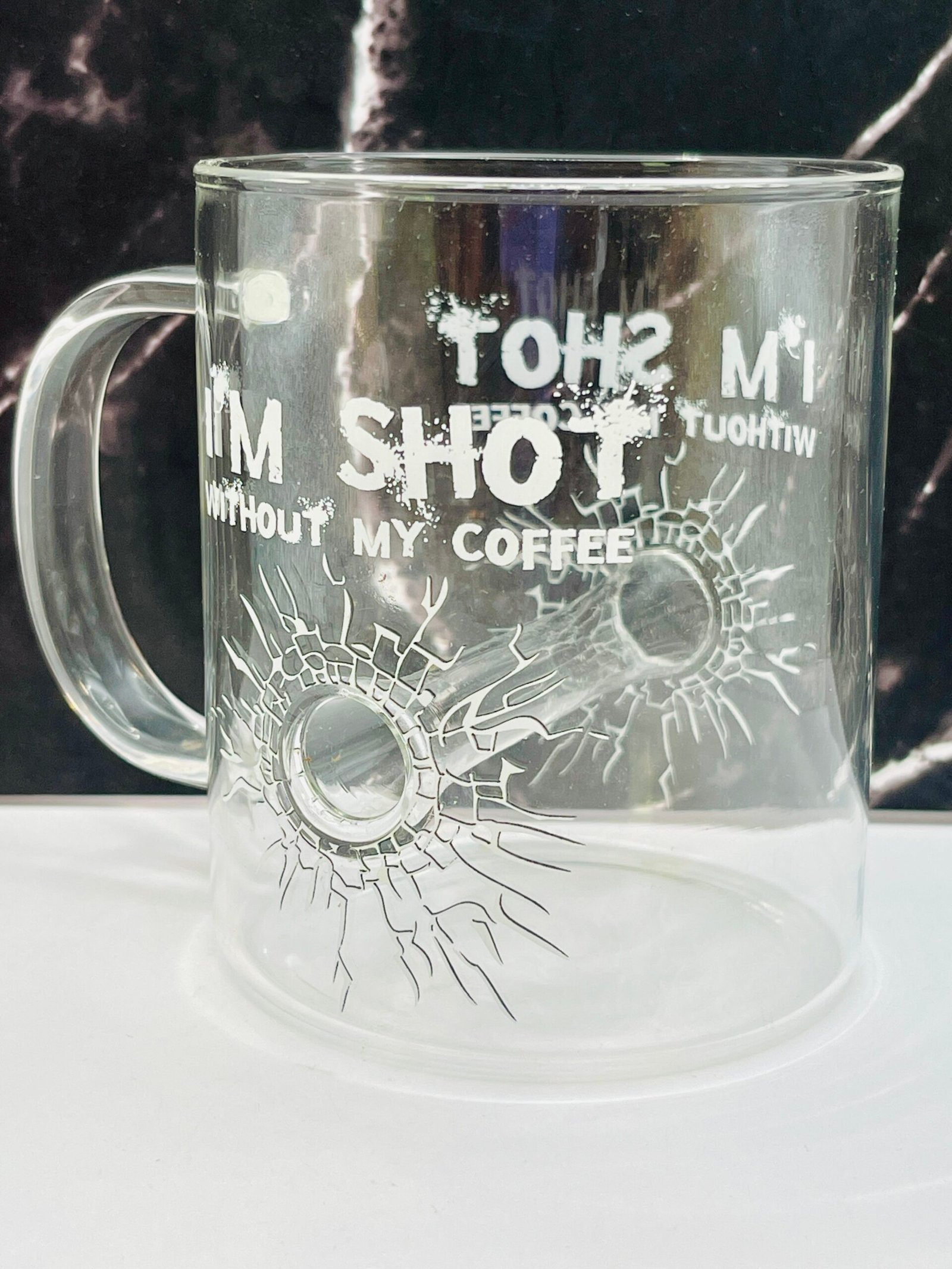 Crafted from high-quality clear glass. The I’m Shot Without Coffee Mug shows off your coffee beautifully. While giving the illusion that a bullet has pierced through it.