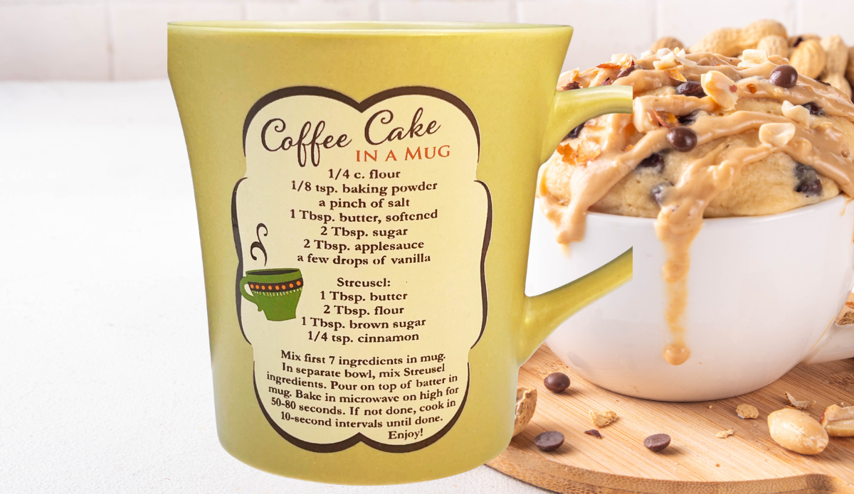 Indeed, this charming 8-ounce tan ceramic mug features the uplifting phrase Java Blessed Day on the front. It’s accompanied by a steaming green cup of coffee. But the real magic is on the back—a simple, delicious coffee cake recipe you can make right in the mug!