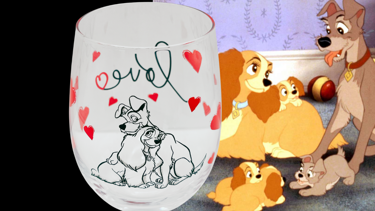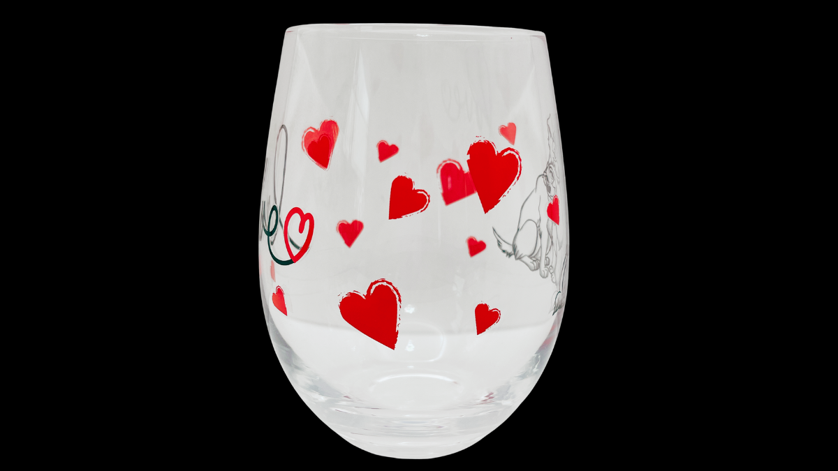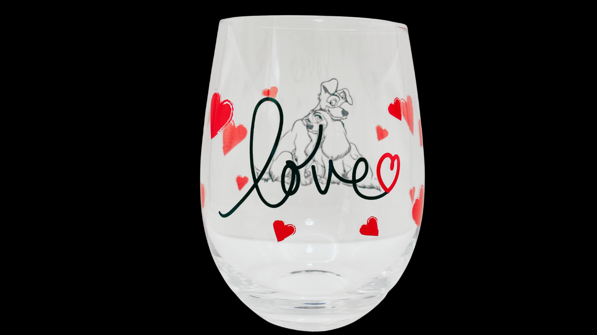 First, Lady and Tramp appear sitting together beneath the flowing script word “love.” Meanwhile, red hearts scatter across the glass, creating a playful and affectionate design.