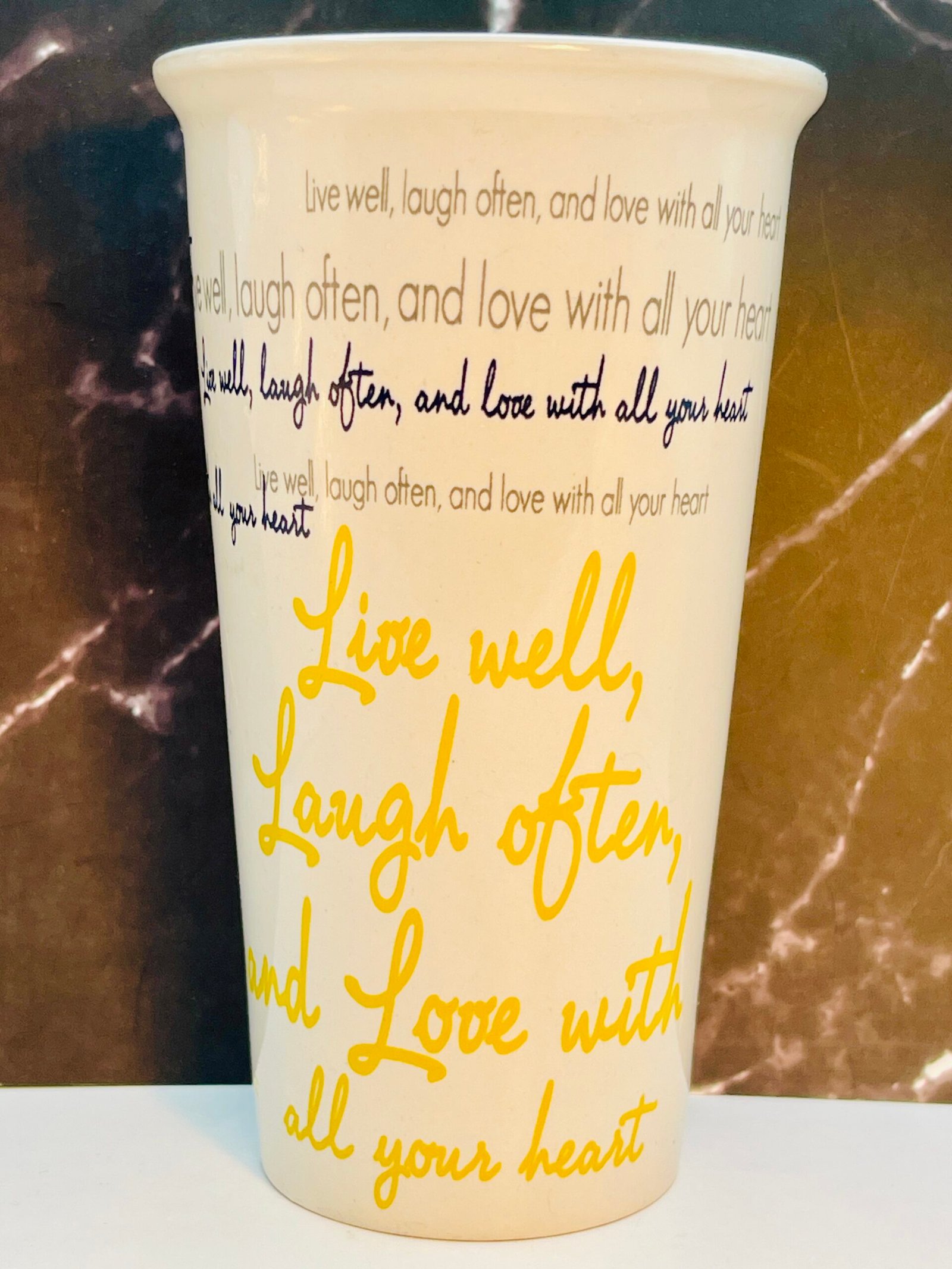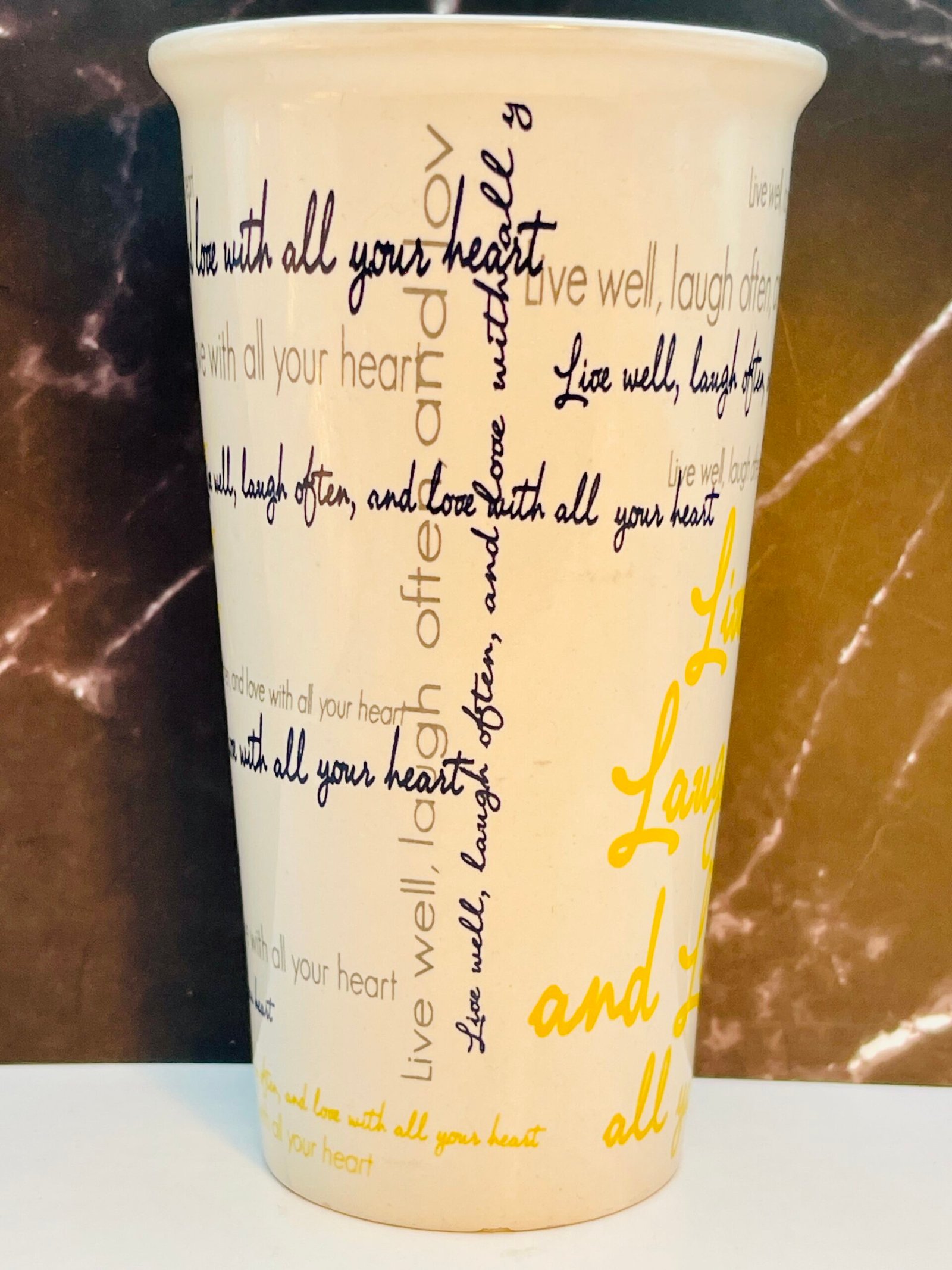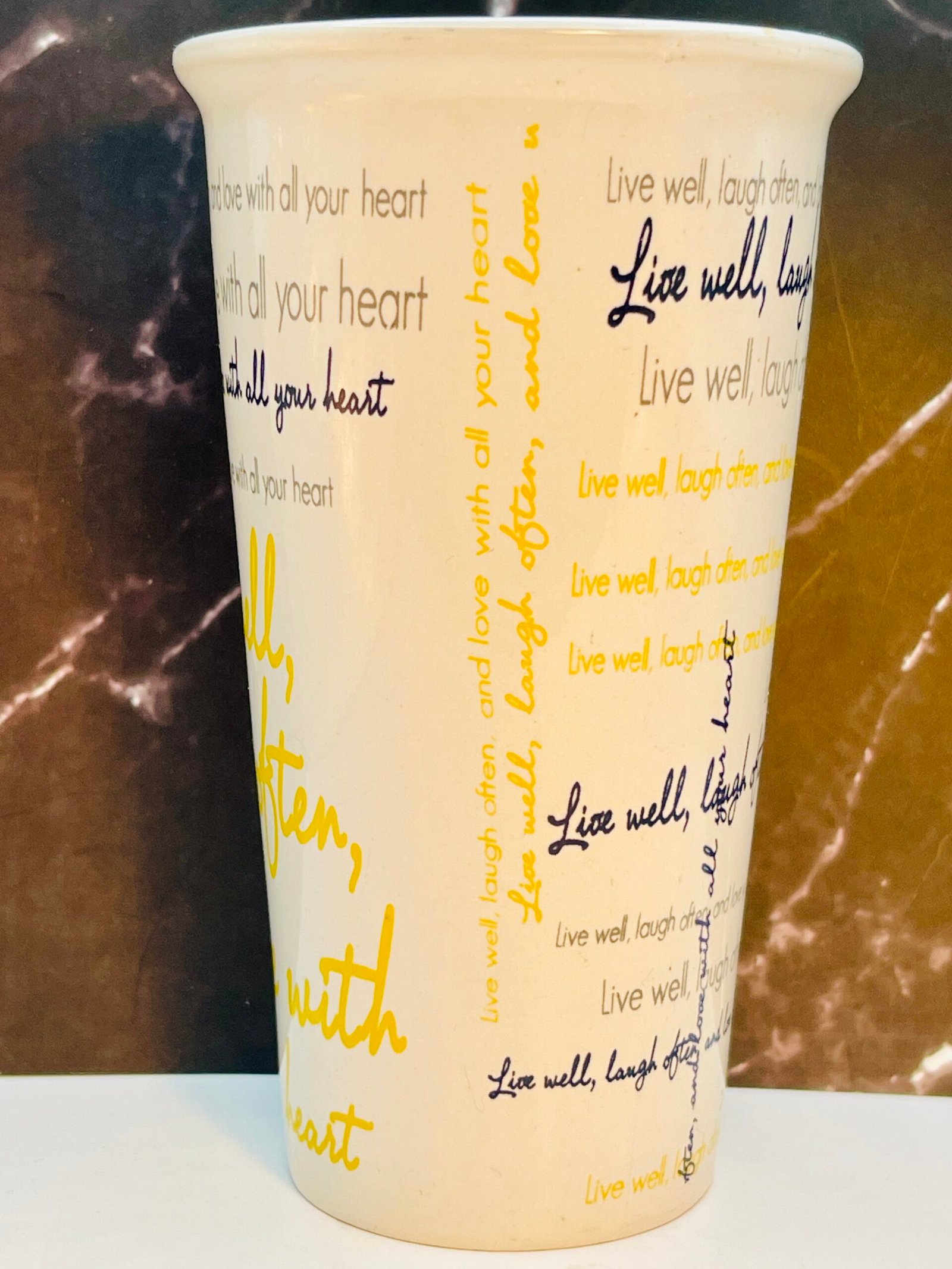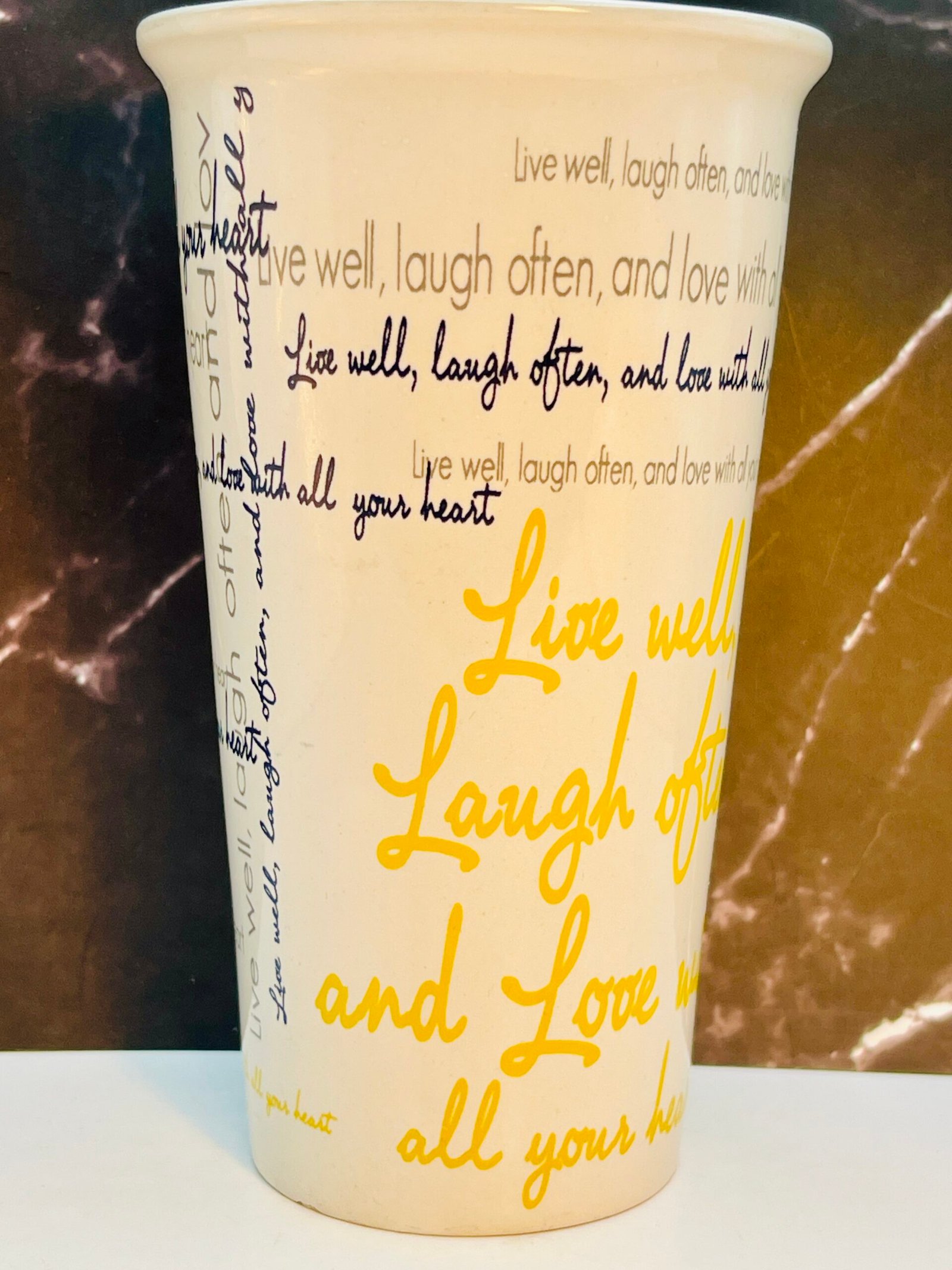 In fact, this Live Well Laugh Often Love Latte Mug boasts a crisp white exterior accented by a sunny yellow interior. Especially making it a bright addition to any kitchen, office, or coffee bar.