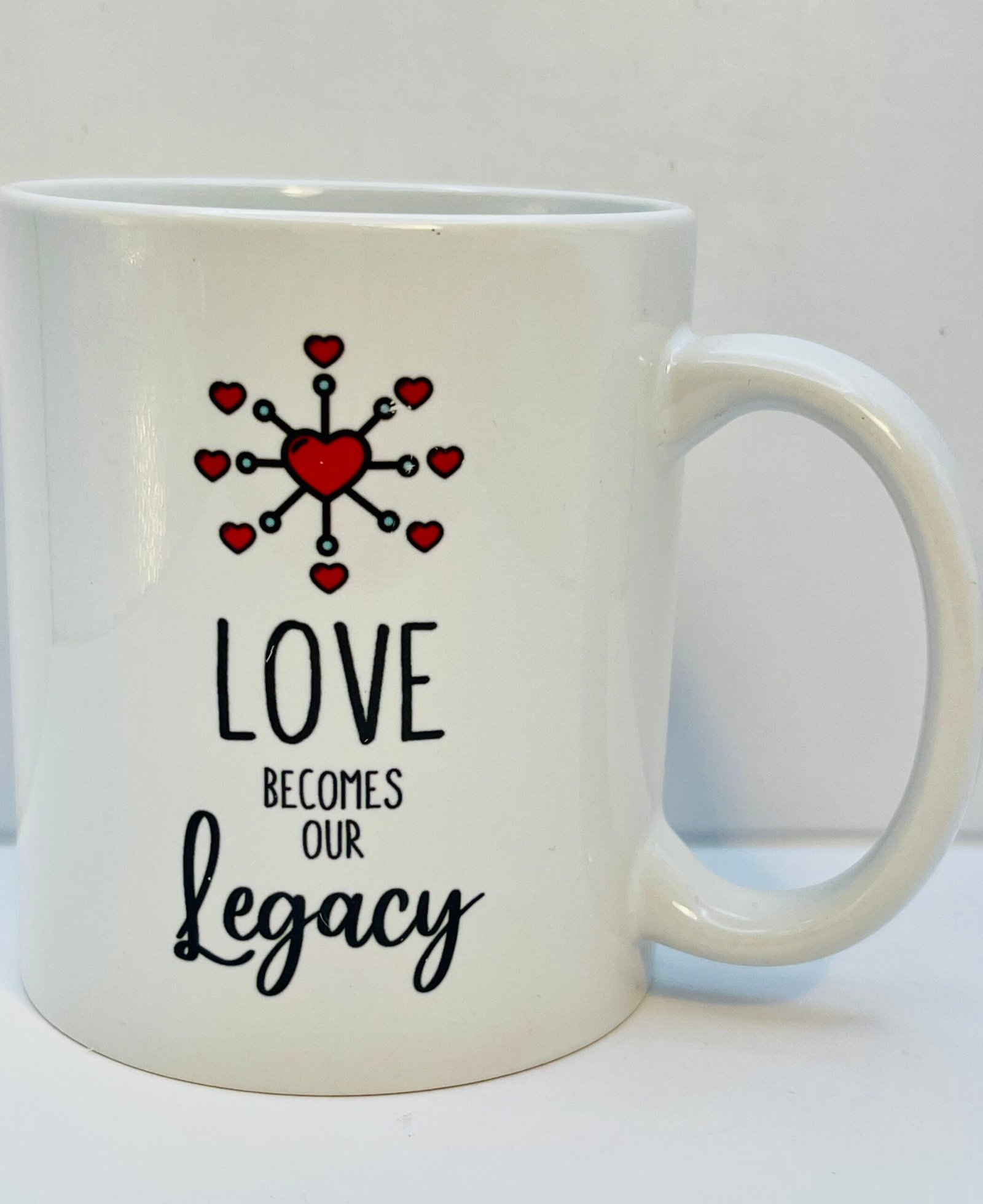 This mug appears to be a white ceramic coffee mug with a clean, balanced look. The quote “LOVE BECOMES OUR LEGACY” stands out clearly on the surface.