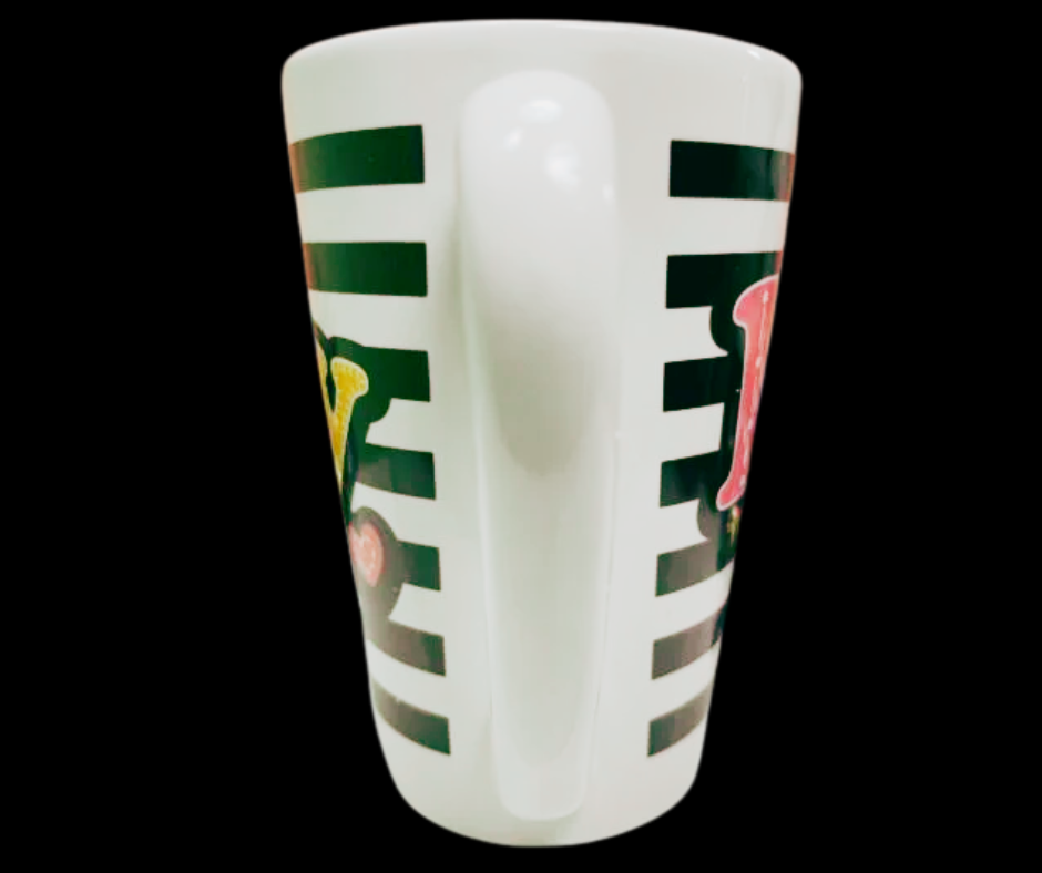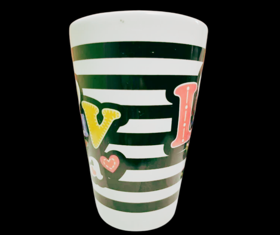 This ceramic mug features a black-and-white striped exterior with colorful lettering.