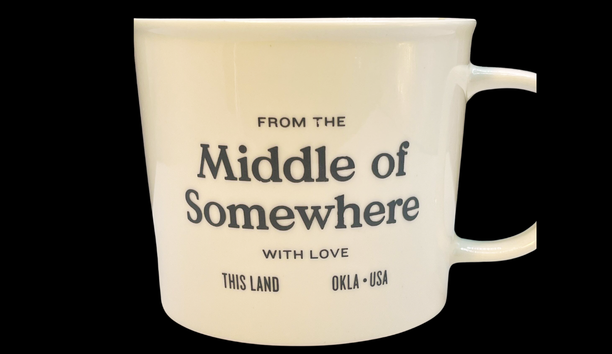 This ceramic mug features a soft cream finish with centered typography. The phrase “From the Middle of Somewhere With Love” sits prominently on the front. Beneath it, “This Land” and “Okla • USA” add location detail. Meanwhile, the wide body creates a balanced shape. Also, the sturdy handle offers a comfortable grip.