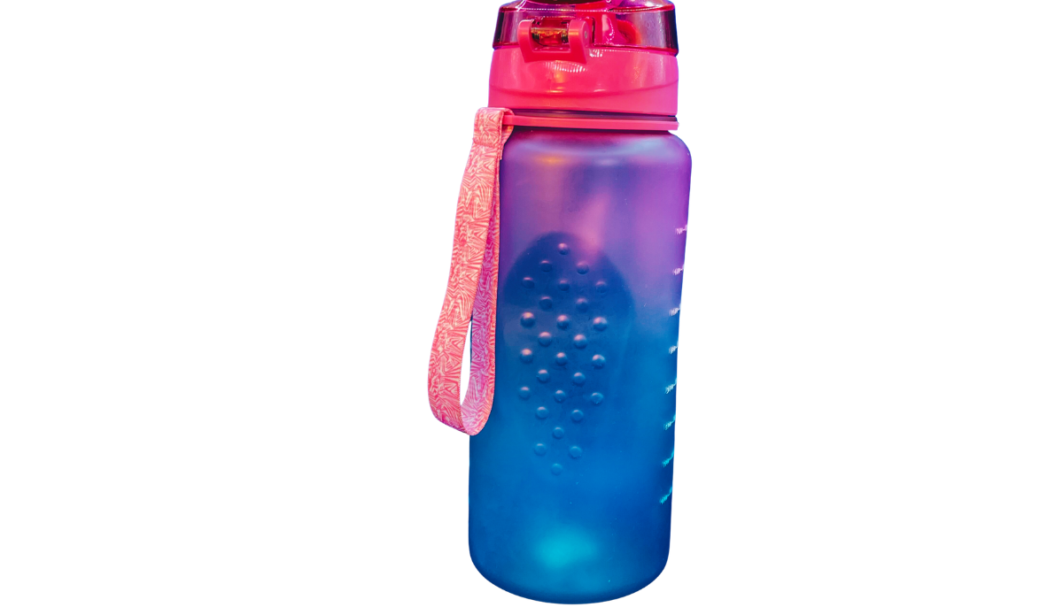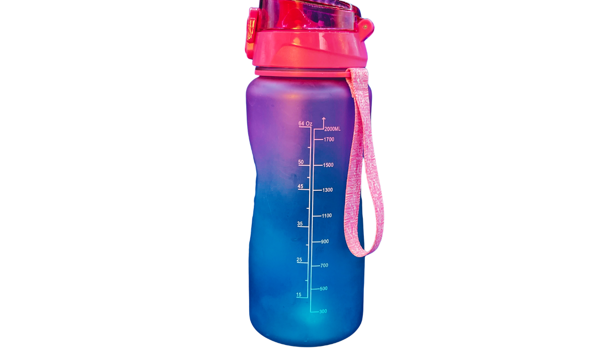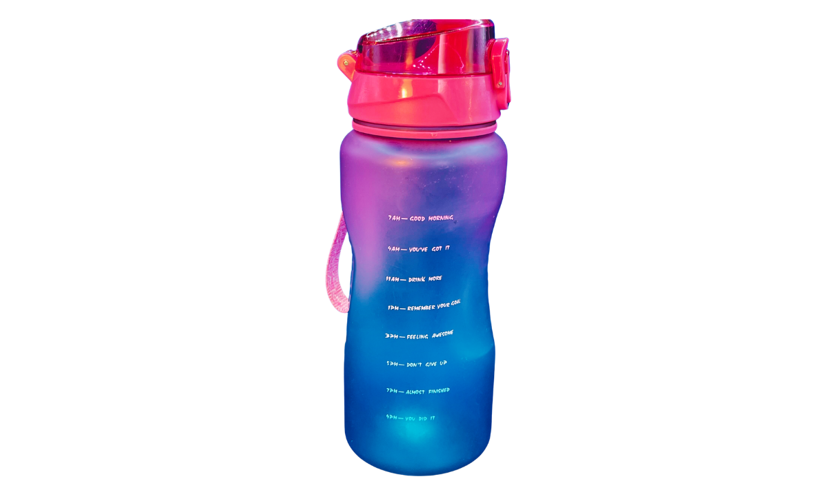 This BPA-free plastic water bottle features a smooth ombre gradient transitioning from vibrant pink at the top to deep blue at the base. The side includes printed time markers with motivational phrases to guide daily hydration. Meanwhile, the flip-top lid includes a secure latch for easy use. Also, the attached strap adds convenience for carrying on the go.
