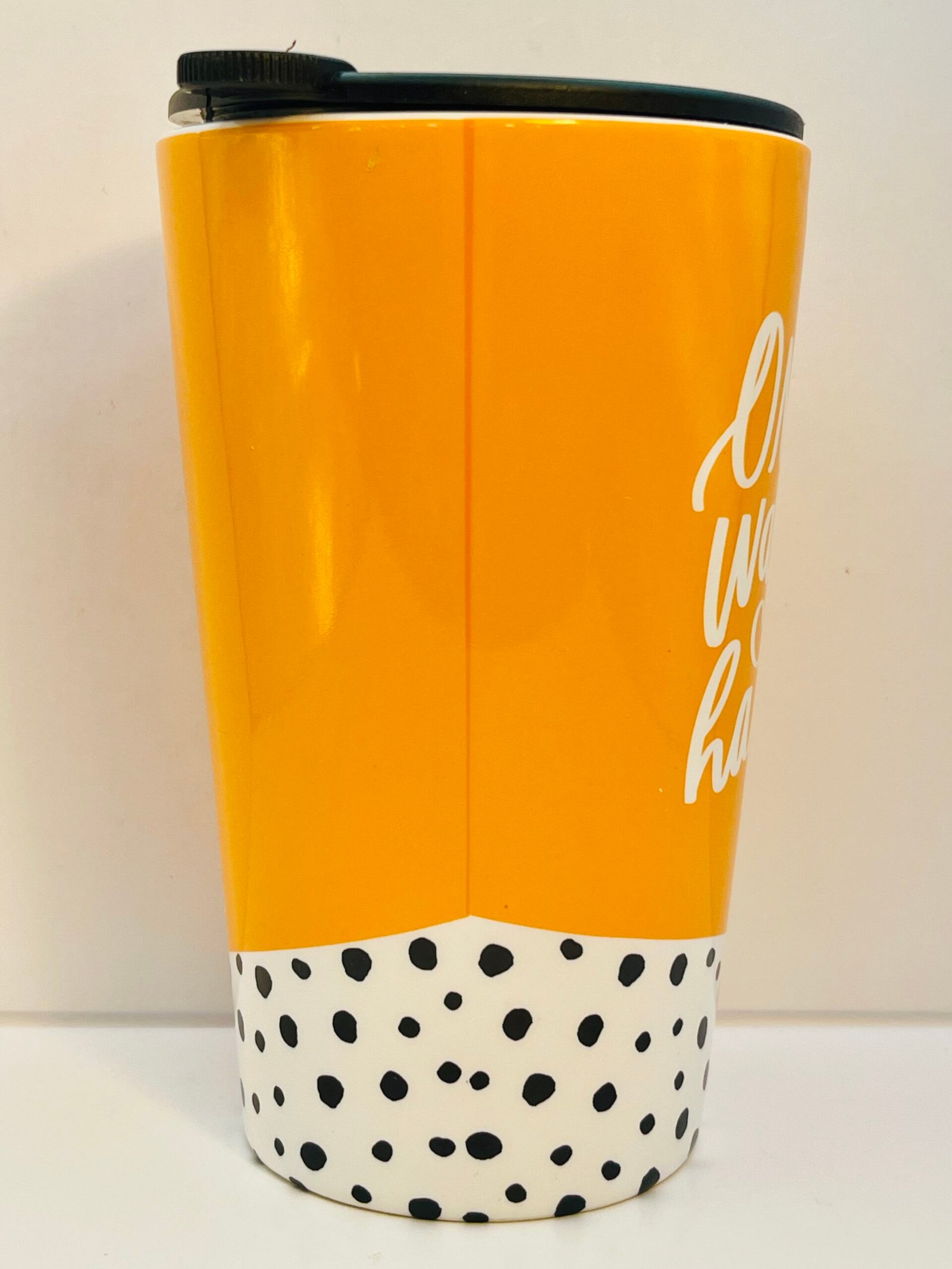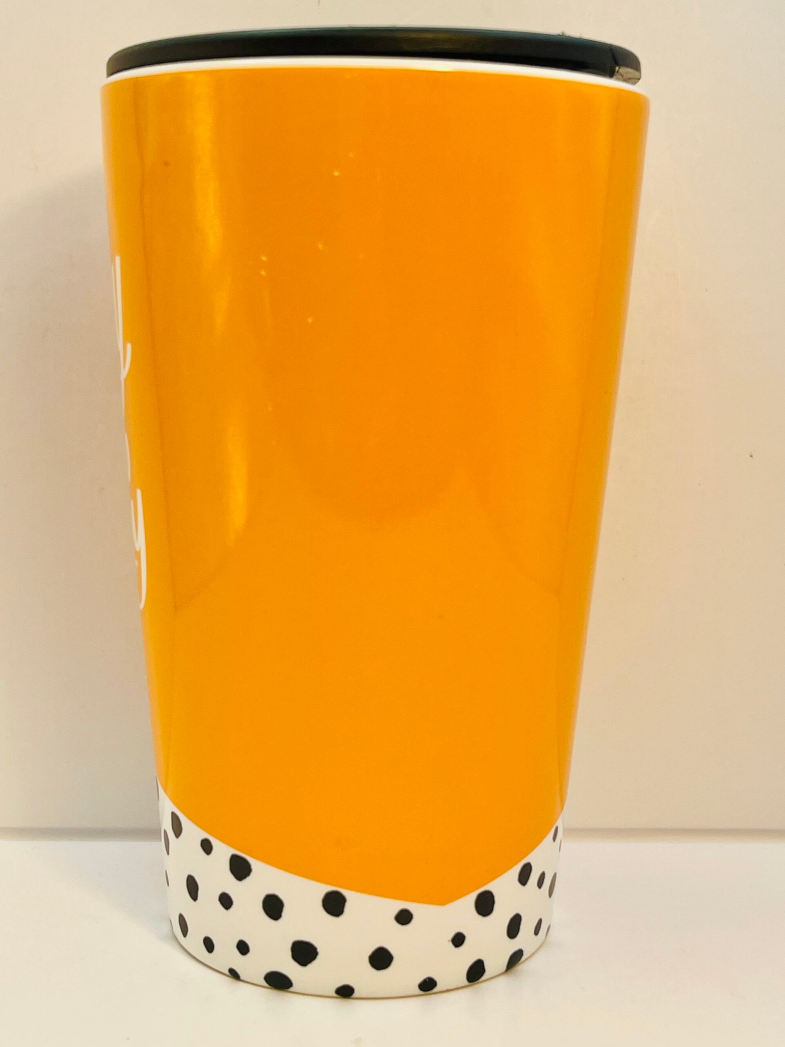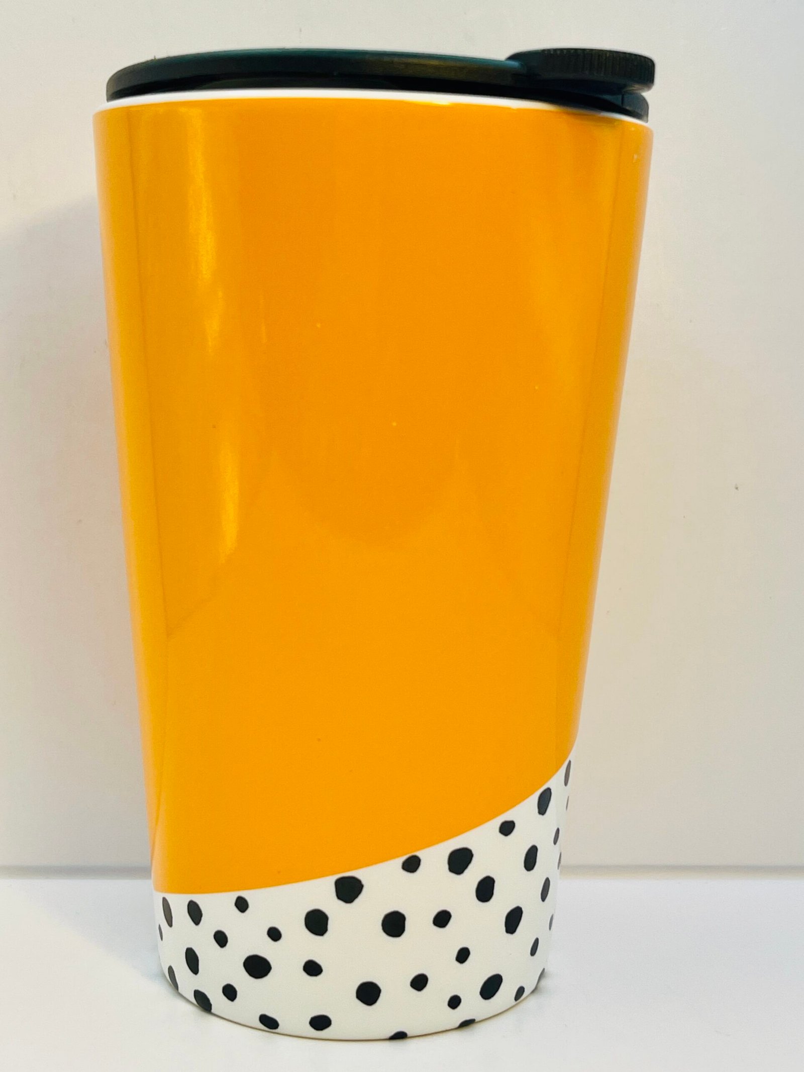 This mug appears to be a Hallmark ceramic travel tumbler with a playful and modern design. The lower portion features a black-and-white polka dot pattern, while the top is finished in a bold orange color.