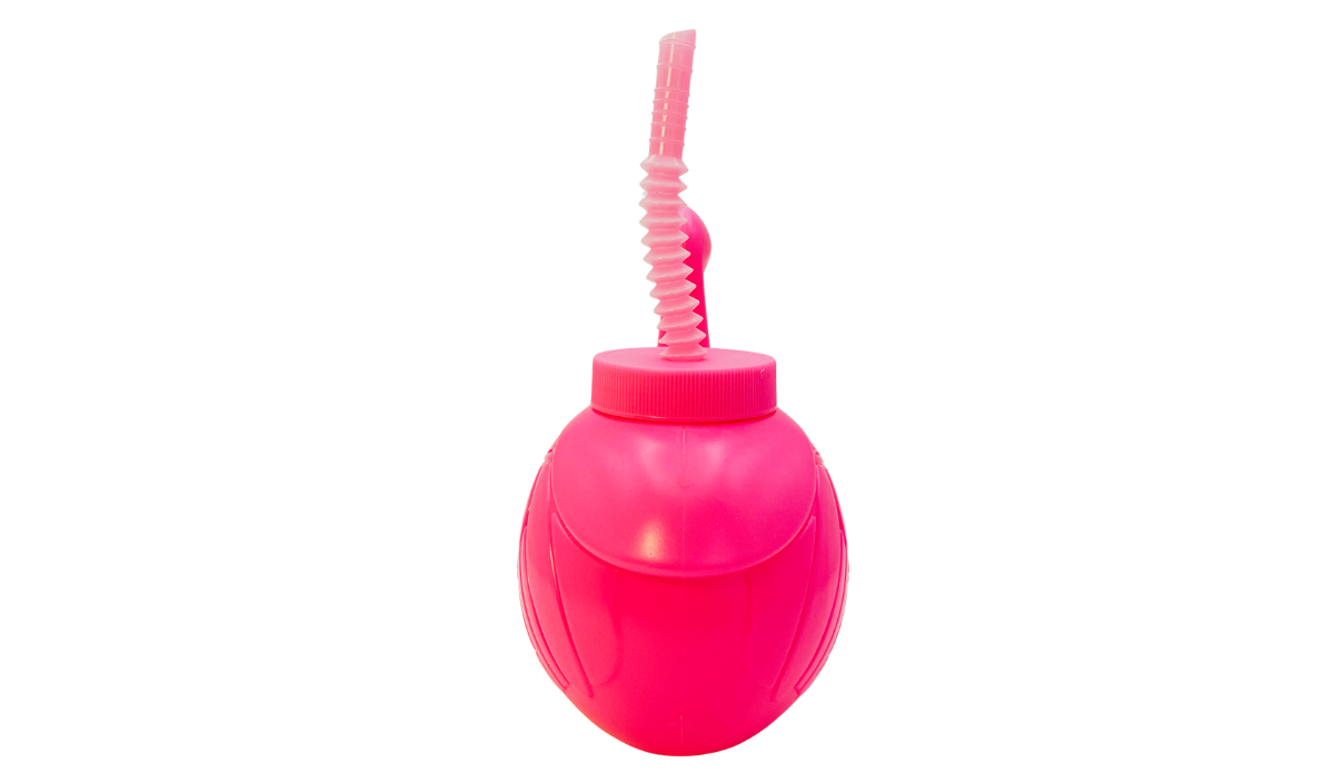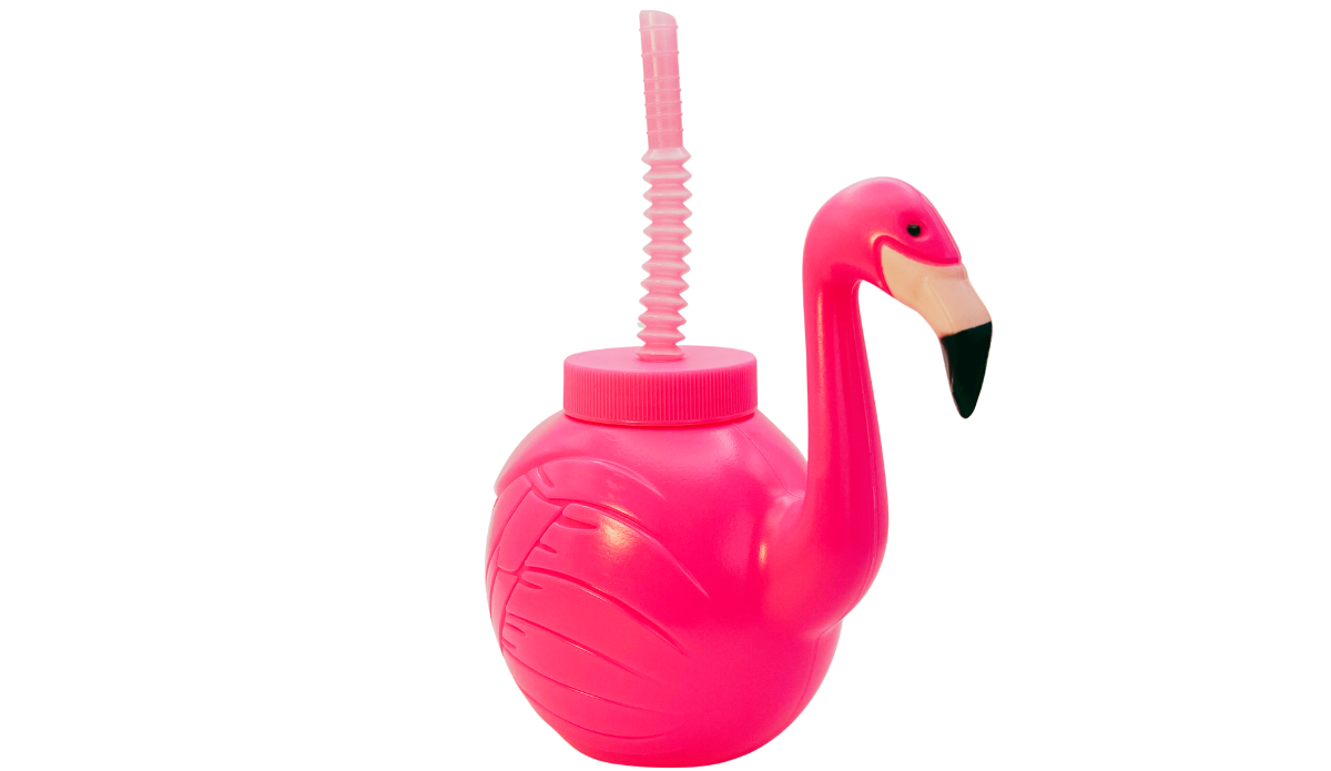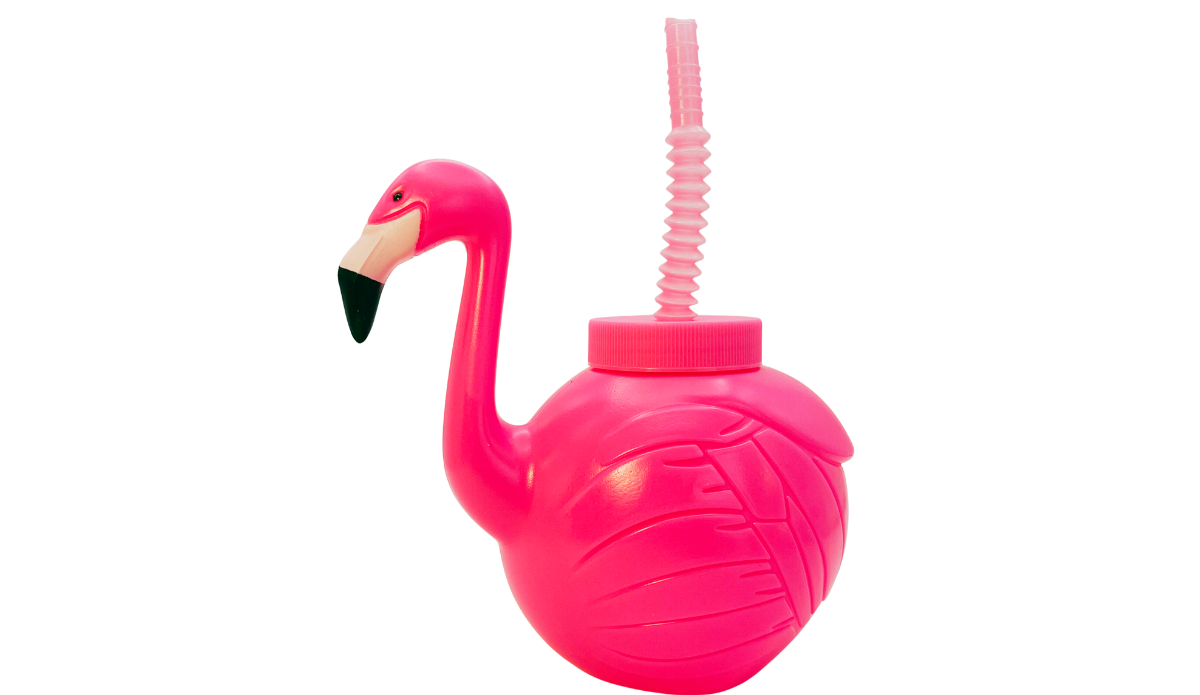 This tumbler features a bold flamingo-shaped body with a built-in screw-top lid and reusable straw.