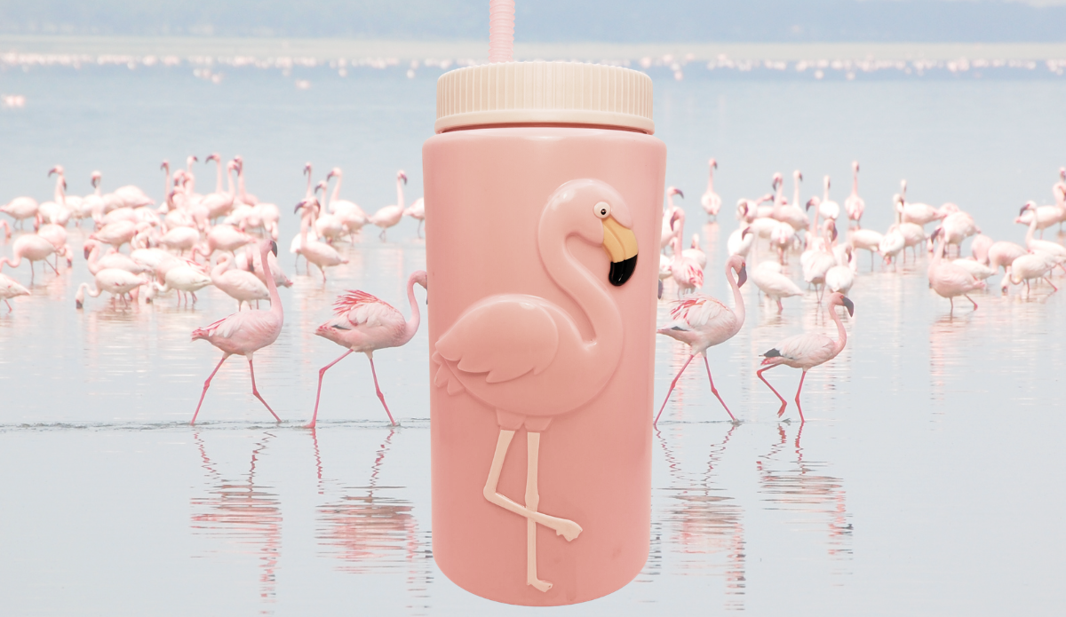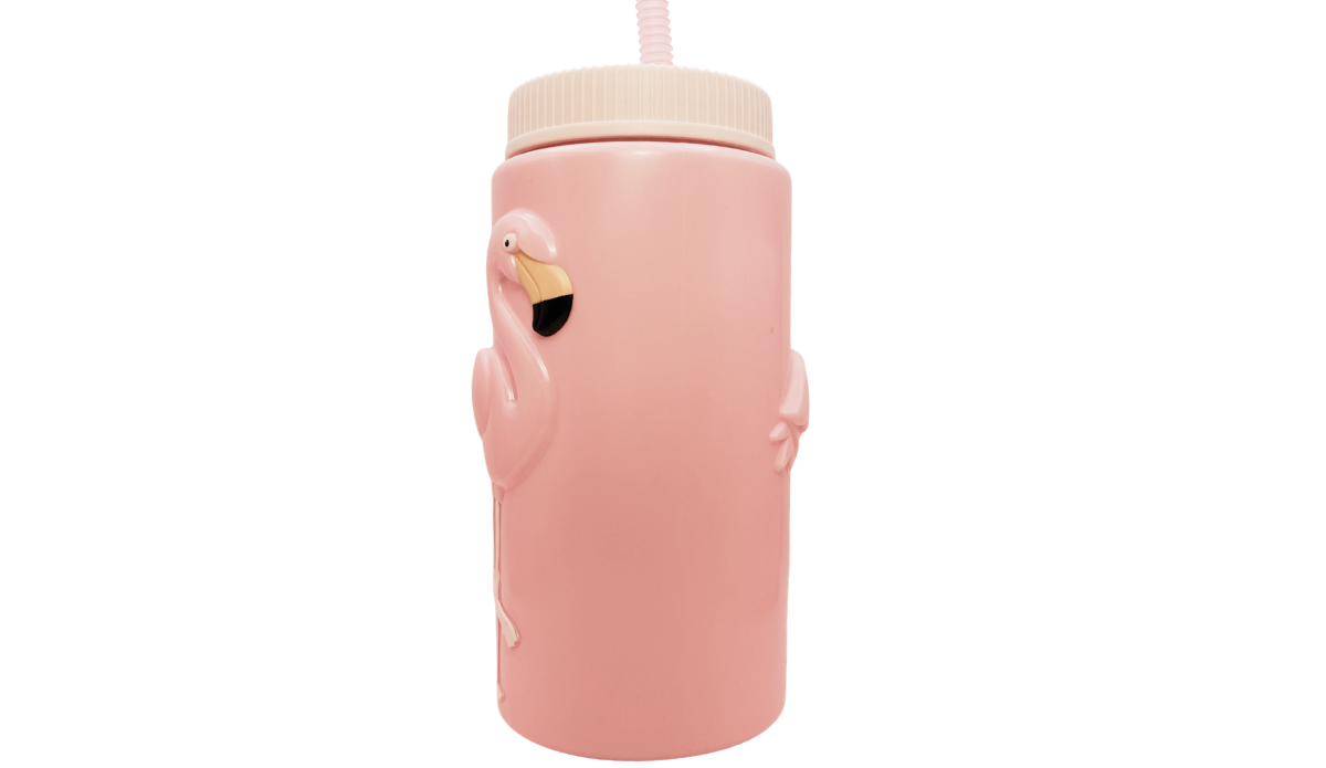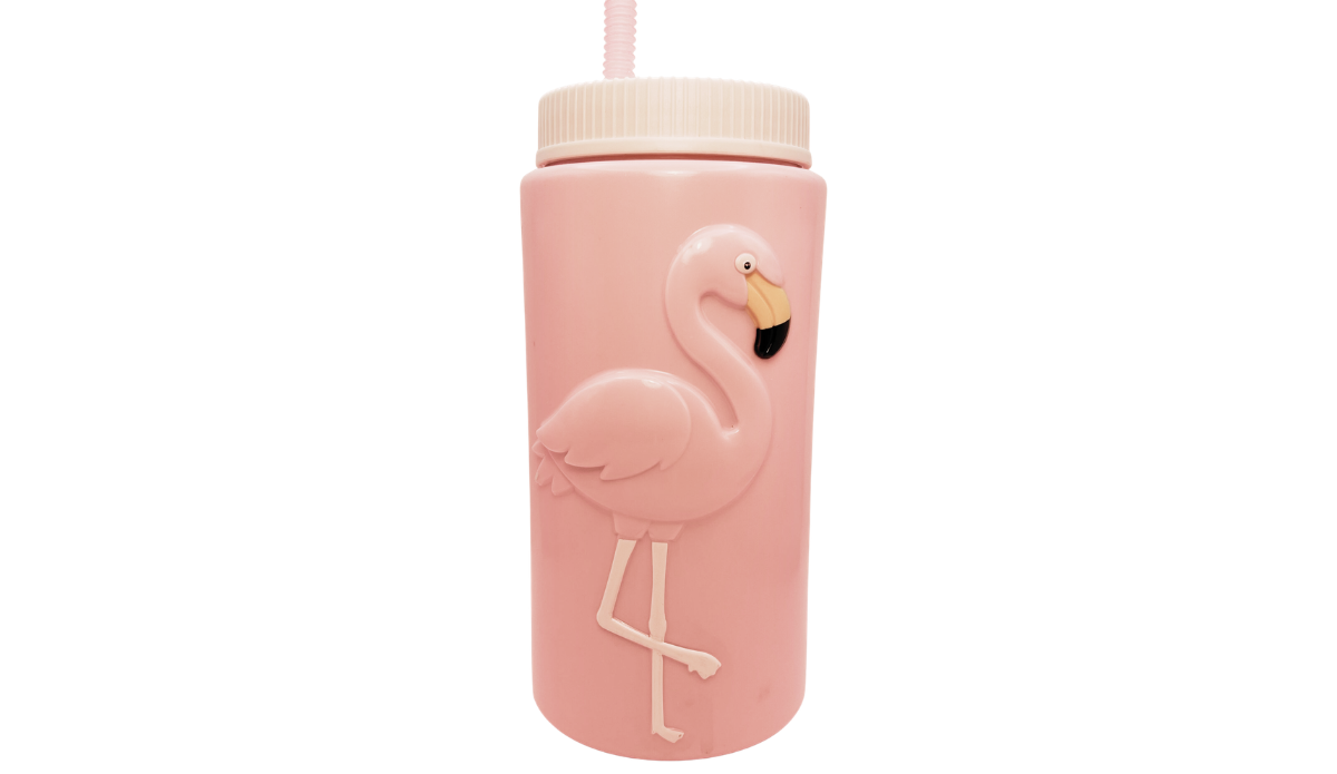 This bottle features a tall, cylindrical shape with a soft pink finish. The raised flamingo design is the focal point from the very first glance.