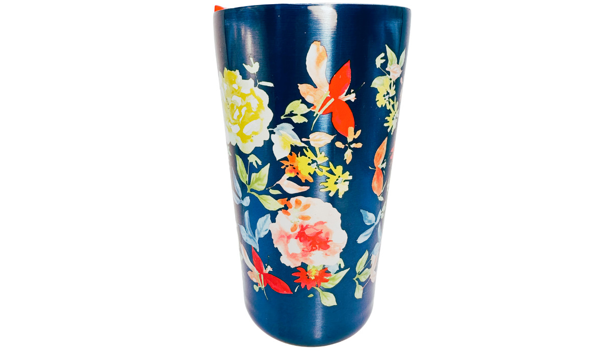 This Pioneer Woman Floral Stainless Steel Tumbler features a metallic blue stainless steel body with a full wrap-around floral design and a sleek tapered silhouette.