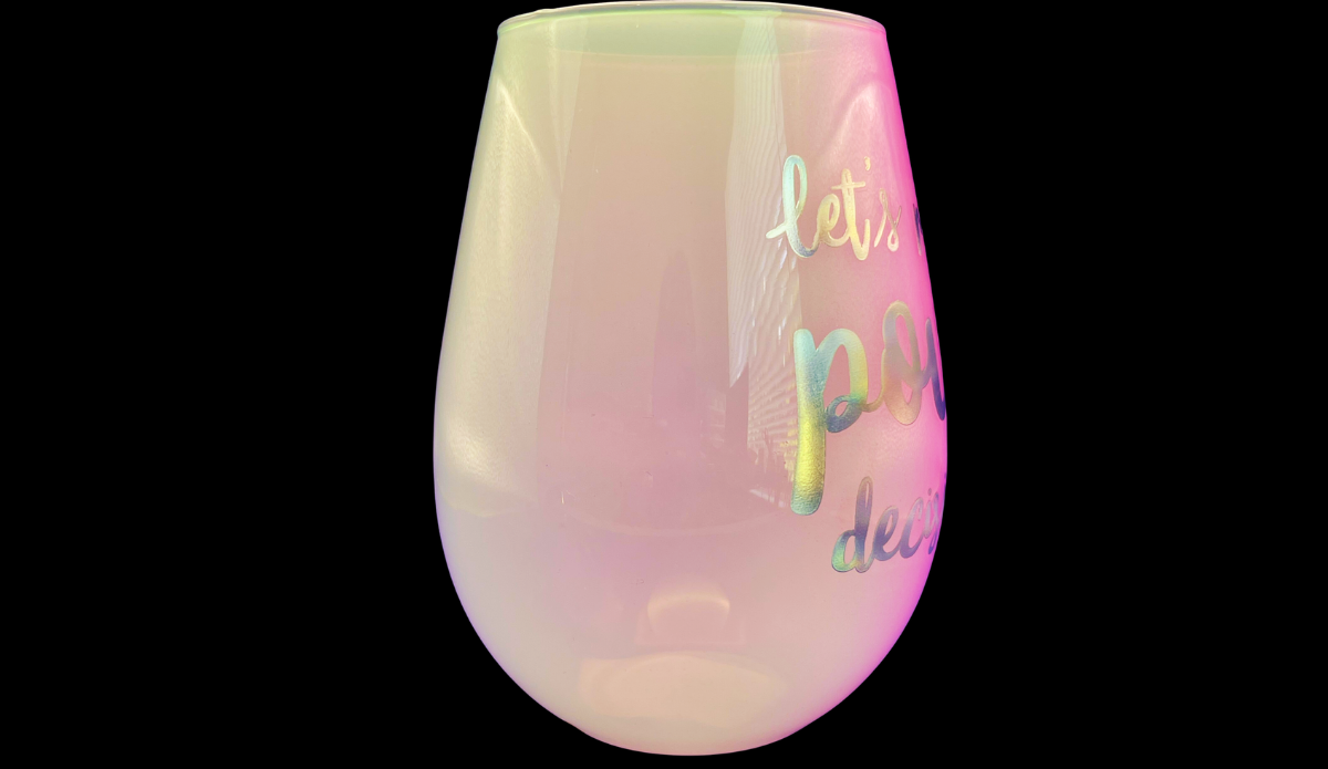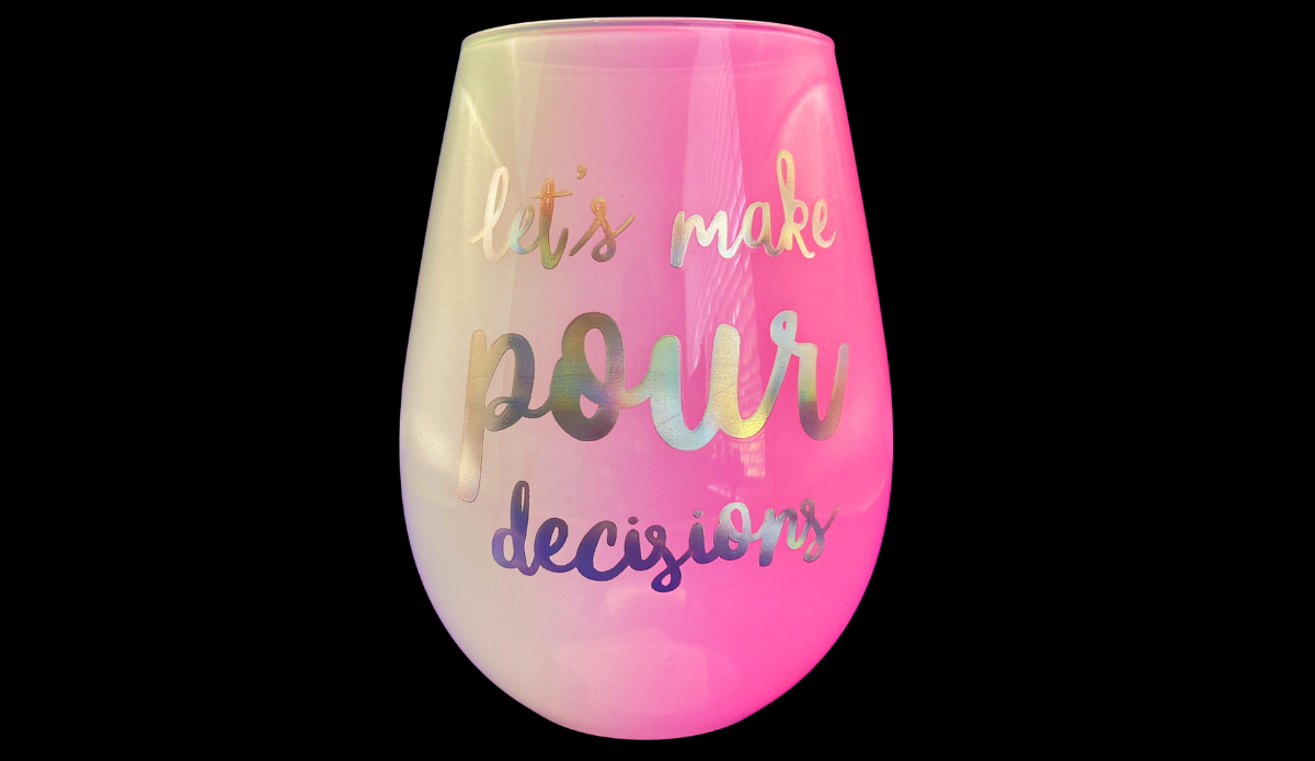 This stemless wine glass features a pink ombré finish that fades from soft blush to vibrant pink. On the front, the Let’s Make Pour Decisions Wine Glass displays holographic lettering that reflects light beautifully. Meanwhile, the smooth curved shape supports a comfortable grip.