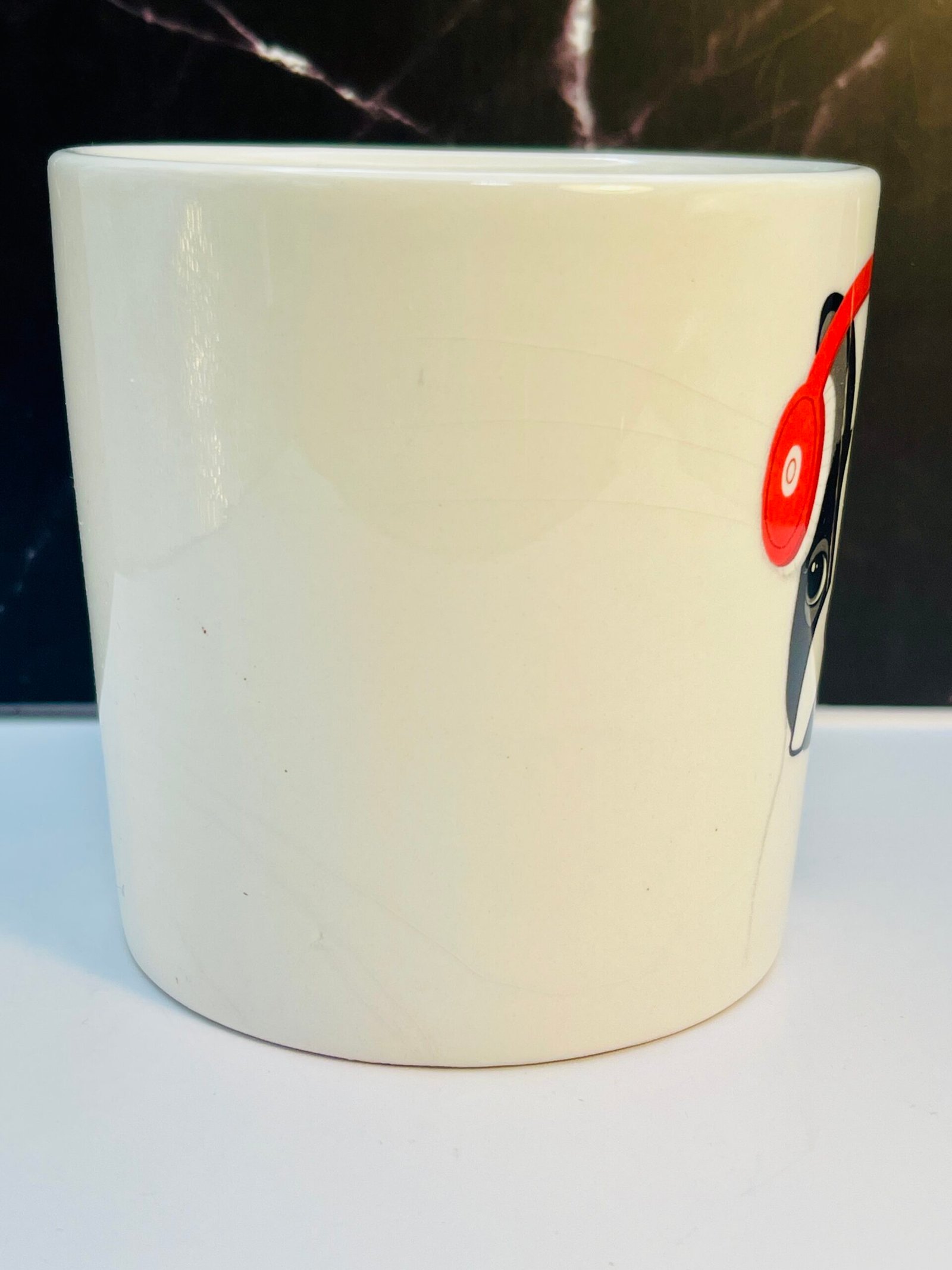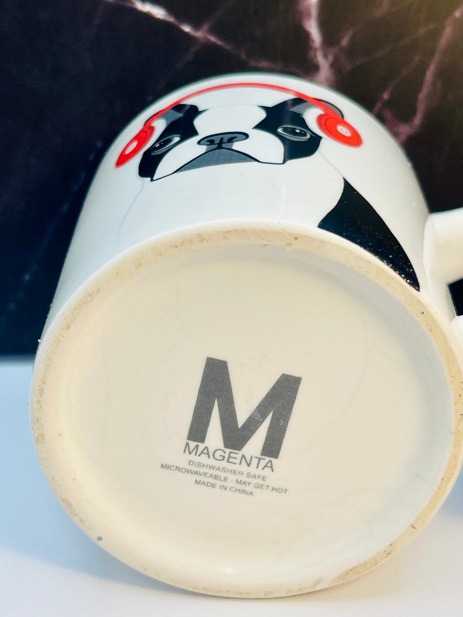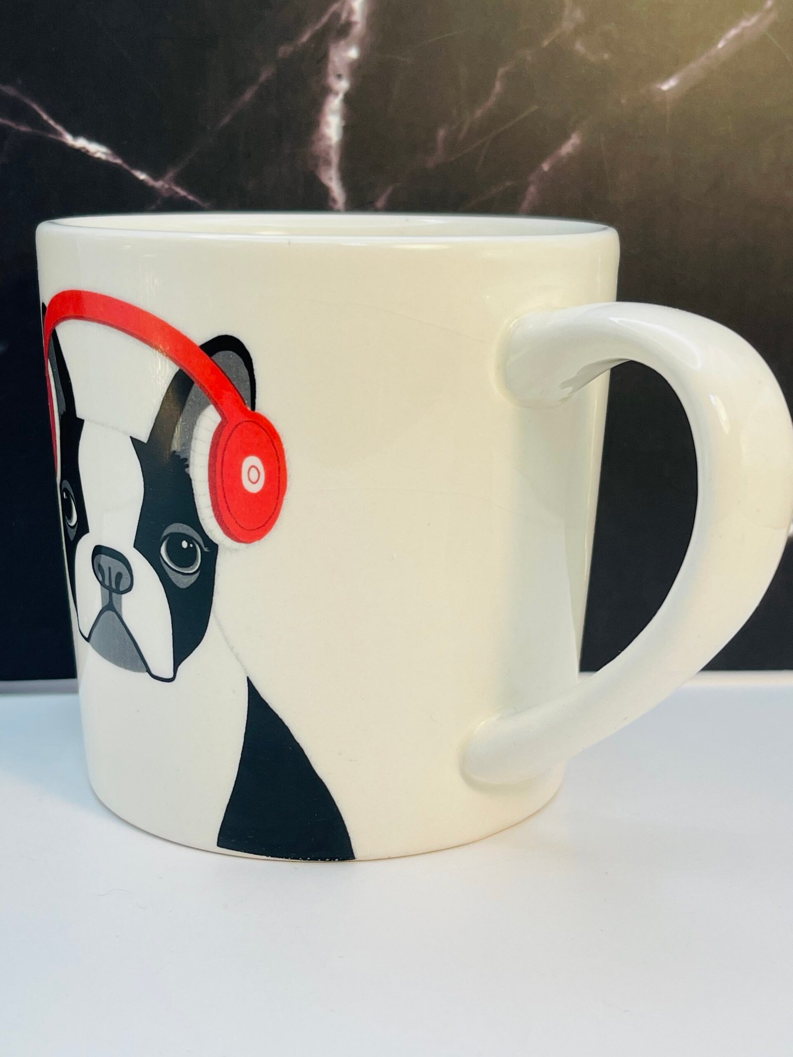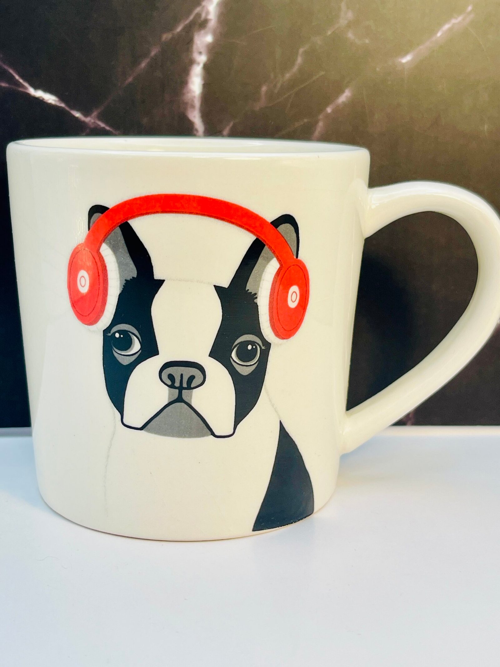 Indeed this is from Rae Dunn’s whimsical and ever-loved designs, this porcelain mug instantly steals the spotlight with a Boston Terrier (or French Bulldog) sporting bright red headphones.