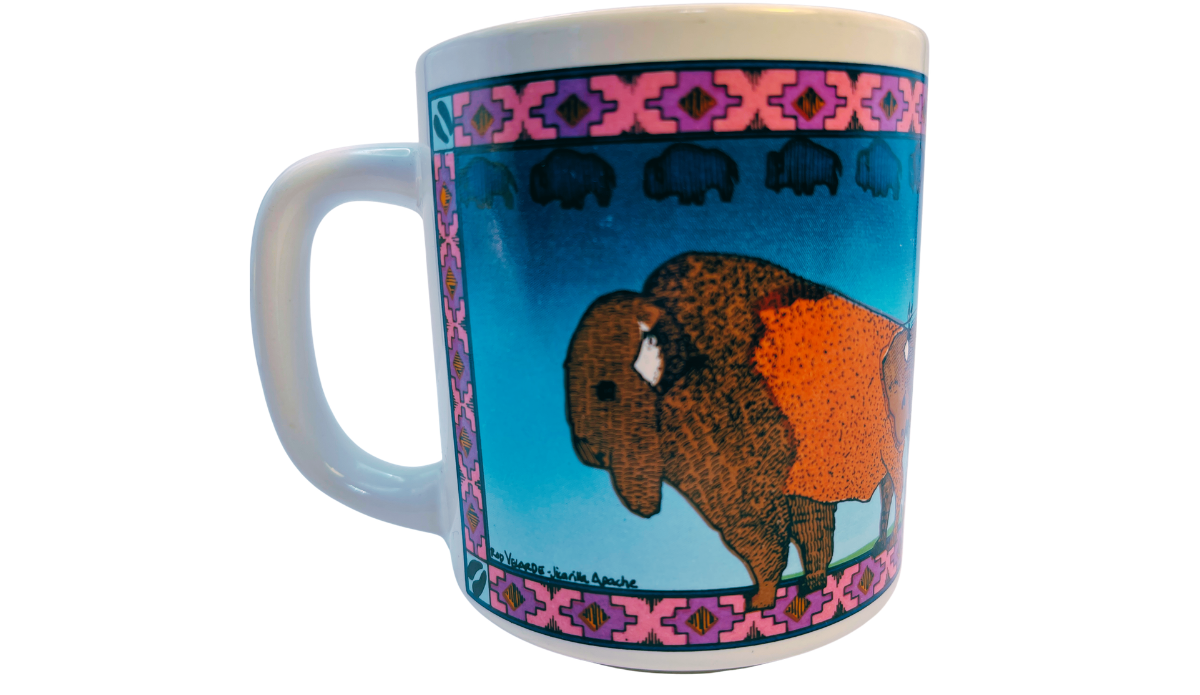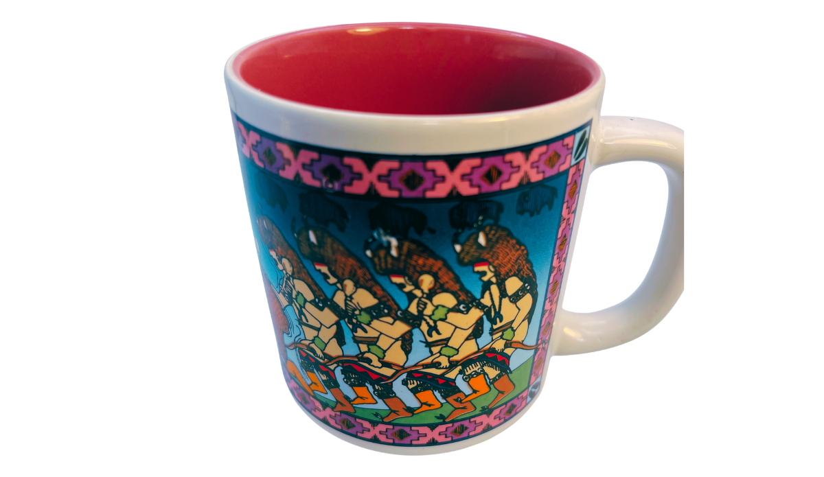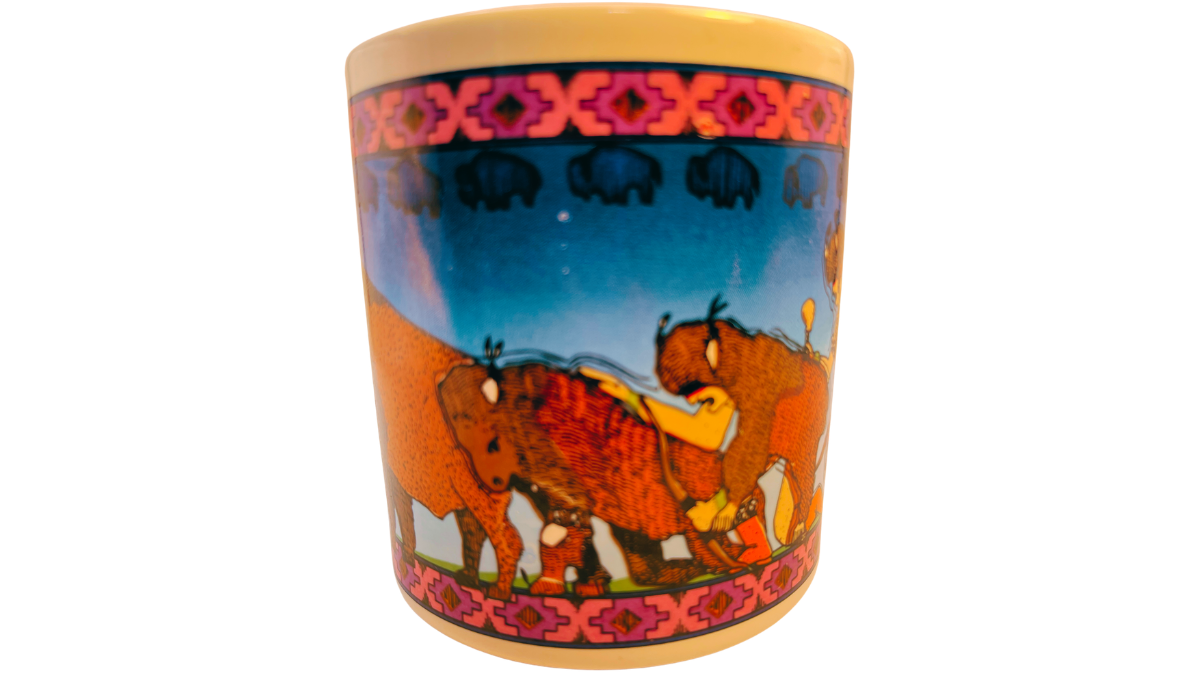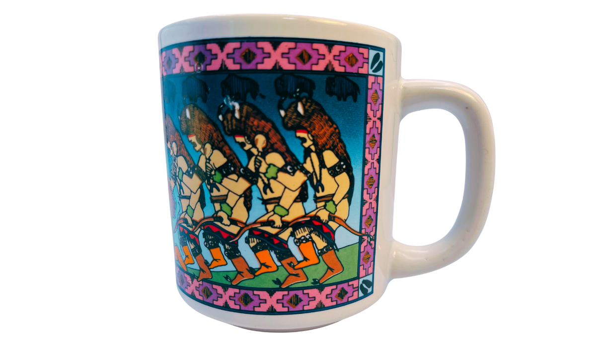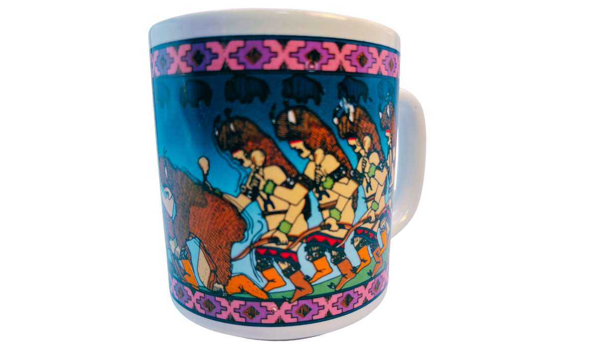 The design shows a ceremonial dance scene with strong motion and rhythm. Meanwhile, the buffalo imagery adds cultural symbolism and grounding. Therefore, the mug feels both expressive and rooted in tradition. Because of that balance, it stands out as more than just drinkware.